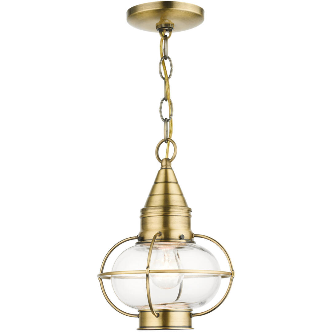 The Newburyport outdoor medium single-light pendant lantern boasts classic nautical and railway styling. This piece features a beautiful hand-blown clear glass globe and an antique brass finish over the hand crafted solid brass construction. With its easy installation and low upkeep requirements, this light will not disappoint.