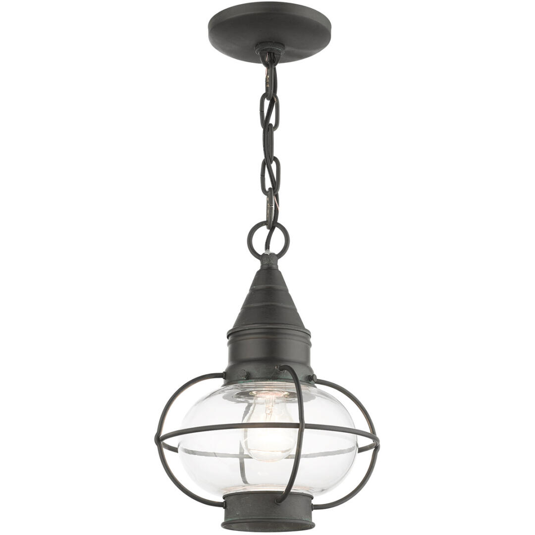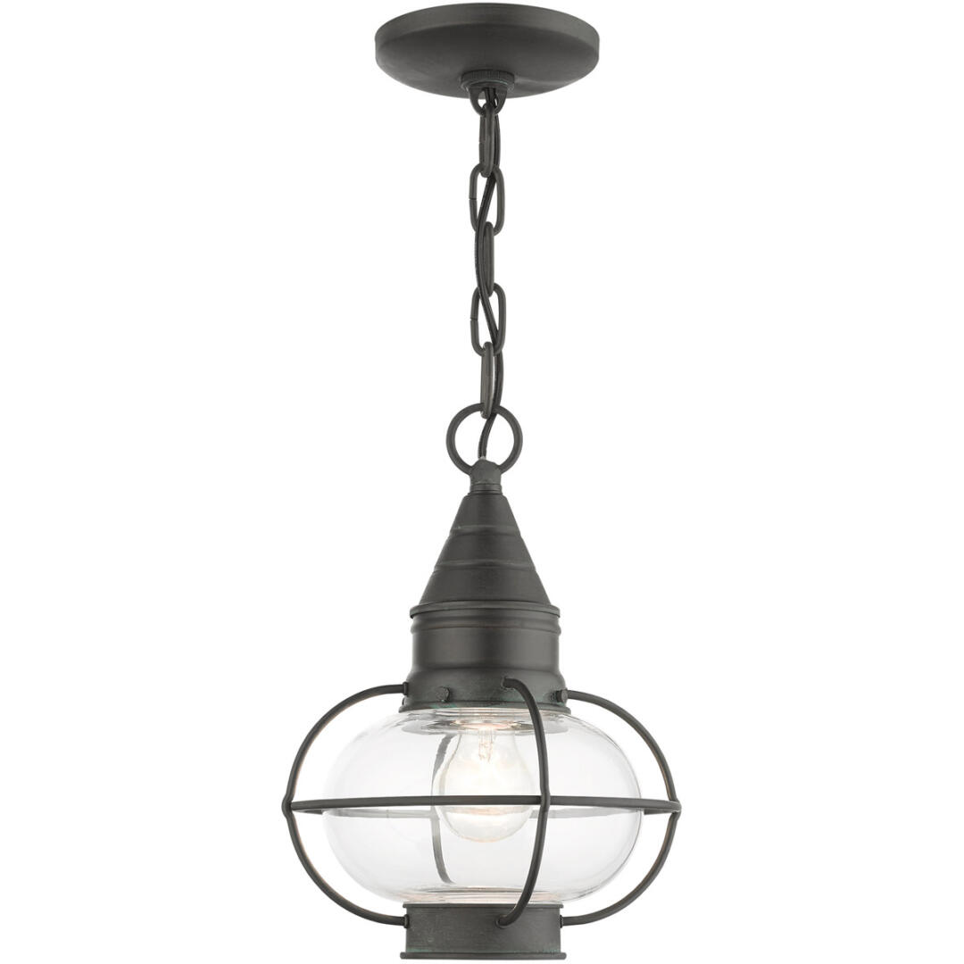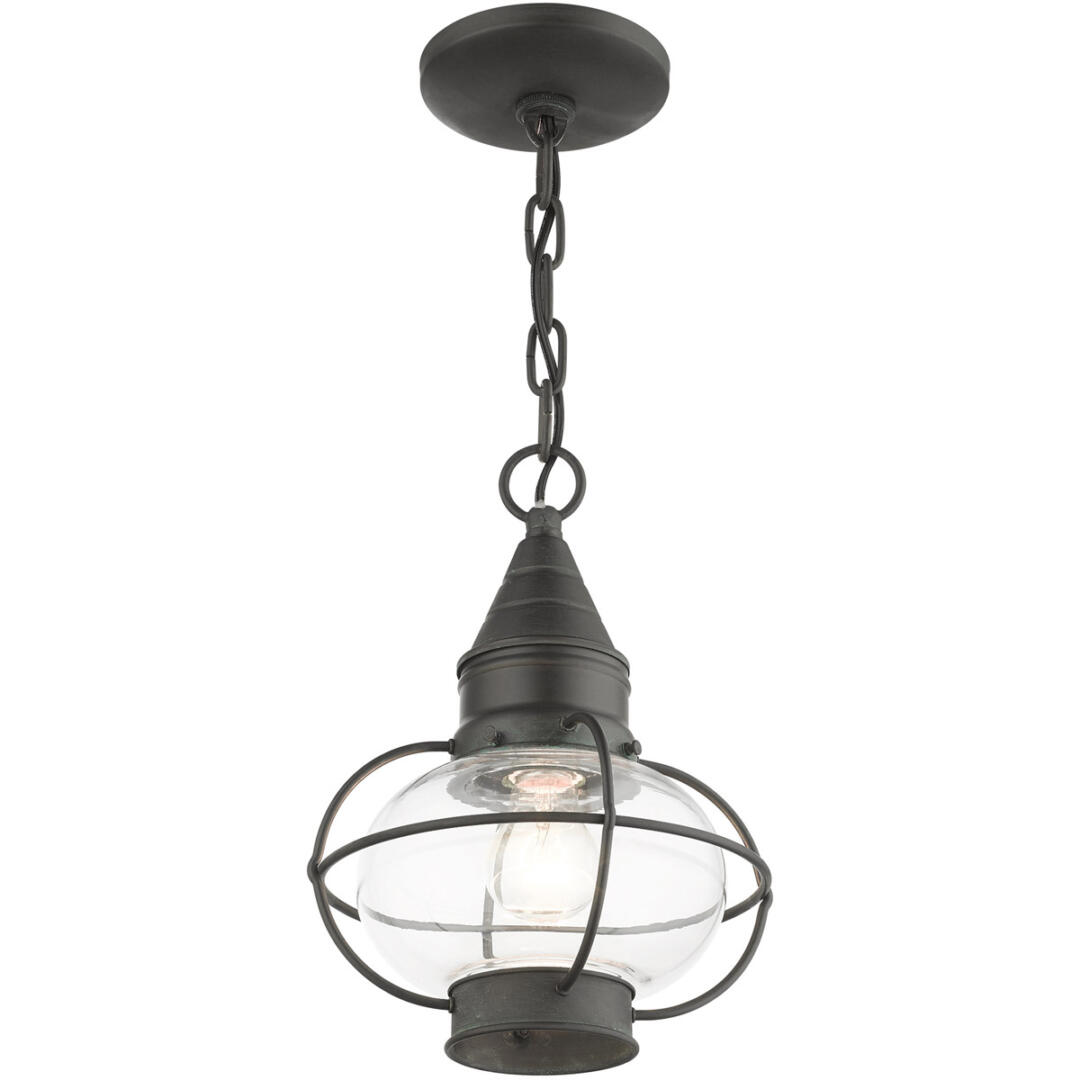 The Newburyport outdoor medium single-light pendant lantern boasts classic nautical and railway styling. This piece features a beautiful hand-blown clear glass globe and a charcoal finish over the hand crafted solid brass construction. With its easy installation and low upkeep requirements, this light will not disappoint.