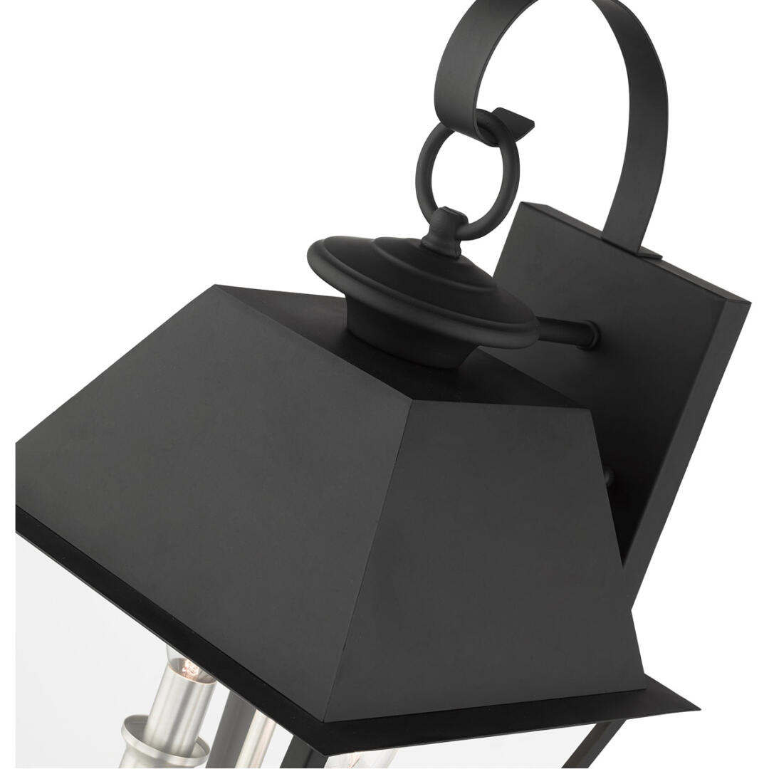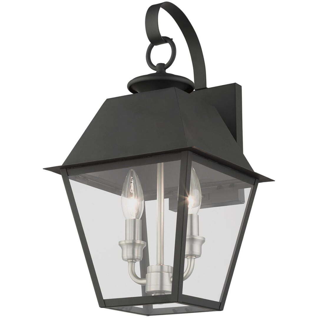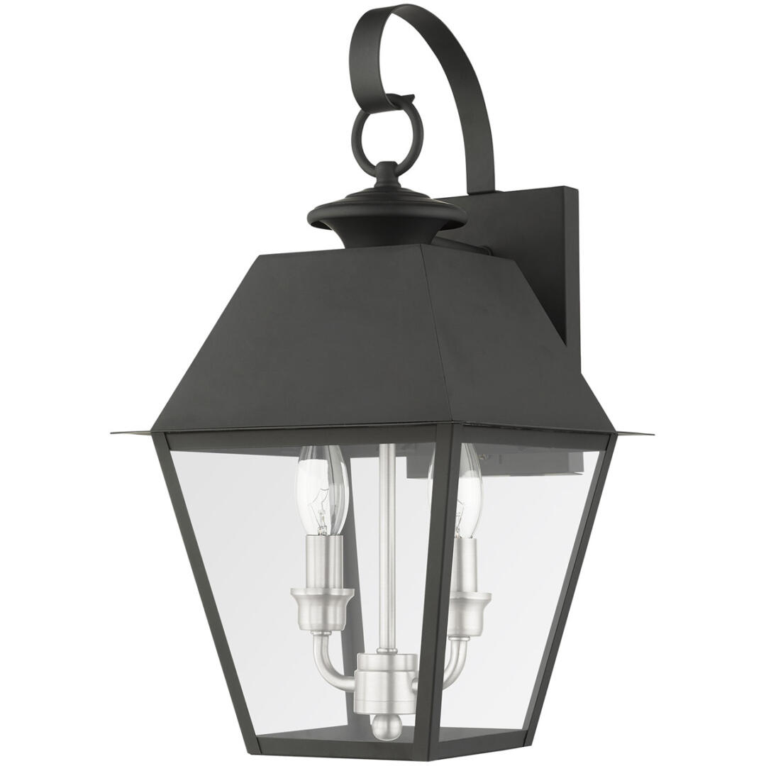 With its appealing black finish and clear glass, the stunning Wentworth collection will make an elegant addition to any outdoor space. Formed from solid brass & traditionally inspired, this downward hanging two-light outdoor medium wall lantern is perfect for a driveway, back porch or entry way. With superb craftsmanship and affordable price, this fixture is sure to be a timeless addition to your home.