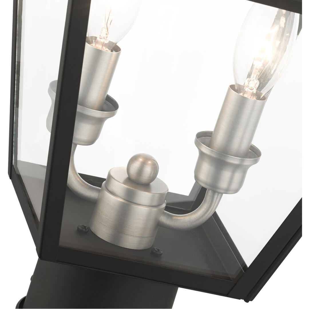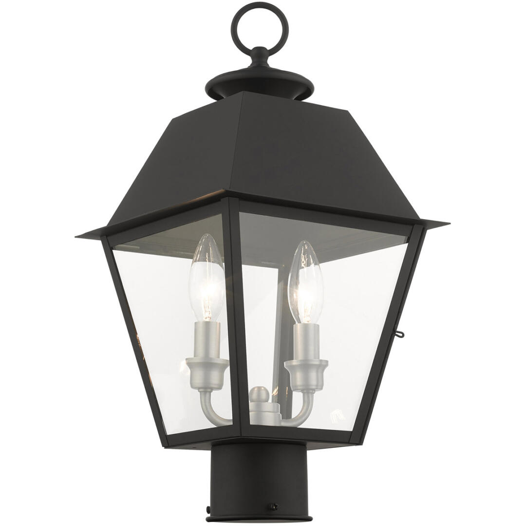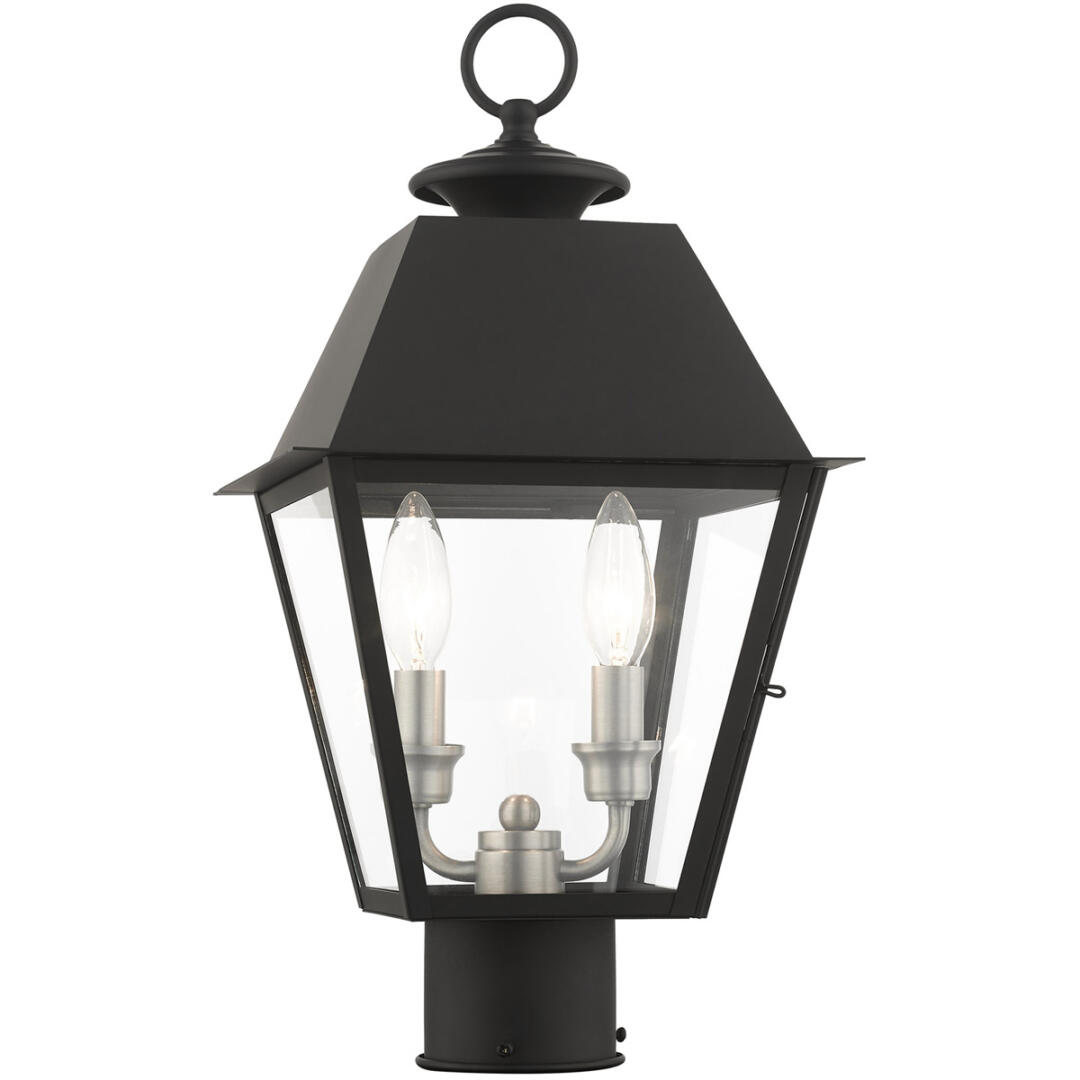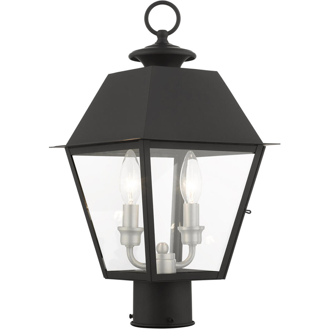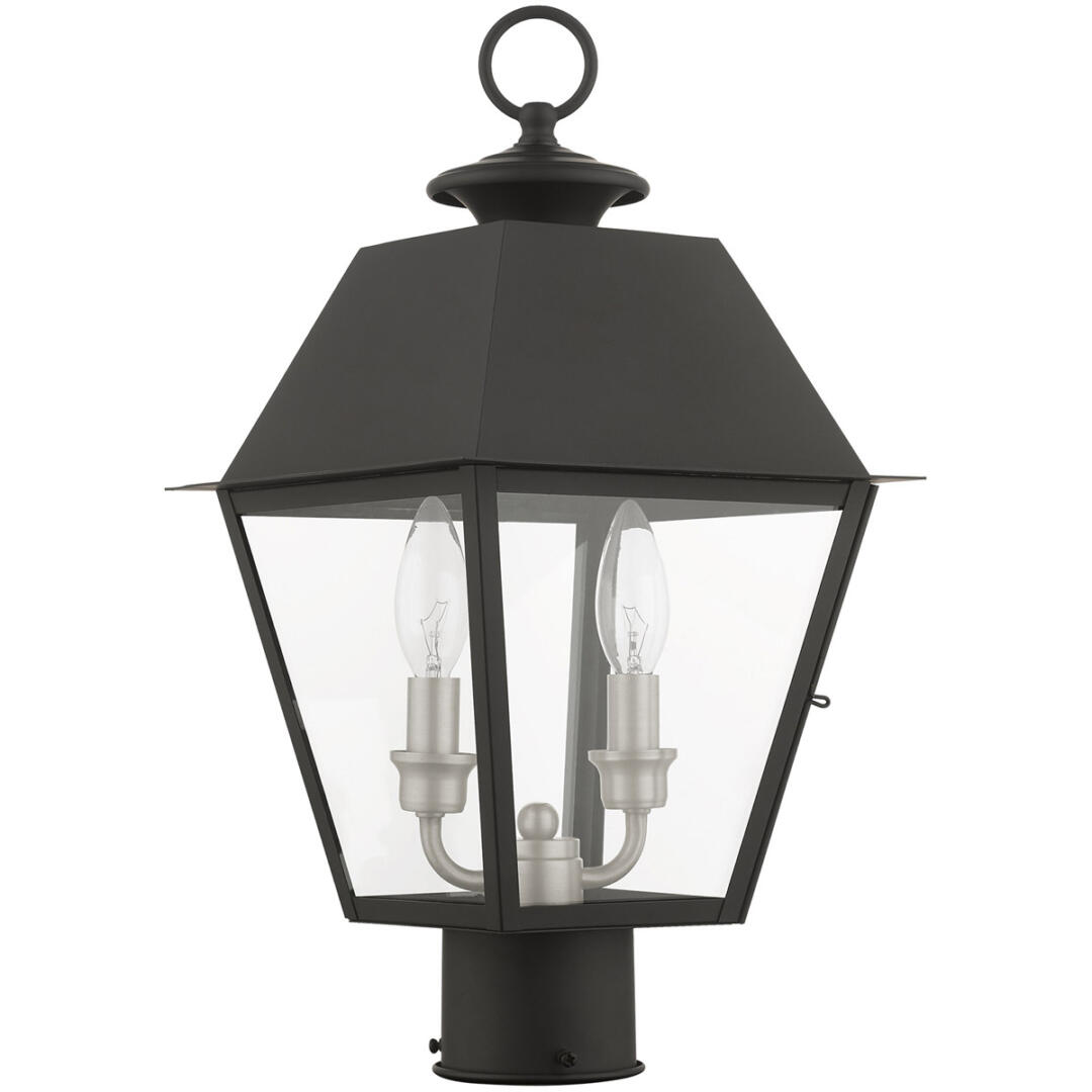 With its appealing black finish and clear glass, the stunning Wentworth collection will make an elegant addition to any outdoor space. Formed from solid brass & traditionally inspired, this two-light outdoor medium post top lantern is complimentary to almost any home exterior. Combining superb craftsmanship and affordable price, this fixture is sure to be a timeless addition to your home.