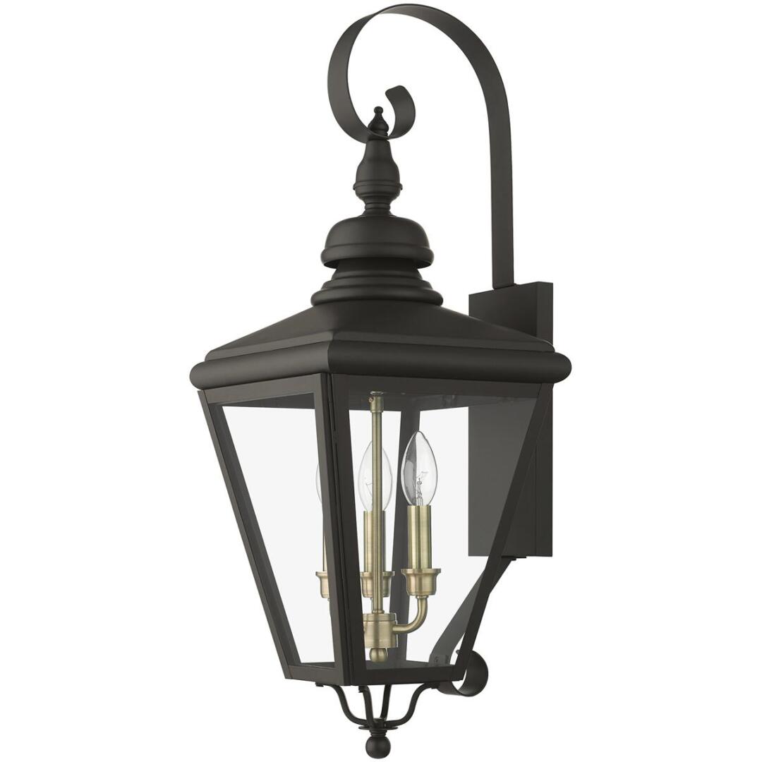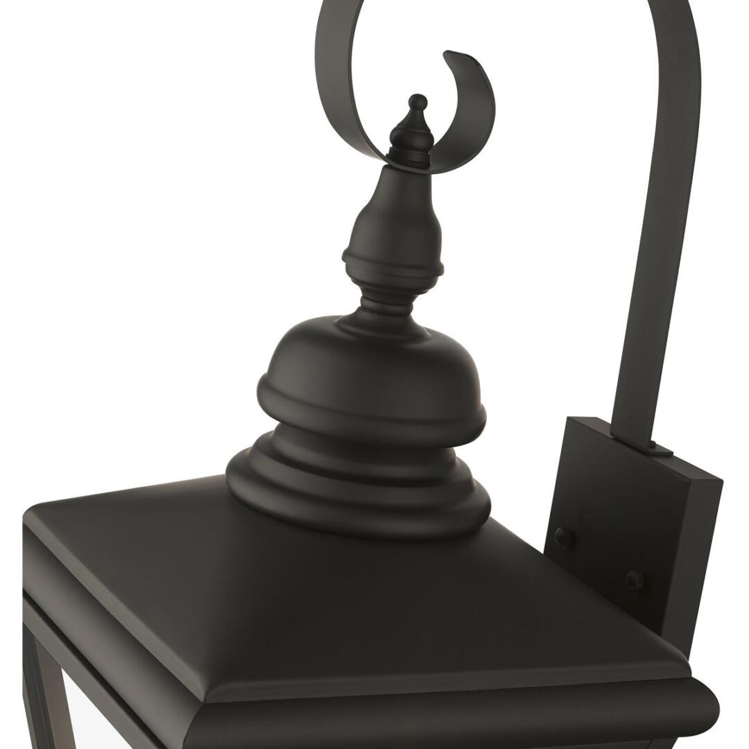The stylish bronze finish outdoor Adams large wall lantern is a great way to update your home’s exterior decor. A flat metal curved arm attaches the solid brass decorative housing to the square backplate while clear glass shows off the antique brass finish cluster.