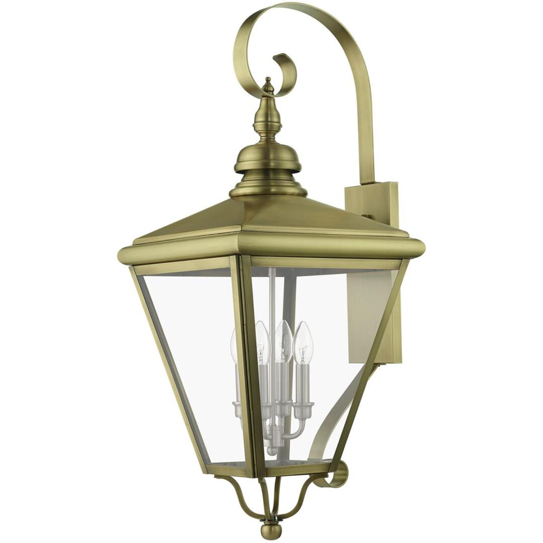 The stylish antique brass finish outdoor Adams extra large wall lantern is a great way to update your home’s exterior decor. A flat metal curved arm attaches the solid brass decorative housing to the square backplate while clear glass shows off the brushed nickel finish cluster.
