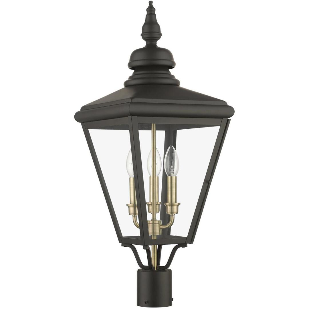 The stylish bronze finish outdoor Adams large post top lantern is a great way to update your home’s exterior decor. Flat metal curved arms attach to the solid brass decorative housing while clear glass shows off the antique brass finish cluster.