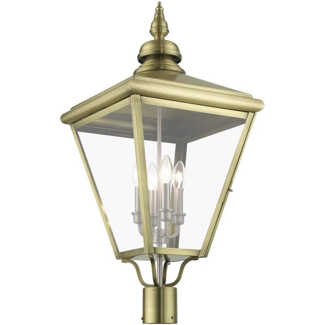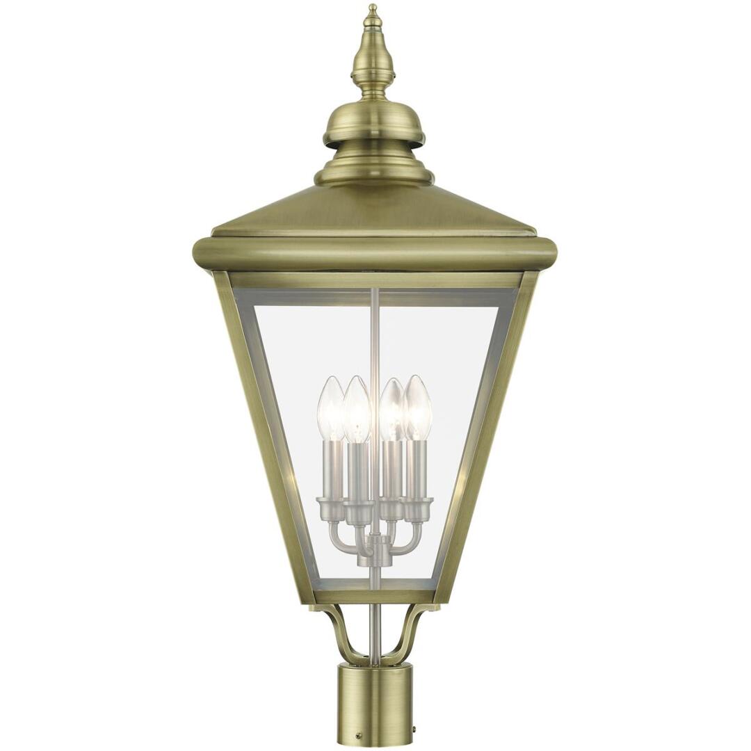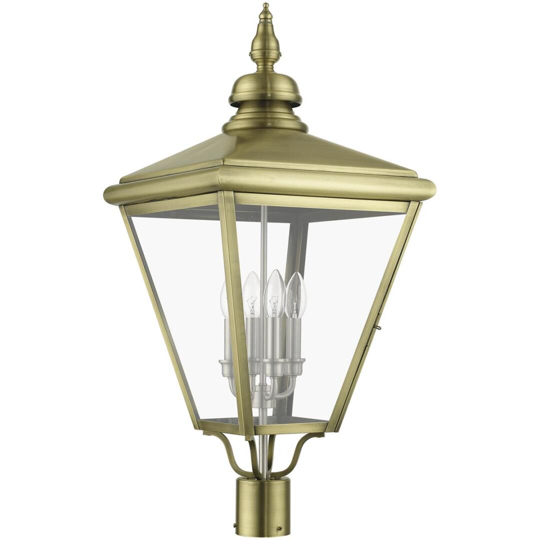 The stylish antique brass finish outdoor Adams extra large post top lantern is a great way to update your home’s exterior decor. Flat metal curved arms attach to the solid brass decorative housing while clear glass shows off the brushed nickel finish cluster.