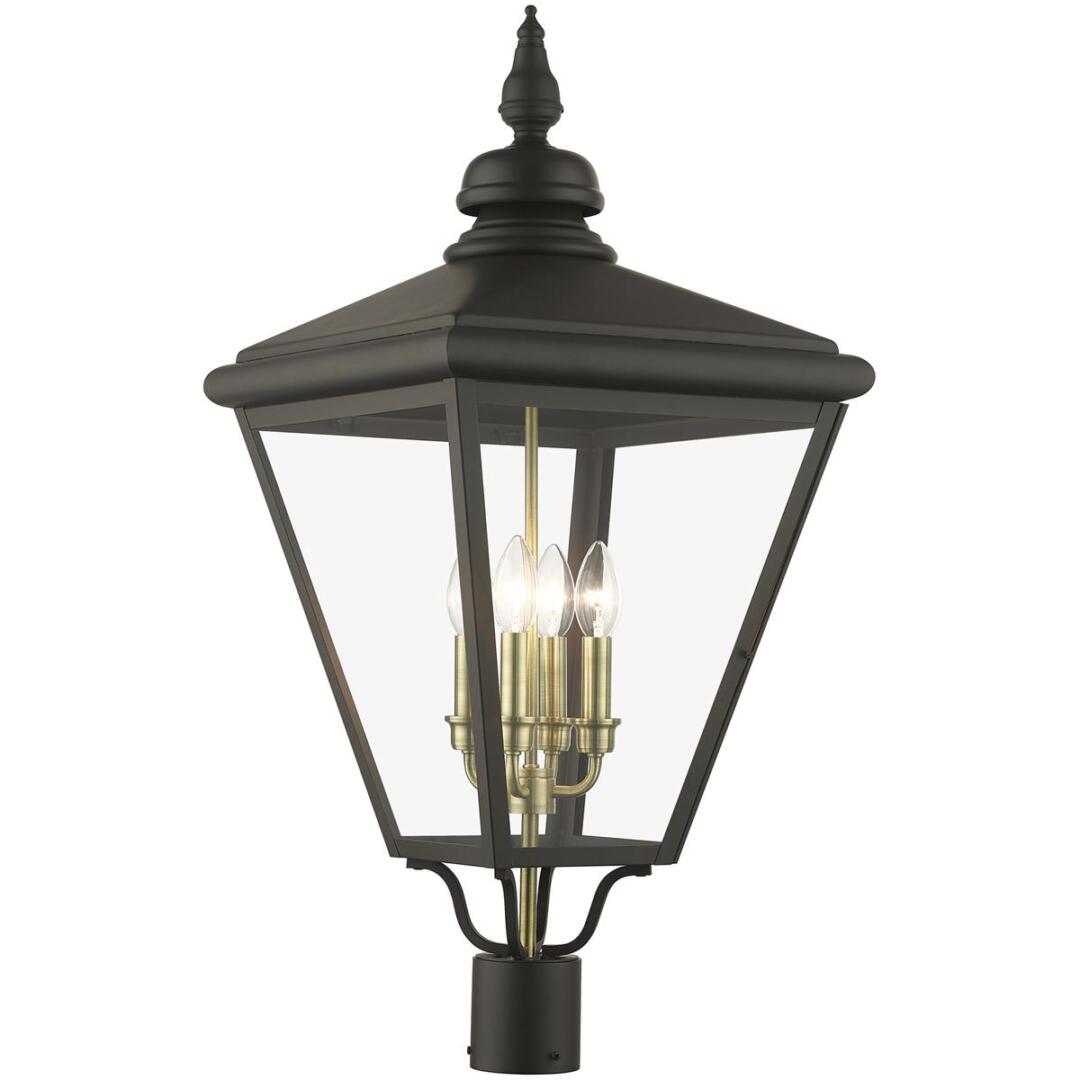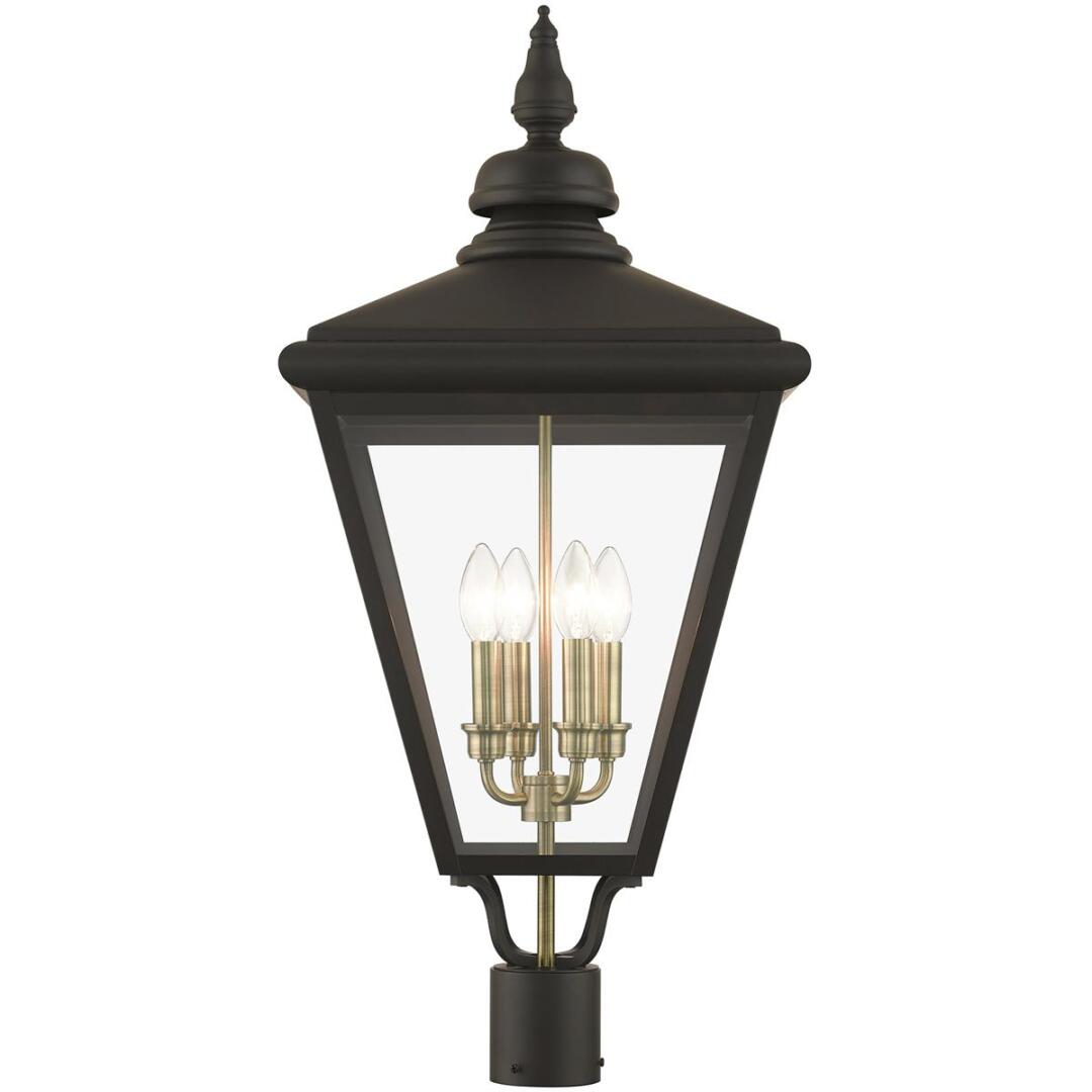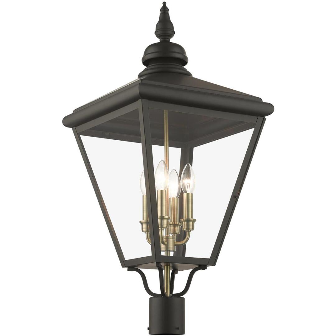 The stylish bronze finish outdoor Adams extra large post top lantern is a great way to update your home’s exterior decor. Flat metal curved arms attach to the solid brass decorative housing while clear glass shows off the antique brass finish cluster.