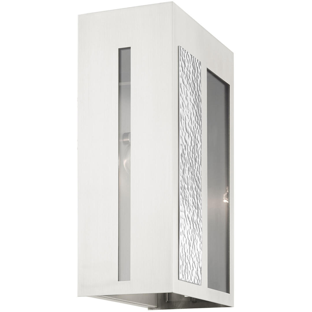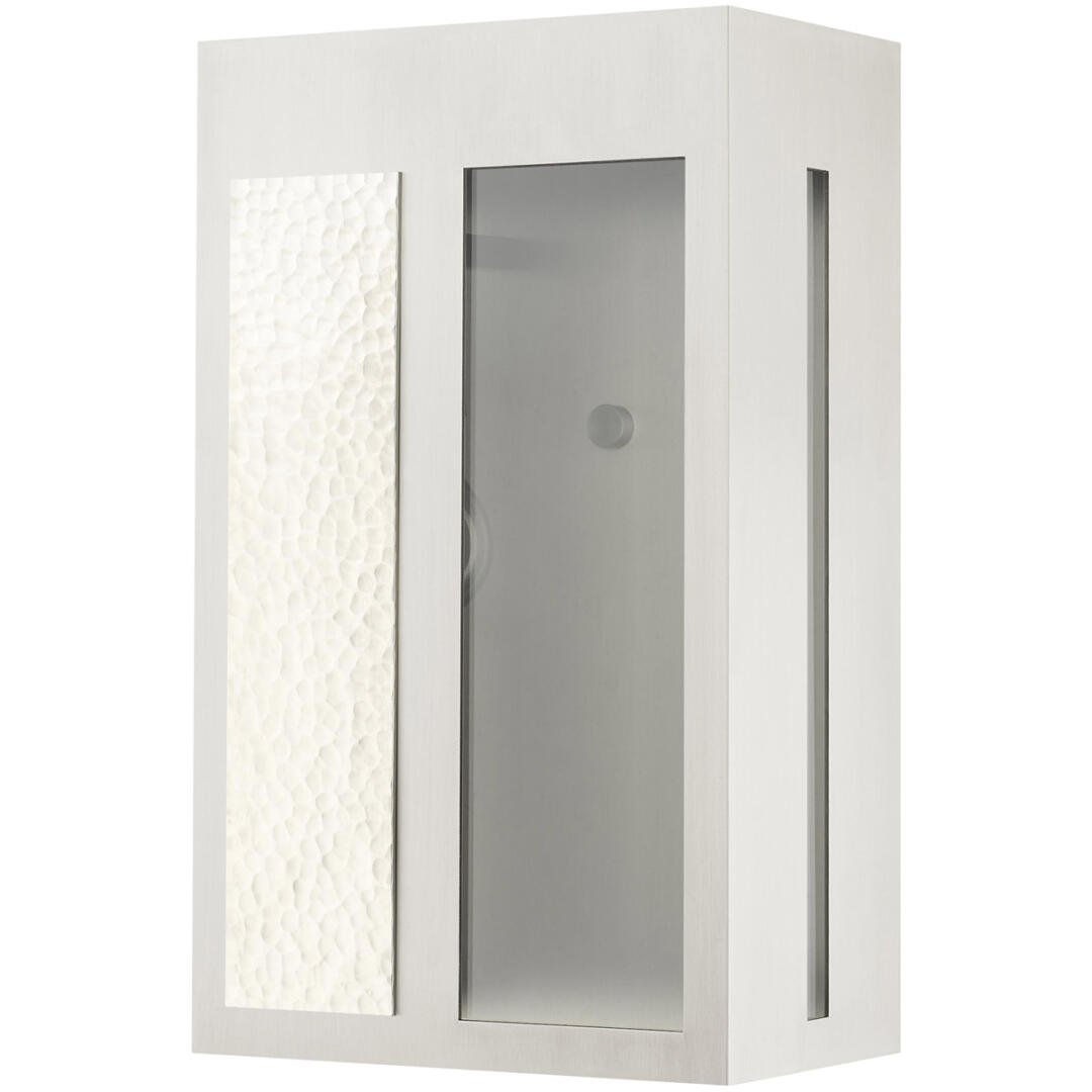 Looking for something modern and fresh for your home exterior? The Lafayette collection will meet and exceed your expectations. It is adorned with exceptional and sophisticated details such as hammered polished nickel panels set in a brushed nickel finish fixture frame and clear glass. This large one-light wall lantern creates a stylish and unique appearance. Its streamlined hand crafted solid brass frame construction will complement almost any modern or contemporary luxurious home exterior.