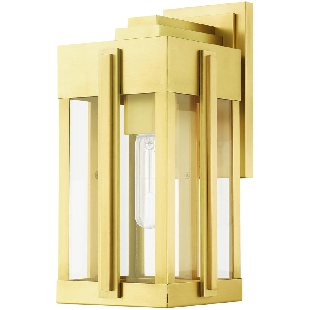 The outdoor Lexington collection is both majestic and grand which reflects the geometric lines and elegant charm of Art Deco style. The natural brass finish, clear glass and hand crafted solid brass frame make this series a luxurious statement for an upscale transitional or contemporary home exterior. The single-light small sized wall lantern’s square light accent gently illuminates the refined details of this sophisticated piece.