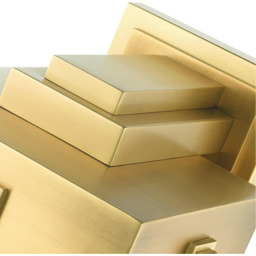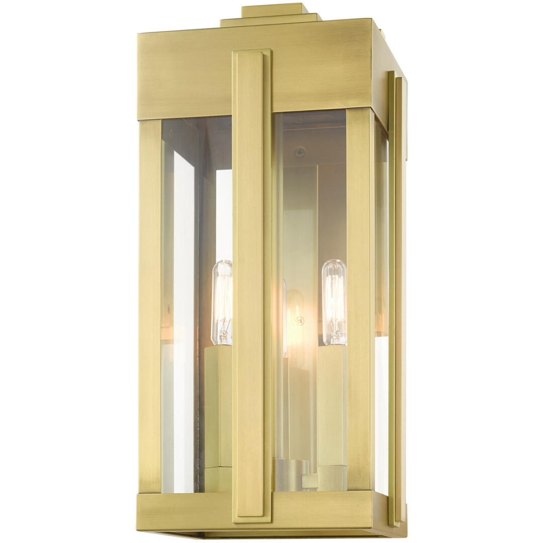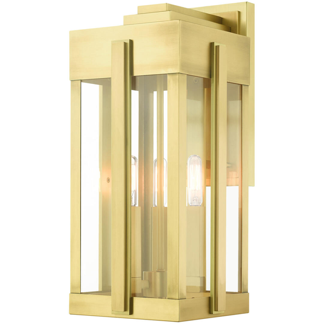 The outdoor Lexington collection is both majestic and grand which reflects the geometric lines and elegant charm of Art Deco style. The natural brass finish, clear glass and hand crafted solid brass frame make this series a luxurious statement for an upscale transitional or contemporary home exterior. The three-light medium sized wall lantern features square candles that gently illuminate the refined details of this sophisticated piece.