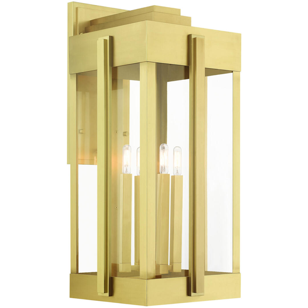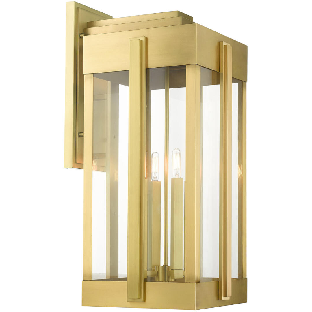 The outdoor Lexington collection is both majestic and grand which reflects the geometric lines and elegant charm of Art Deco style. The natural brass finish, clear glass and hand crafted solid brass frame make this series a luxurious statement for an upscale transitional or contemporary home exterior. The four-light extra-large sized wall lantern features square candles that gently illuminate the refined details of this sophisticated piece.
