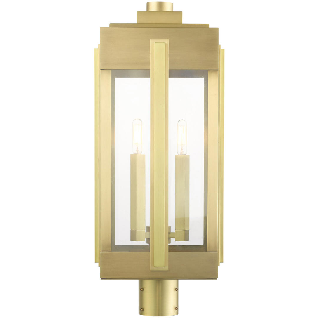 The outdoor Lexington collection is both majestic and grand which reflects the geometric lines and elegant charm of Art Deco style. The natural brass finish, clear glass and hand crafted solid brass frame make this series a luxurious statement for an upscale transitional or contemporary home exterior. The three-light large sized post top lantern features square candles that gently illuminate the refined details of this sophisticated piece.