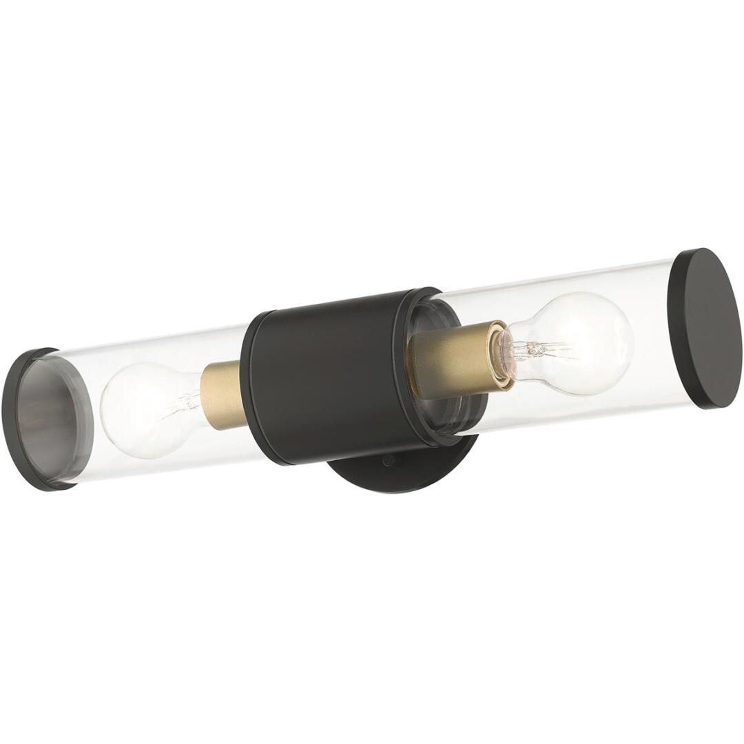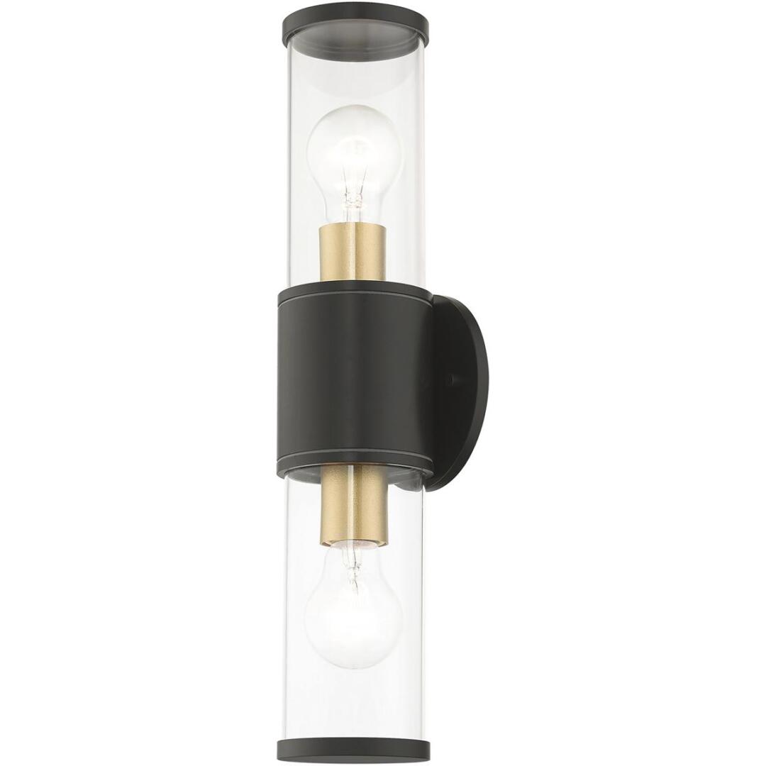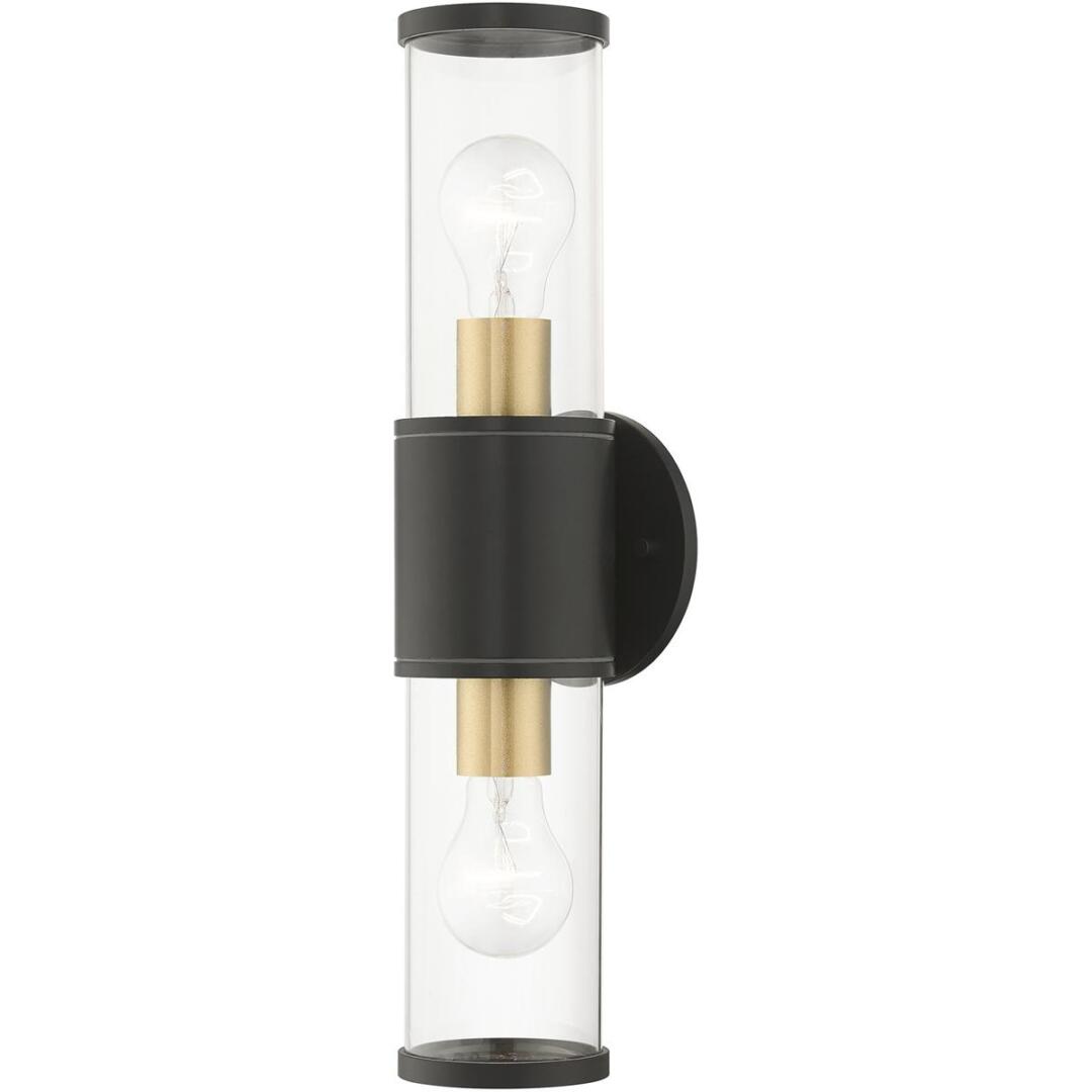 Add a dash of character and radiance to the exterior of your home with the Atlantic wall lantern. This two-light medium fixture features two clear glass cylinder closed top shades on either side, set off with a bronze finish with antique gold finish accents. The clean lines of the back plate complement the cylindrical glass shades adorned with detailed trim at the end of each glass creating a minimal, sleek look that works well in most outdoor or indoor settings. This fixture adds charm and contemporary aesthetics to your home.