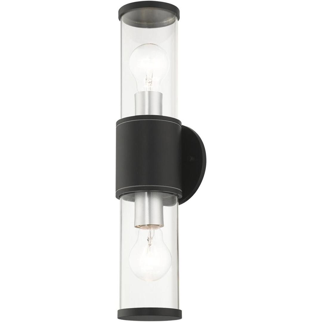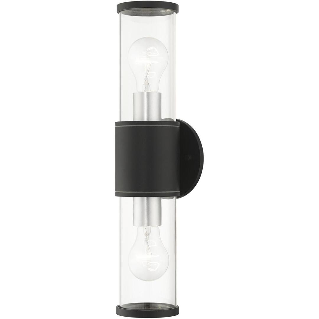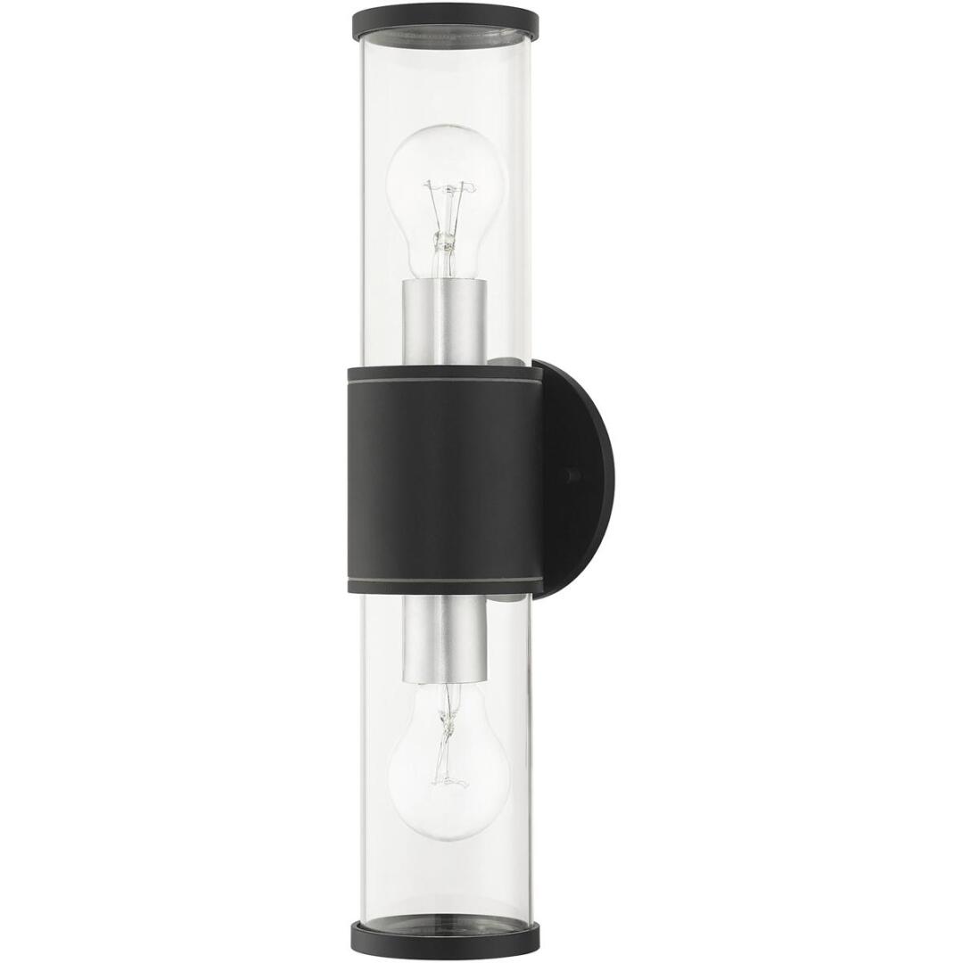 Add a dash of character and radiance to the exterior of your home with the Atlantic wall lantern. This two-light medium fixture features two clear glass cylinder closed top shades on either side, set off with a textured black finish with antique silver finish accents. The clean lines of the back plate complement the cylindrical glass shades adorned with detailed trim at the end of each glass creating a minimal, sleek look that works well in most outdoor or indoor settings. This fixture adds charm and contemporary aesthetics to your home.