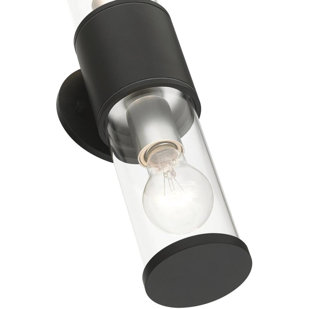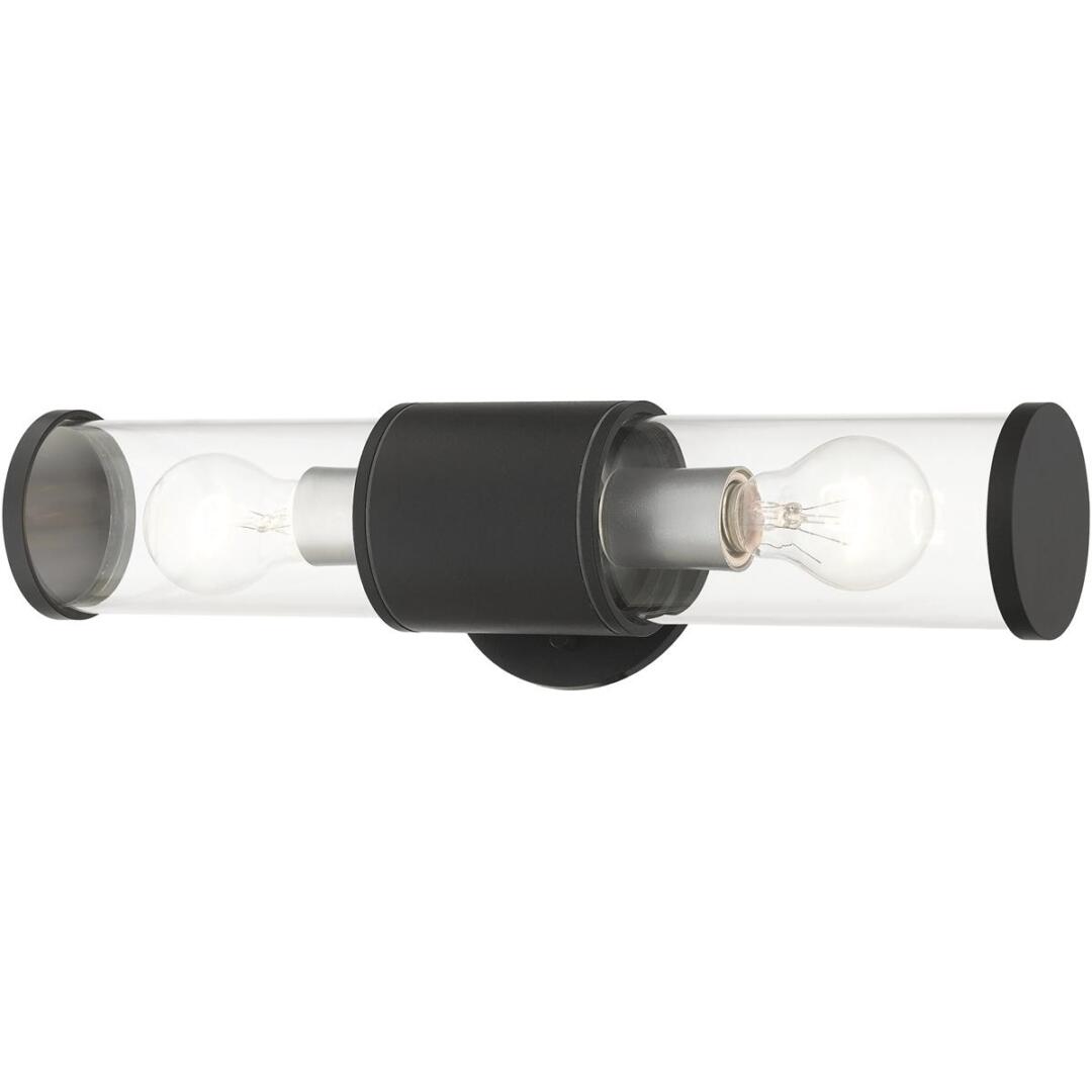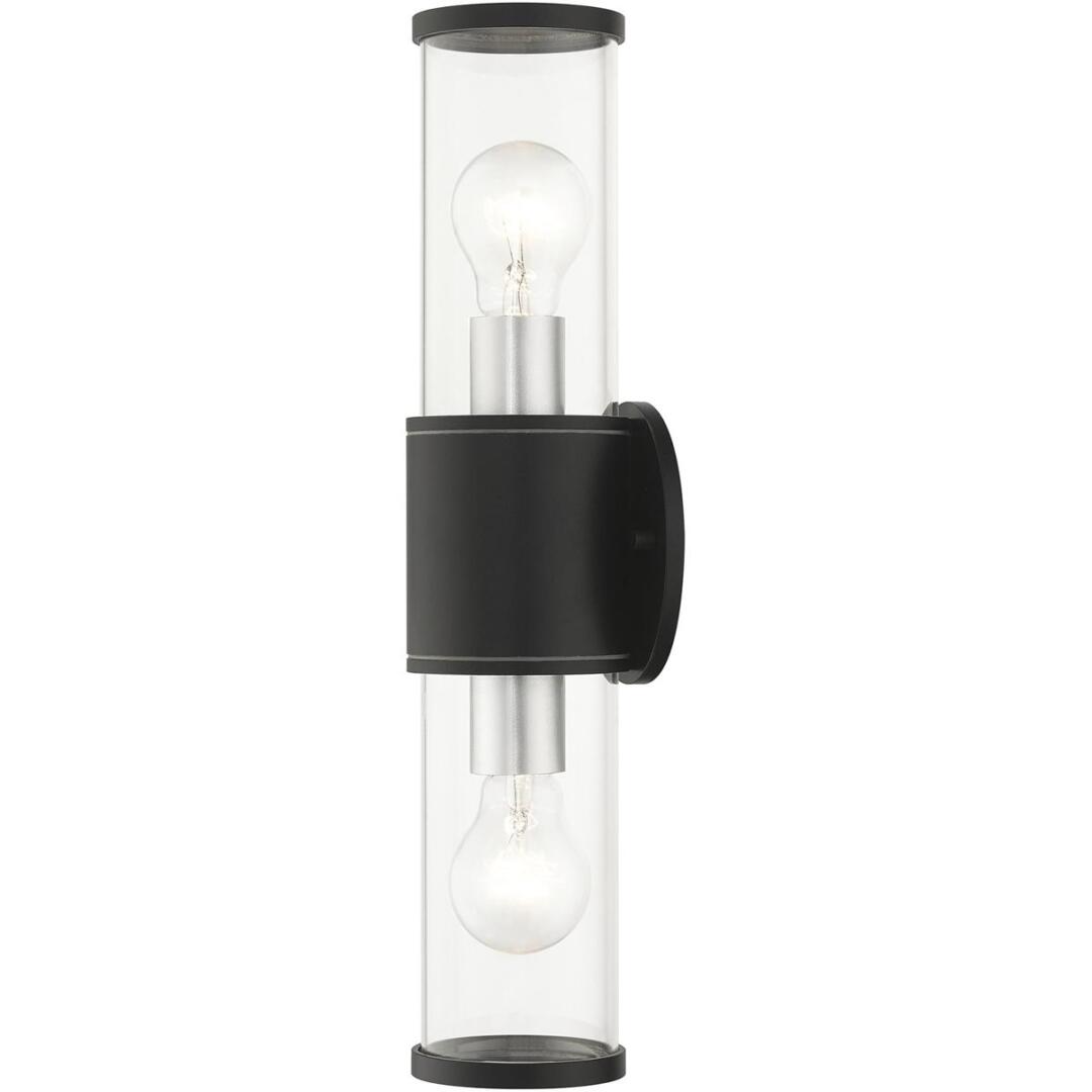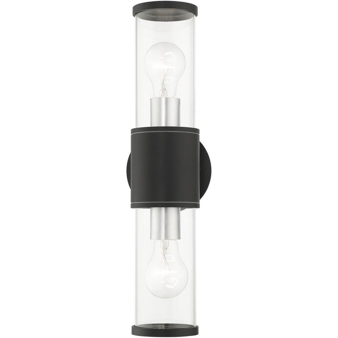 Add a dash of character and radiance to the exterior of your home with the Atlantic wall lantern. This two-light medium fixture features two clear glass cylinder closed top shades on either side, set off with a textured black finish with antique silver finish accents. The clean lines of the back plate complement the cylindrical glass shades adorned with detailed trim at the end of each glass creating a minimal, sleek look that works well in most outdoor or indoor settings. This fixture adds charm and contemporary aesthetics to your home.