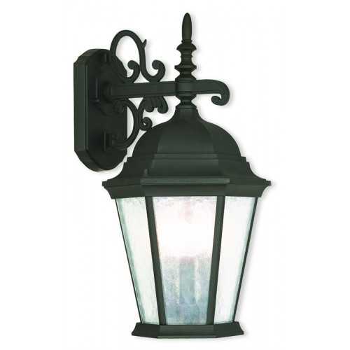 A decorative top and arm are paired with a simple six-sided frame in this textured black and clear water glass outdoor wall lantern is constructed of cast aluminum.