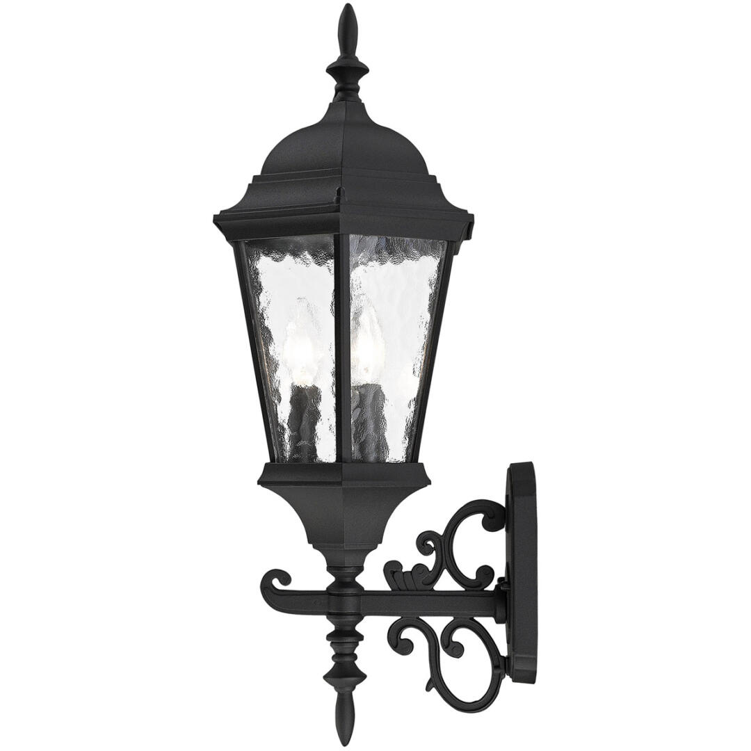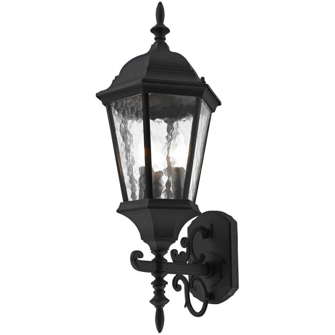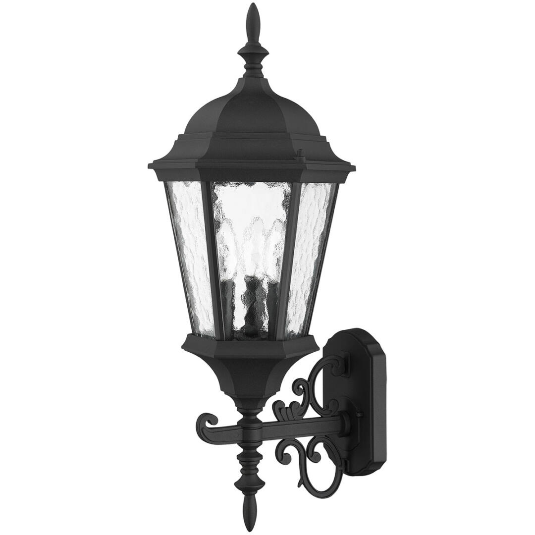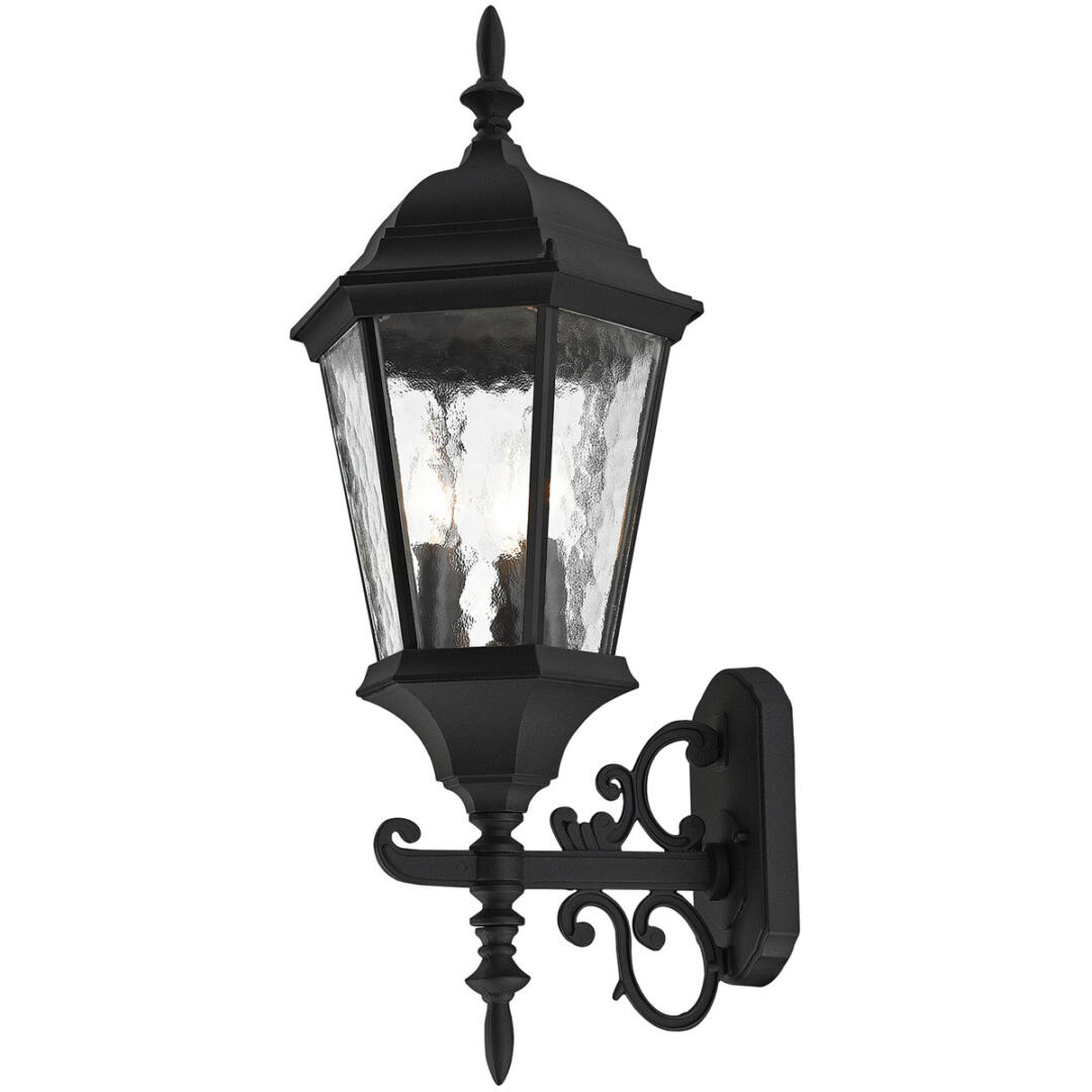 A decorative top and arm are paired with a simple six-sided frame in this textured black and clear water glass outdoor wall lantern is constructed of cast aluminum.