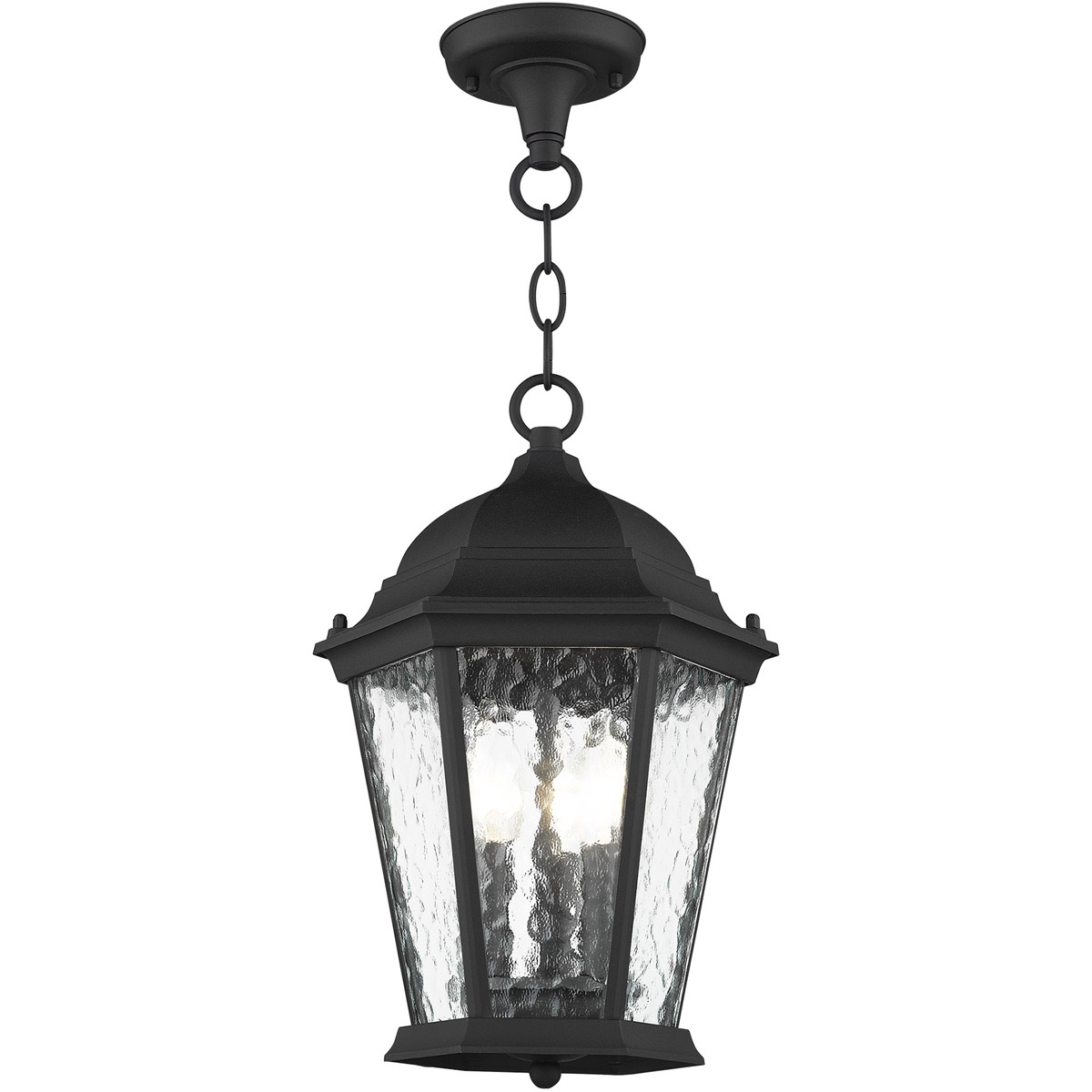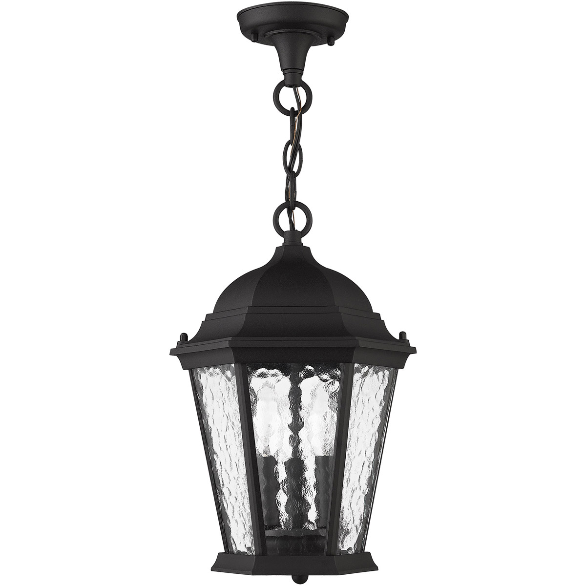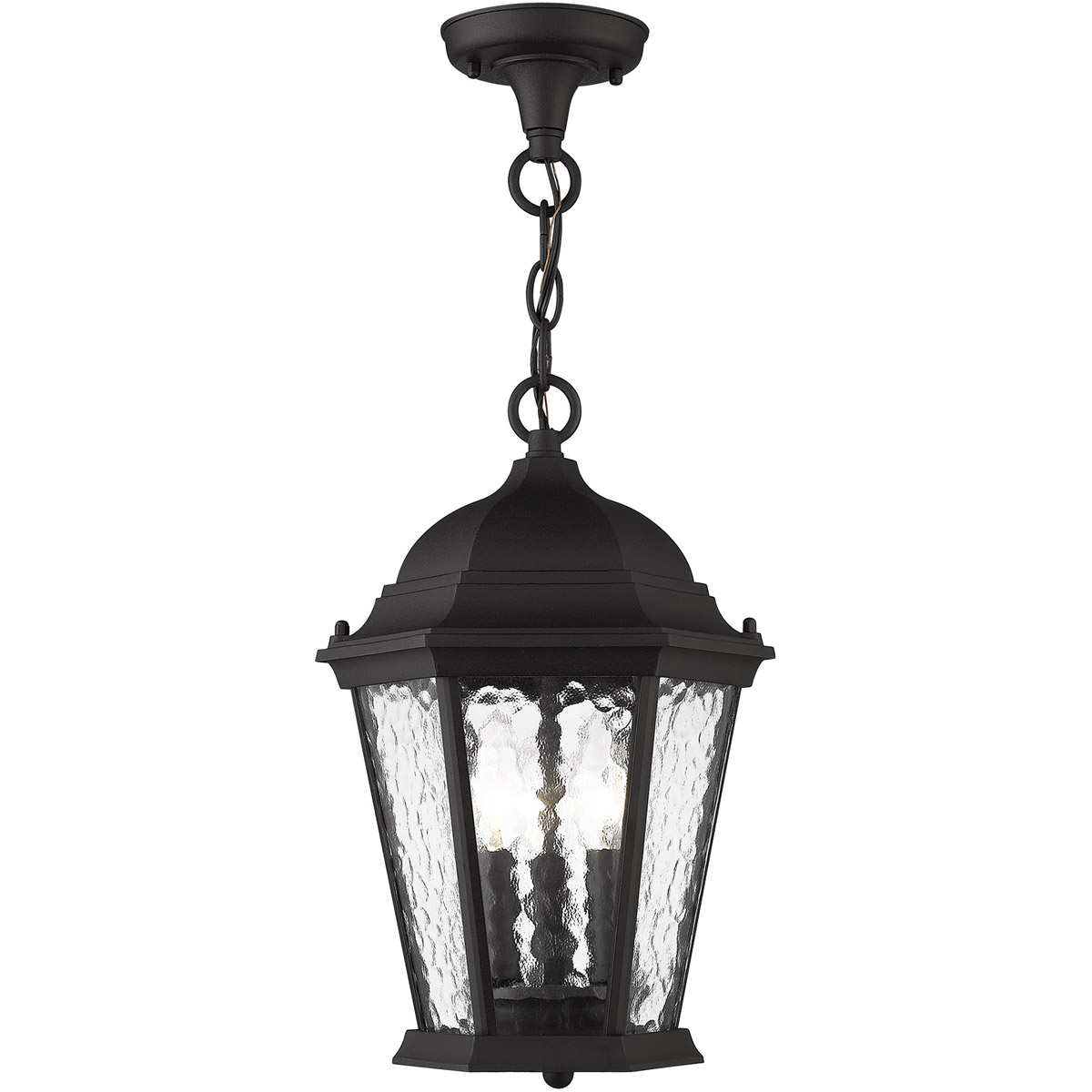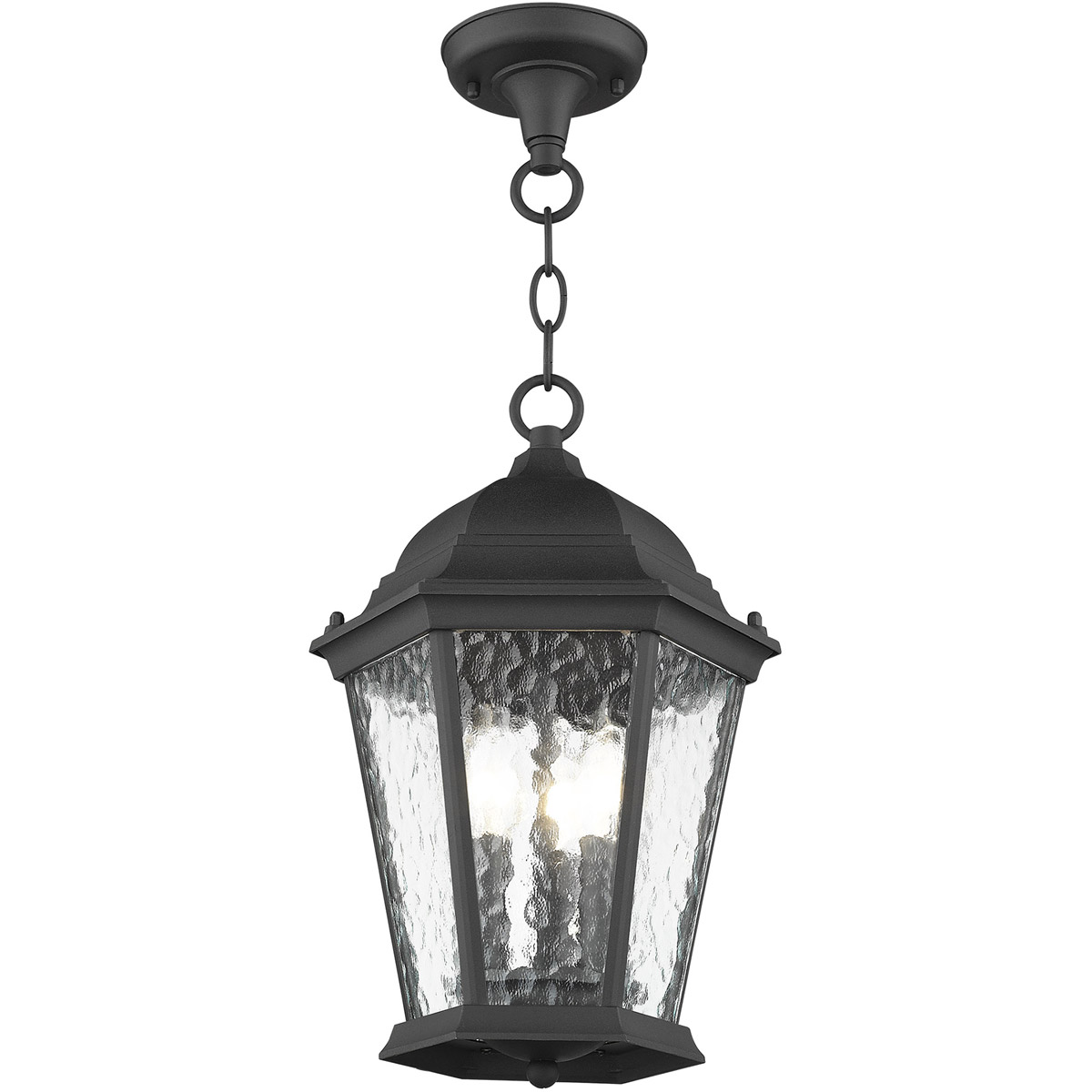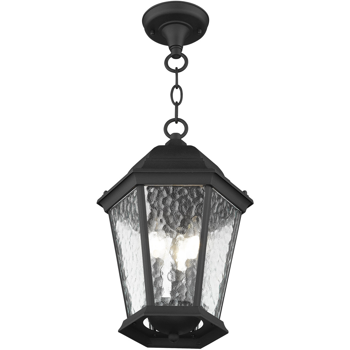 A decorative top and arm are paired with a simple six-sided frame in this textured black and clear water glass outdoor chain hung lantern is constructed of cast aluminum.