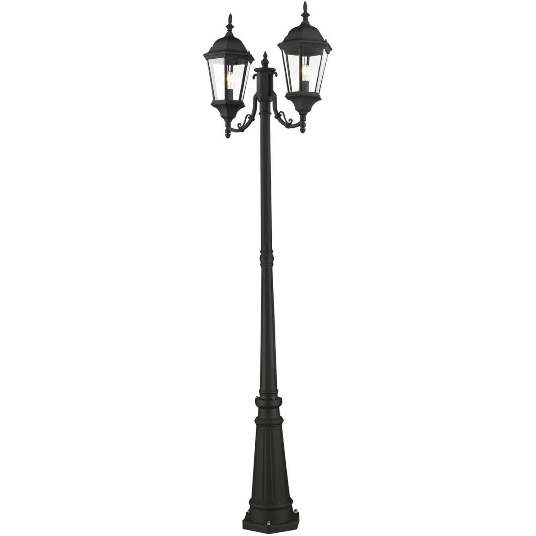 The elegant silhouette of the Hamilton collection is a classic that is sure to please even the most discriminating taste. This outdoor two-headed upward facing post light features decorative tops and arms which are paired with a simple six-sided frame in this textured black with clear beveled glass. Constructed of cast aluminum, this durable exterior fixture looks best in traditional or transitional outdoor settings.