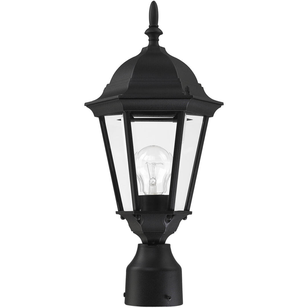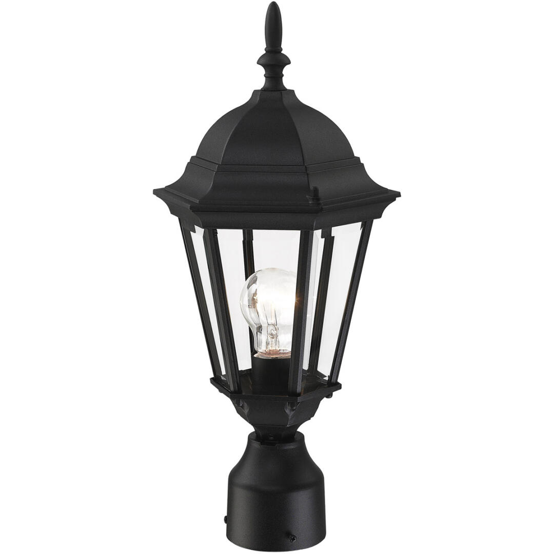 The elegant silhouette of the Hamilton collection is a classic that is sure to please even the most discriminating taste. This outdoor single-light small post top lantern features a decorative top and finial which are paired with a simple six-sided frame in a textured black finish with clear beveled glass. Constructed of cast aluminum, this durable exterior fixture looks best in traditional or transitional outdoor settings.