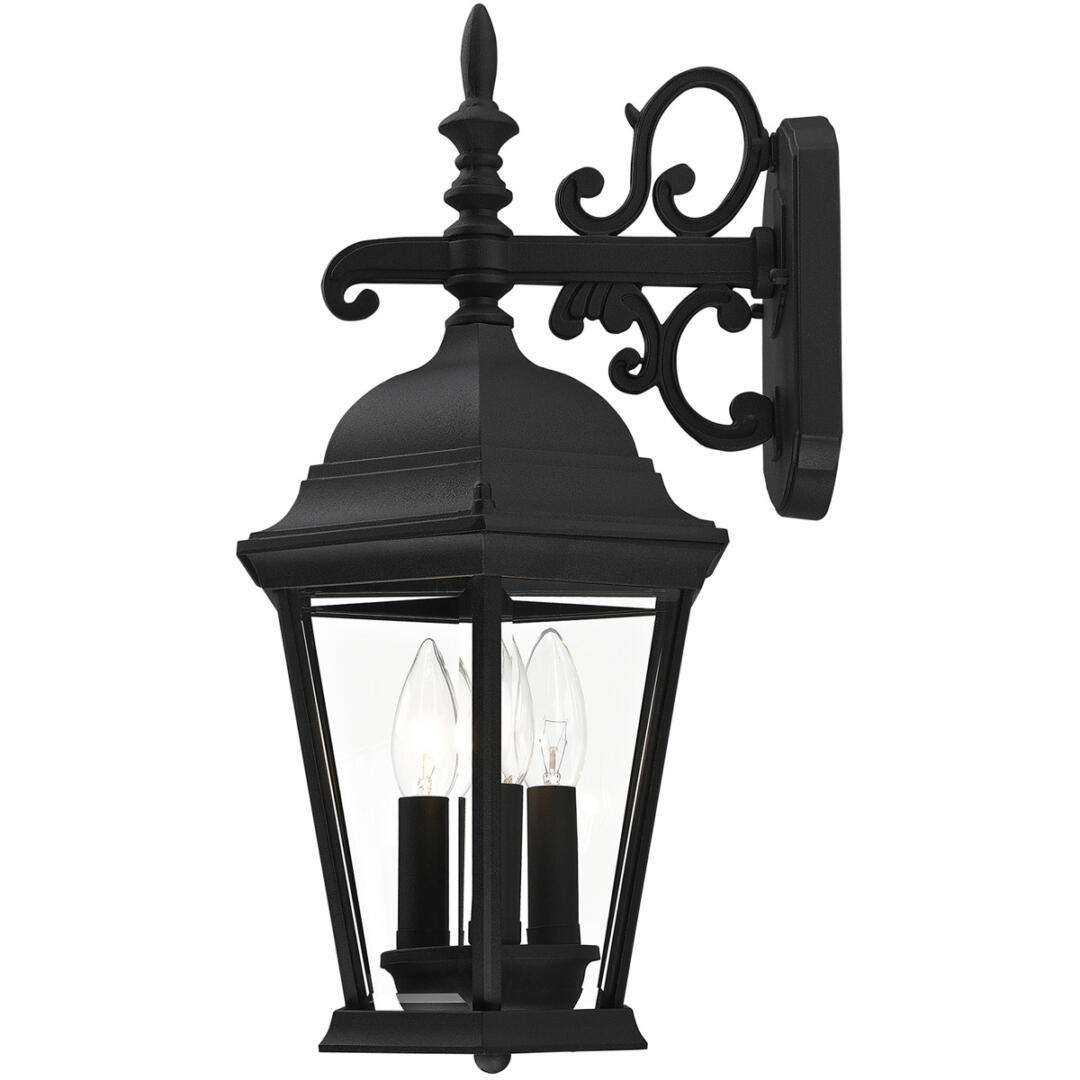 The elegant silhouette of the Hamilton collection is a classic that is sure to please even the most discriminating taste. This outdoor three-light downward hanging medium wall lantern features a decorative top and arm which are paired with a simple six-sided frame in this textured black finish with clear beveled glass. Constructed of cast aluminum, this durable exterior fixture looks best in traditional or transitional outdoor settings.