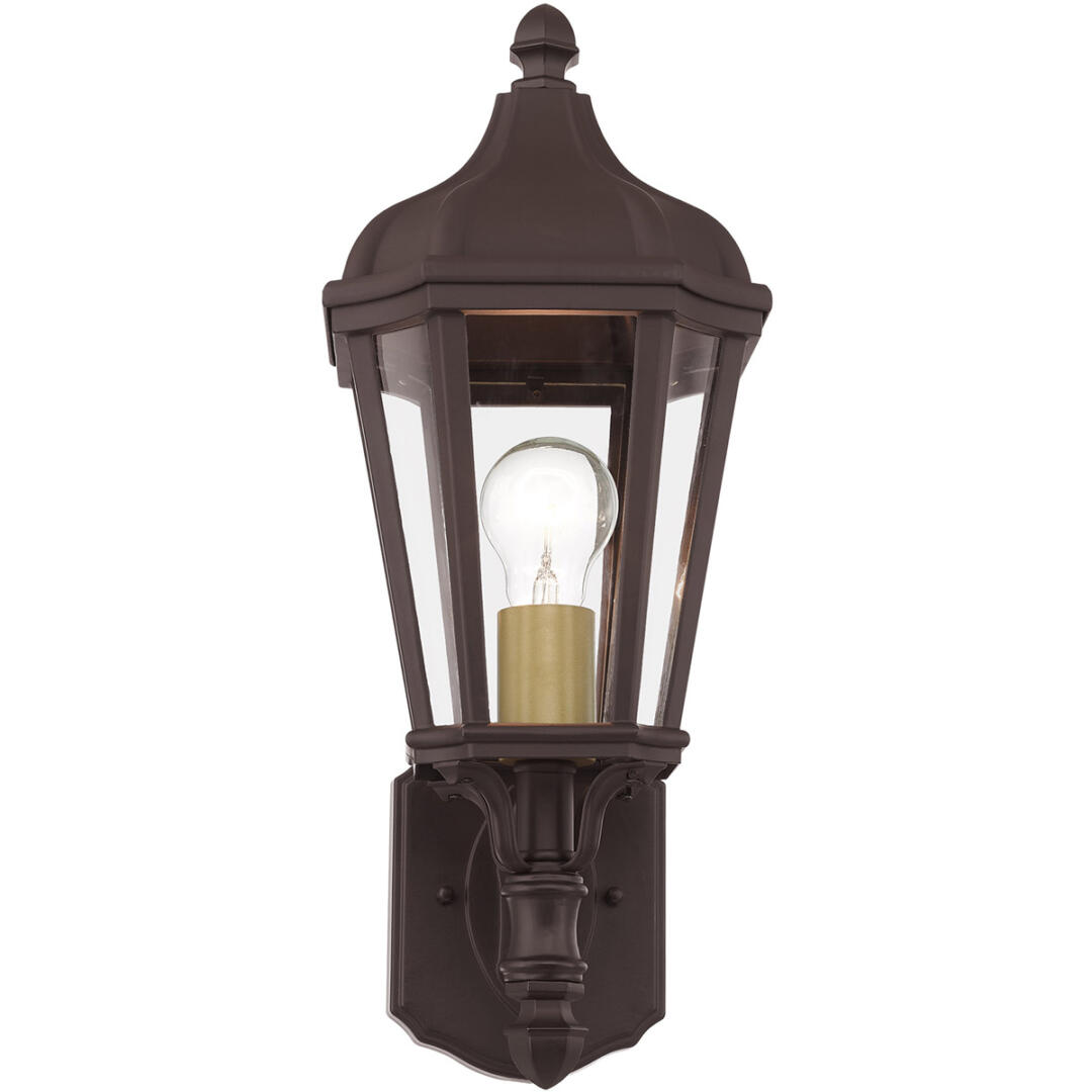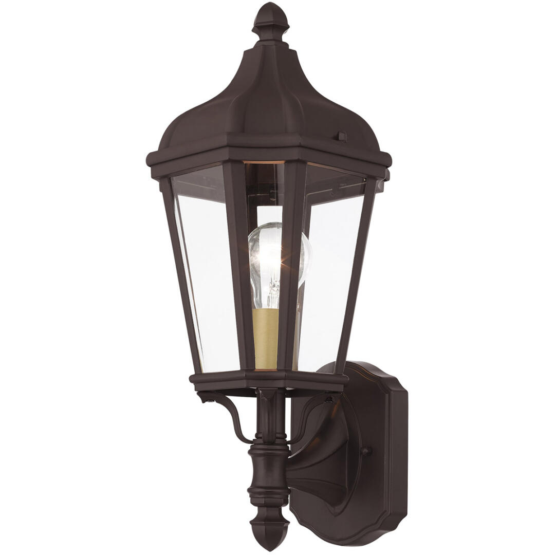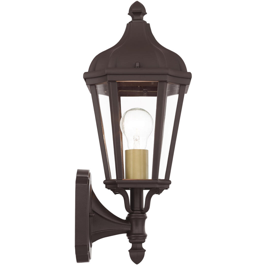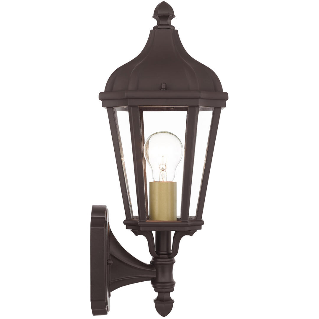With clear glass and a classic bronze finish, this outdoor wall lantern from the Morgan collection is an elegant way to illuminate traditional exteriors.