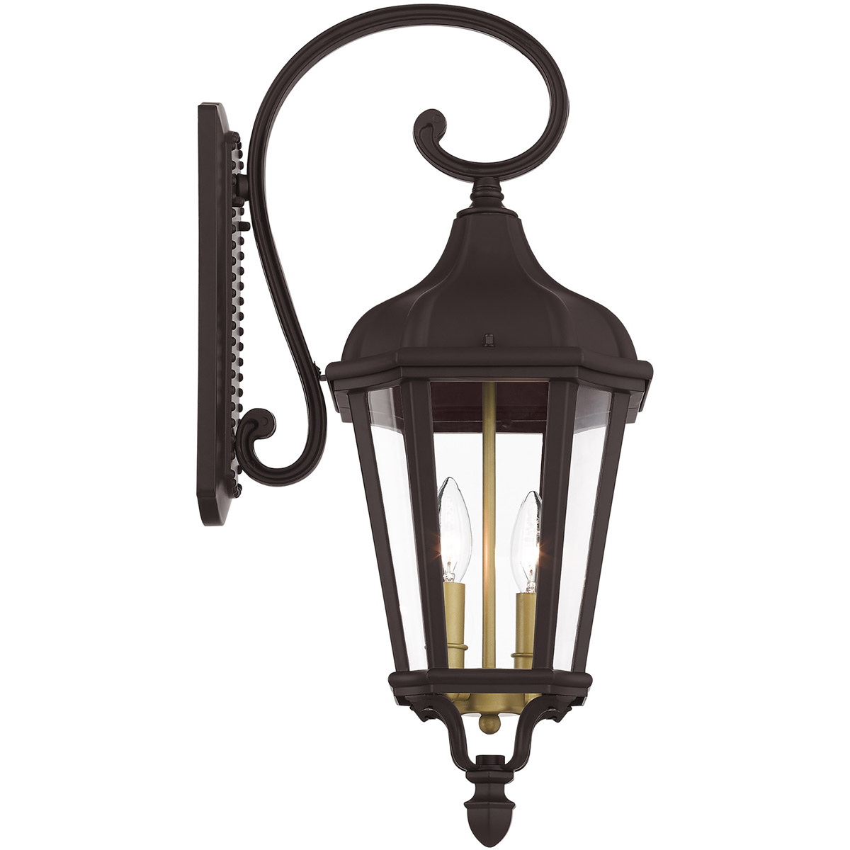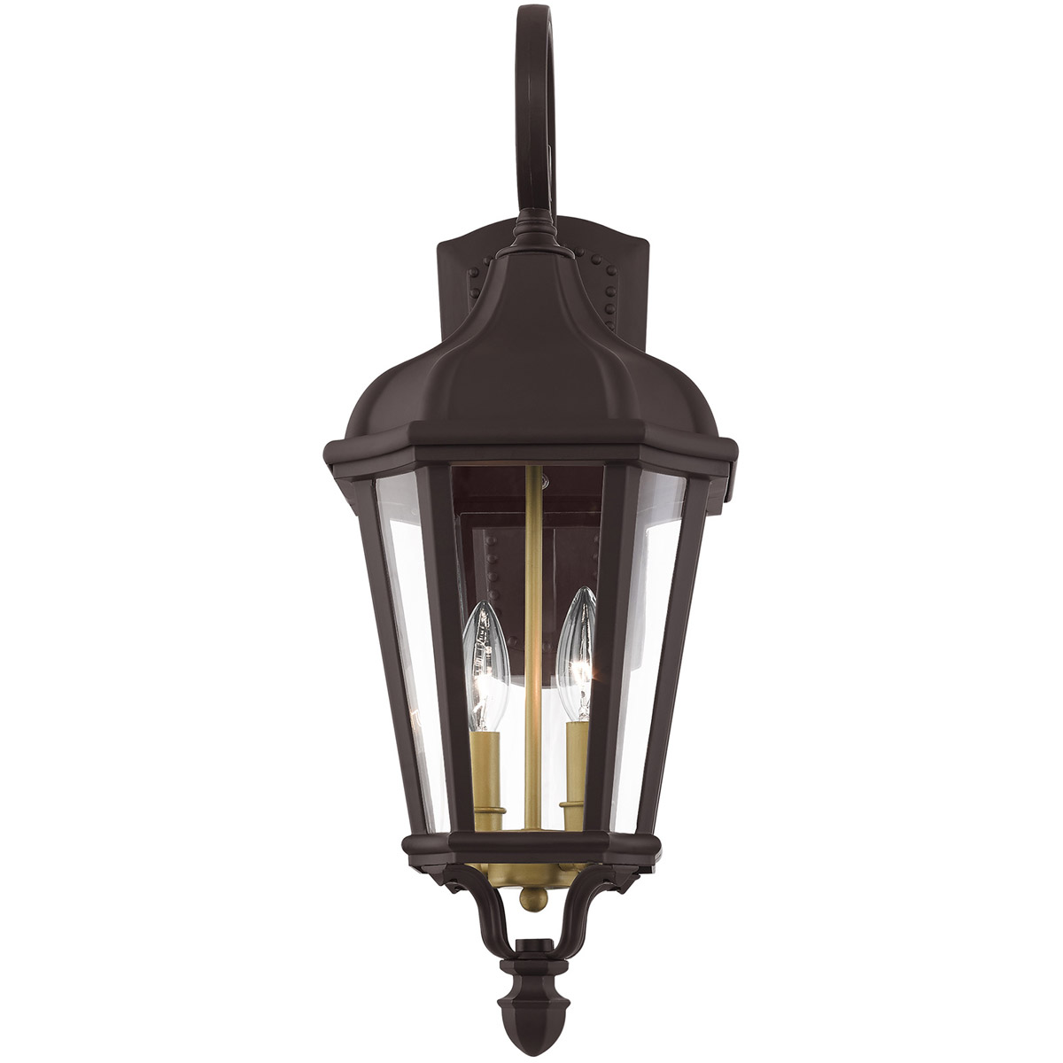 With clear glass and a classic bronze finish, this outdoor wall lantern from the Morgan collection is an elegant way to illuminate traditional exteriors.