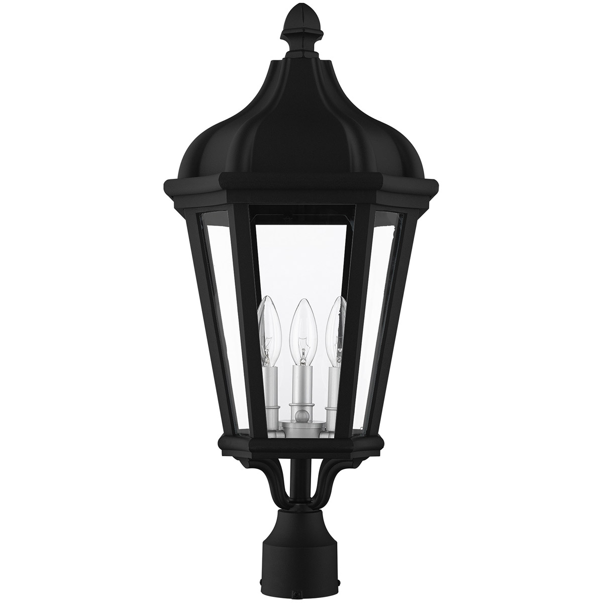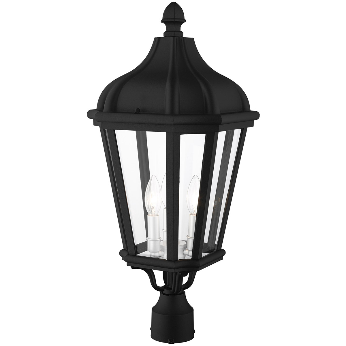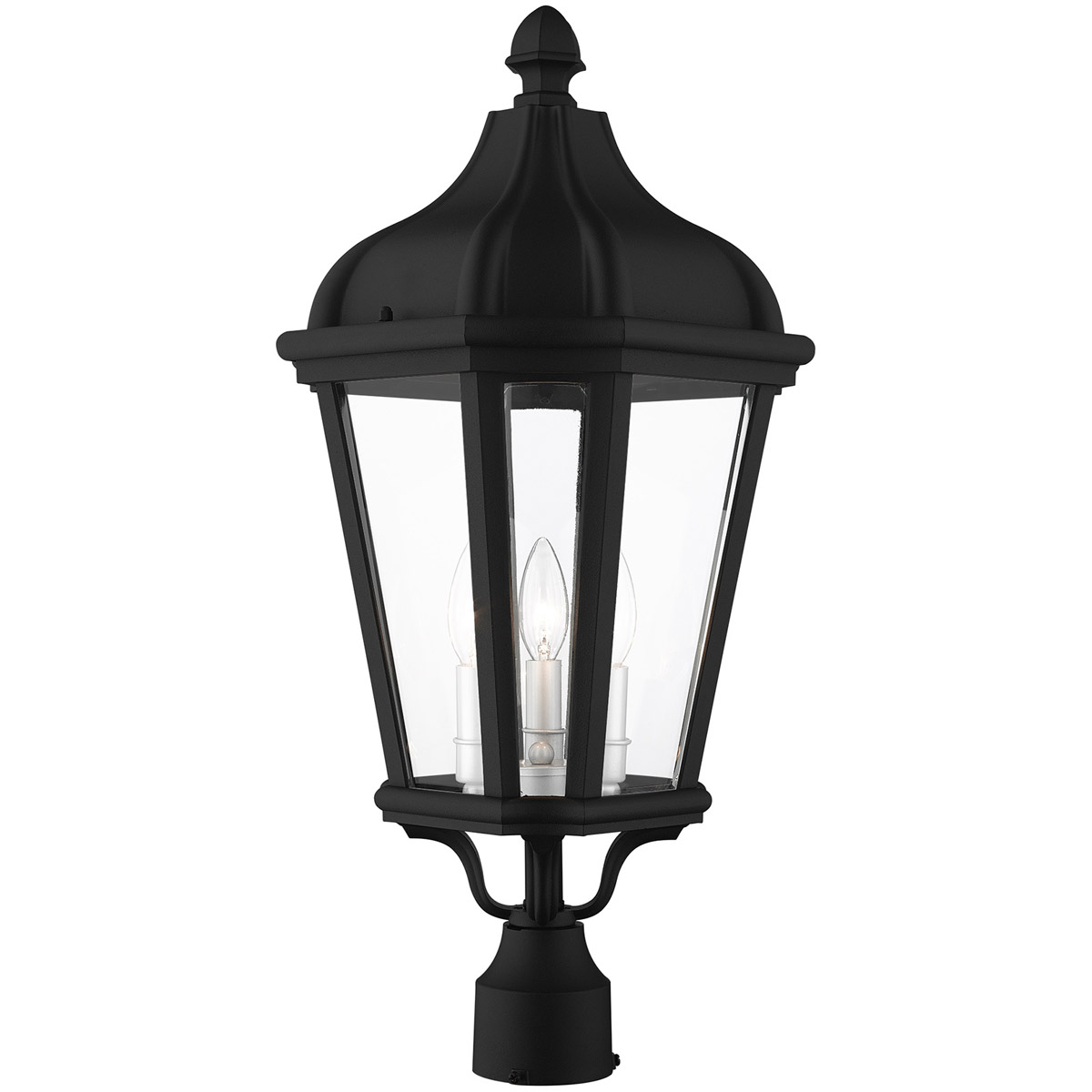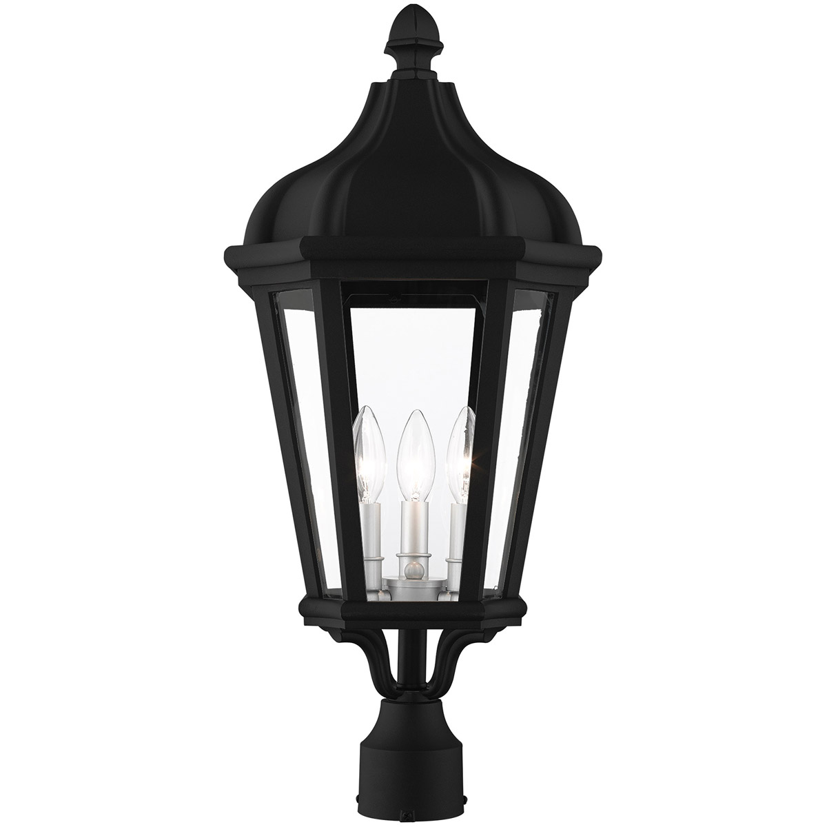With clear glass and a textured black finish, this outdoor post lantern from the Morgan collection is an elegant way to illuminate traditional exteriors.