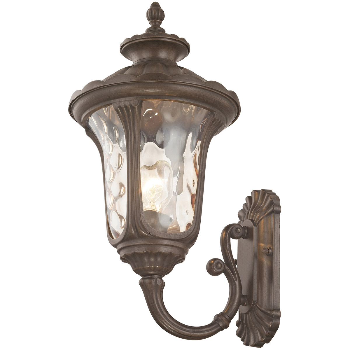 From the Oxford outdoor lantern collection, this traditional design will add curb appeal to any home. It features a handsome, antique-style wall plate and decorative arm. Light amber water glass cast an appealing light and lends to its vintage charm. Wall plate, arm and other details are all in a imperial bronze finish.