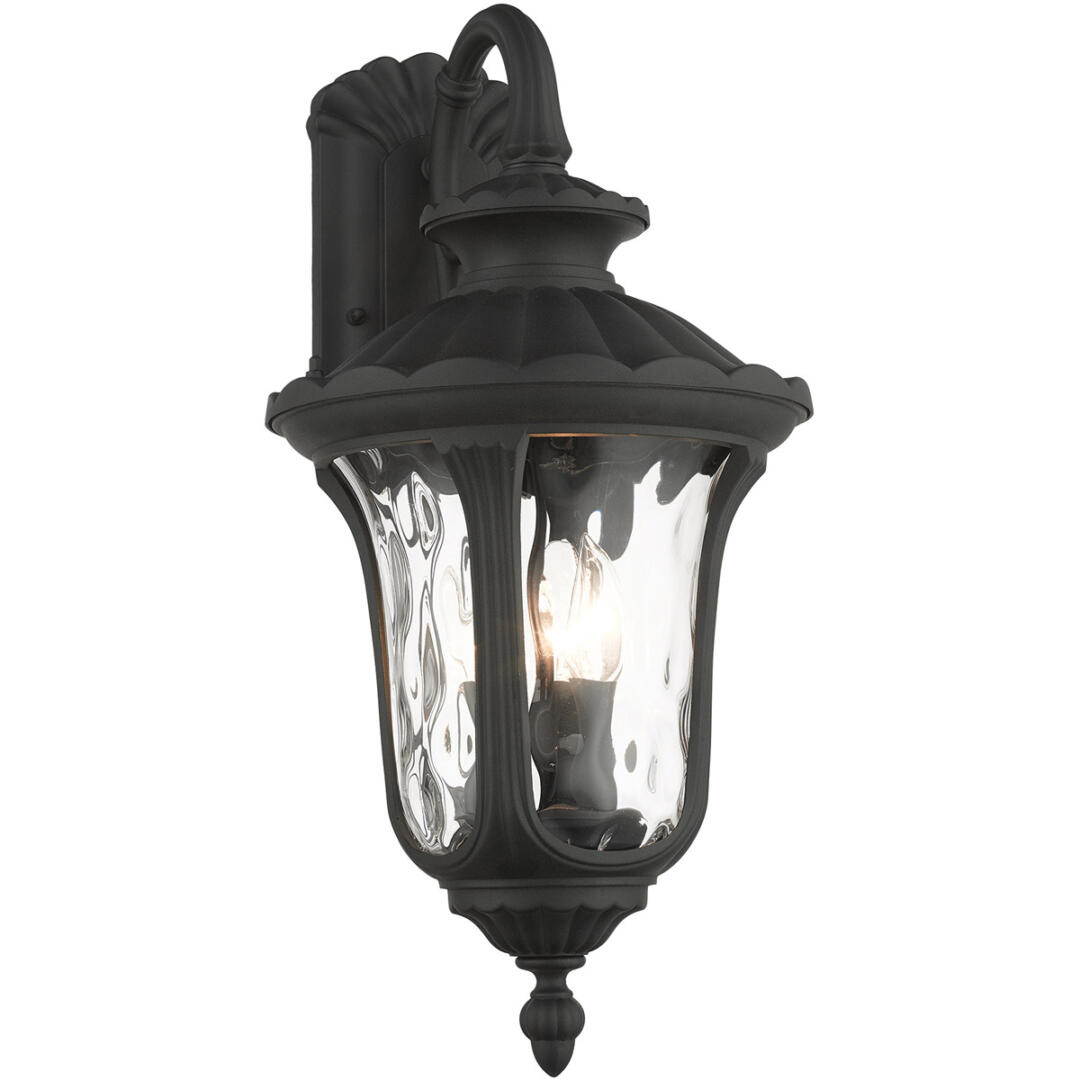 From the Oxford outdoor lantern collection, this traditional cast aluminum downward hanging three-light large wall lantern design will add curb appeal to any home. It features a handsome, antique-style wall plate and decorative arm. Clear water glass casts an appealing light and lends to its vintage charm. The wall plate, arm and other details are all in a textured black finish. With superb craftsmanship and affordable price, this fixture is sure to tastefully indulge your senses.