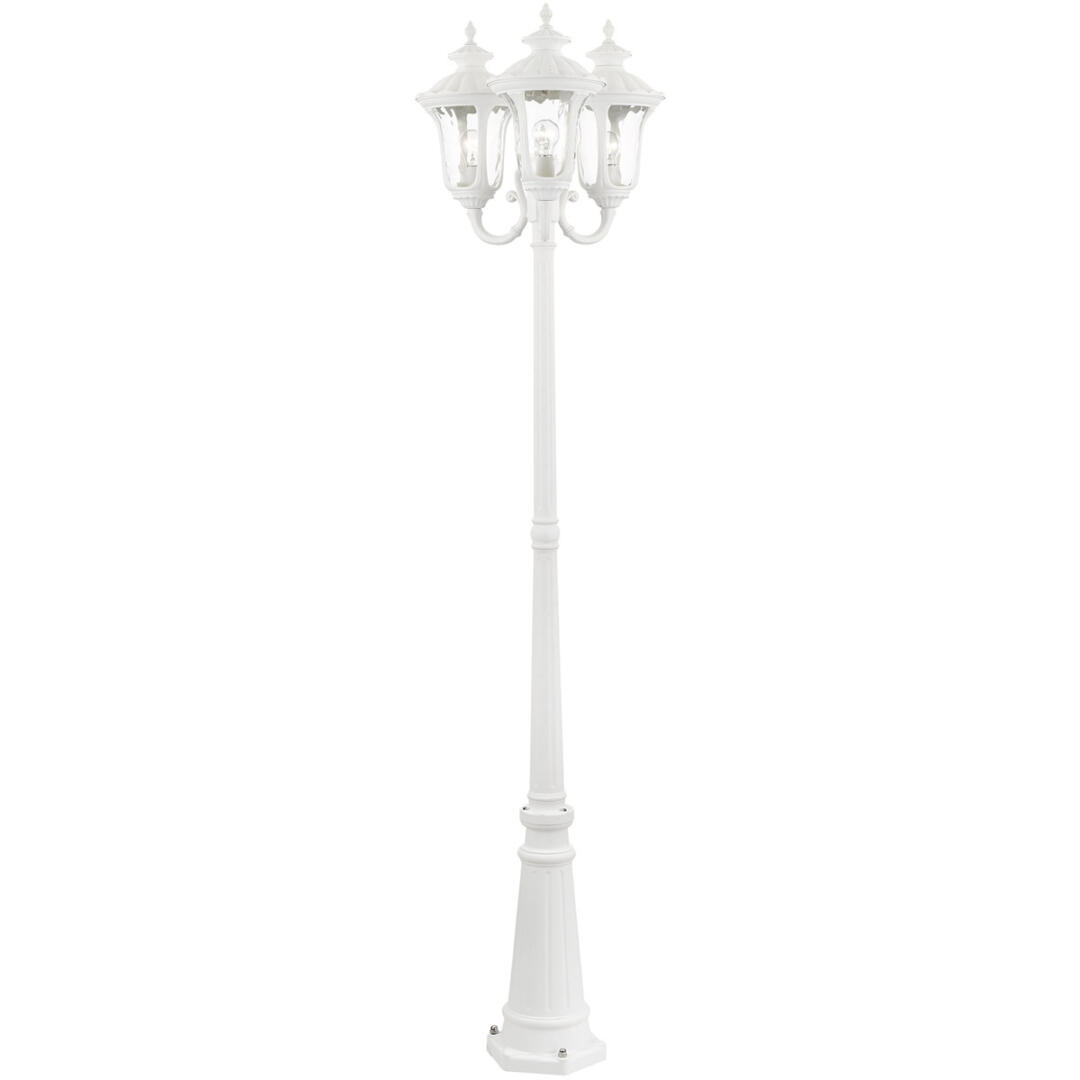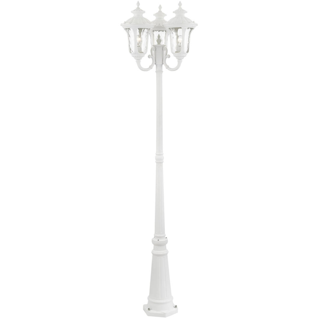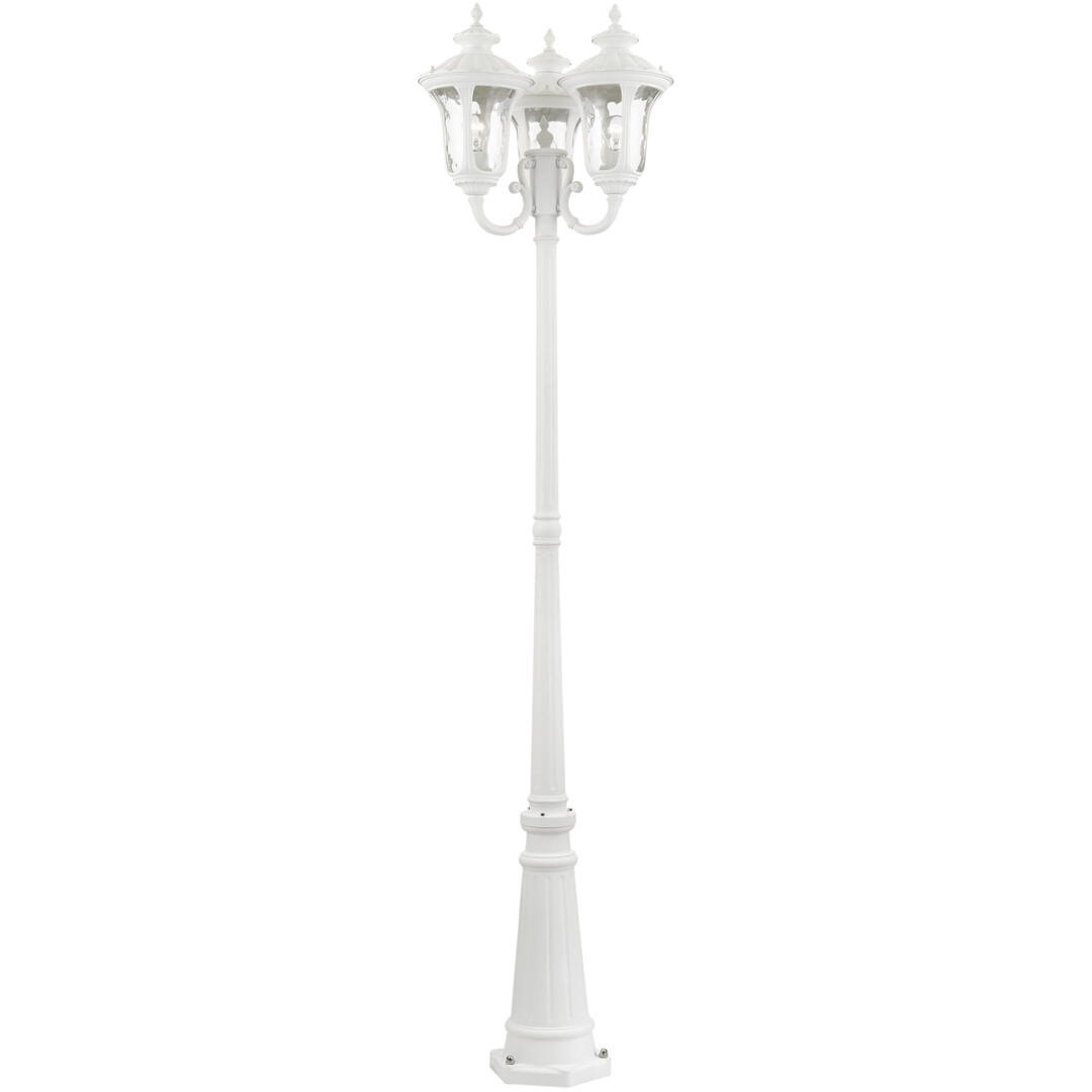 From the Oxford outdoor lantern collection, this traditional cast aluminum upward facing three-head ground post light design will add curb appeal to any home. It features a handsome, antique-style base and decorative arms. Clear water glass casts an appealing light and lends to its vintage charm. The cast aluminum ornamental post base, arms and sculptural details are all finished in a textured white. With superb craftsmanship and affordable price, this fixture is sure to tastefully indulge your senses.