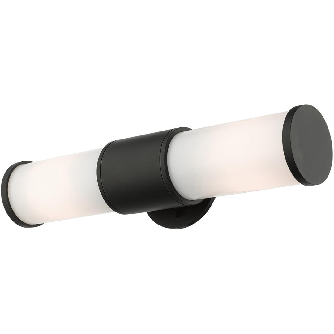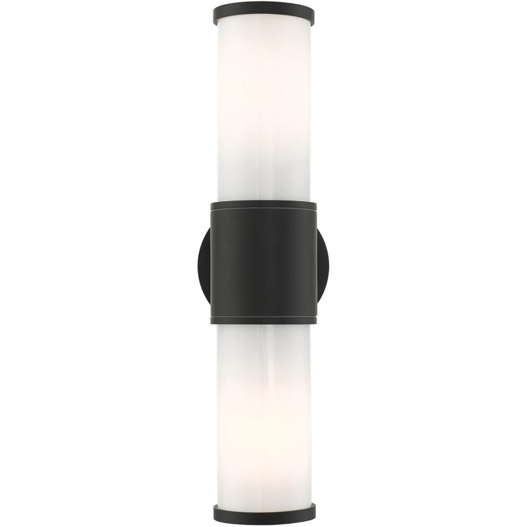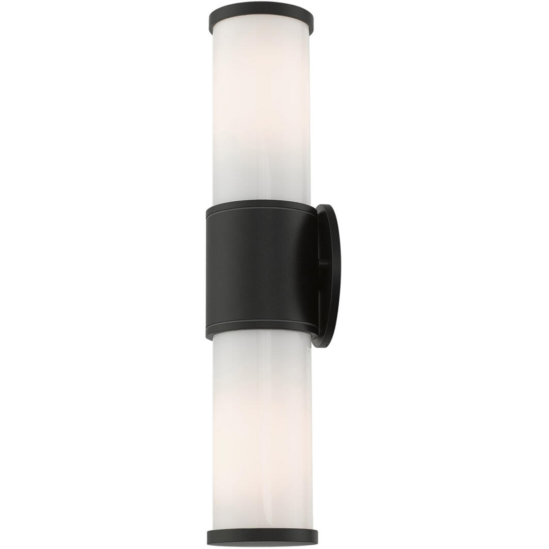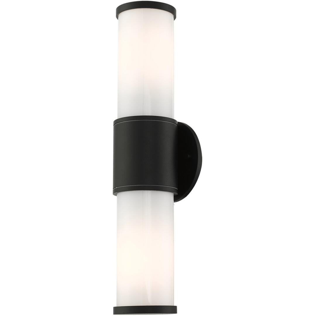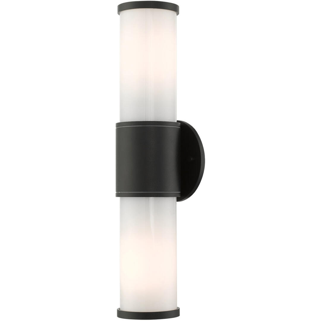 Add a dash of character and radiance to the exterior of your home with this wall lantern. This two-light medium fixture from the Landsdale Collection features two satin opal white glass cylinder closed top shades on either side, set off with a textured black finish. The clean lines of the back plate complement the cylindrical glass shades adorned with detailed trim at the end of each glass creating a minimal, sleek look that works well in most outdoor or indoor settings. This fixture adds charm and contemporary aesthetics to your home.