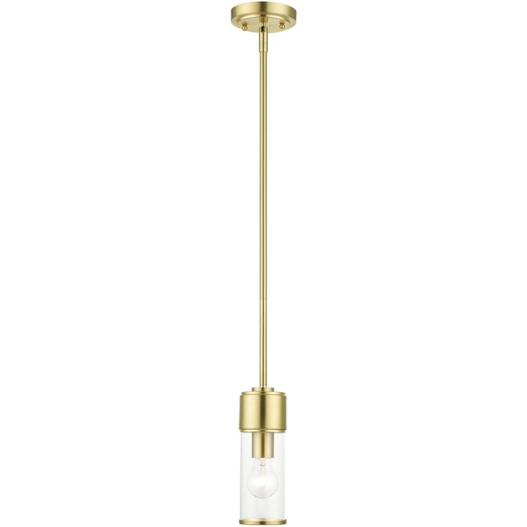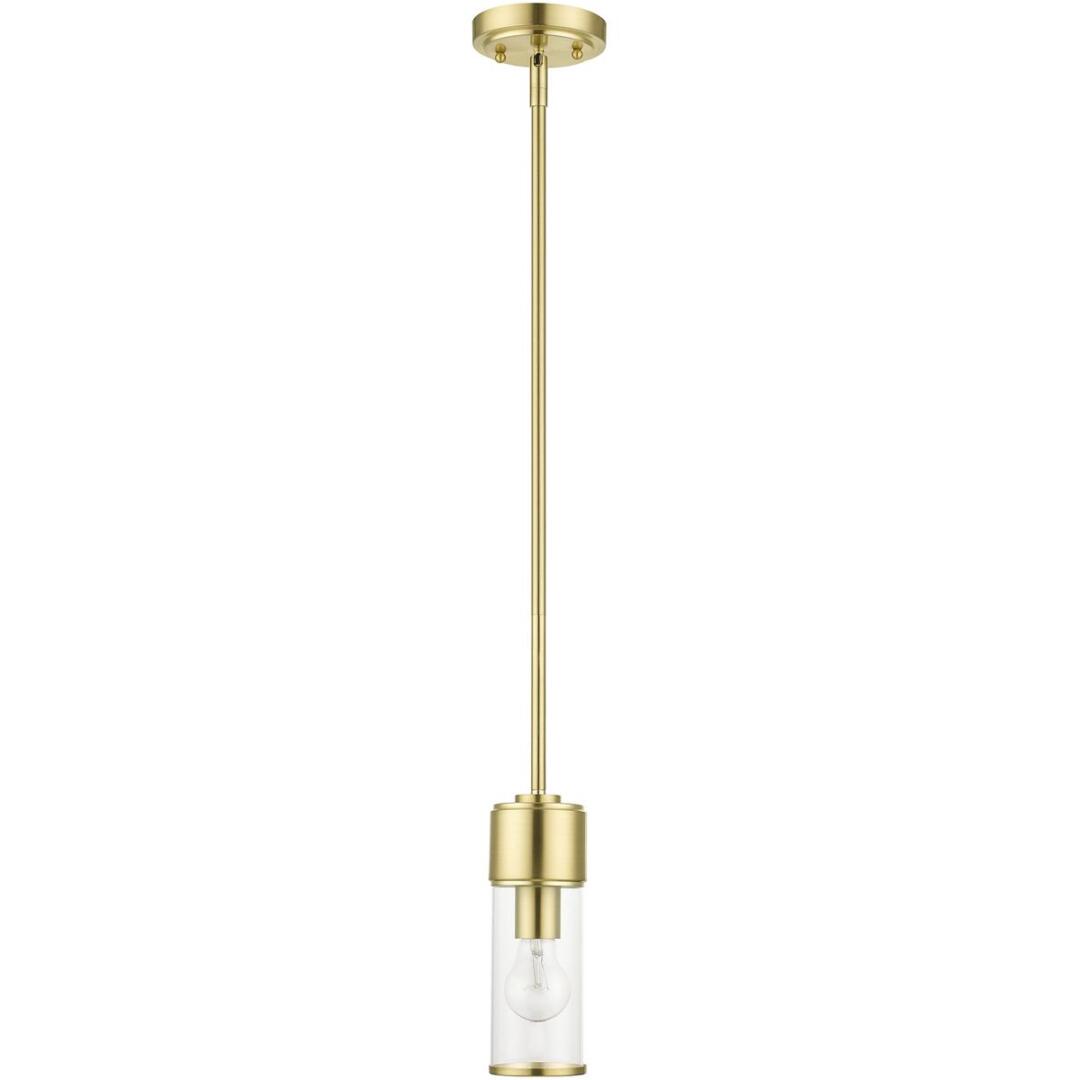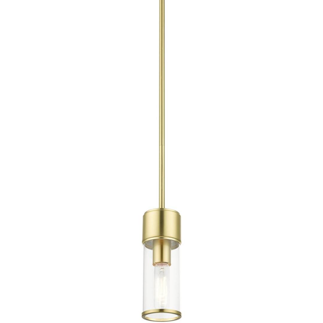 The stunning Quincy mini pendant features a satin brass finish with clear glass. This sleek design will brighten up counters, dining areas, and more.