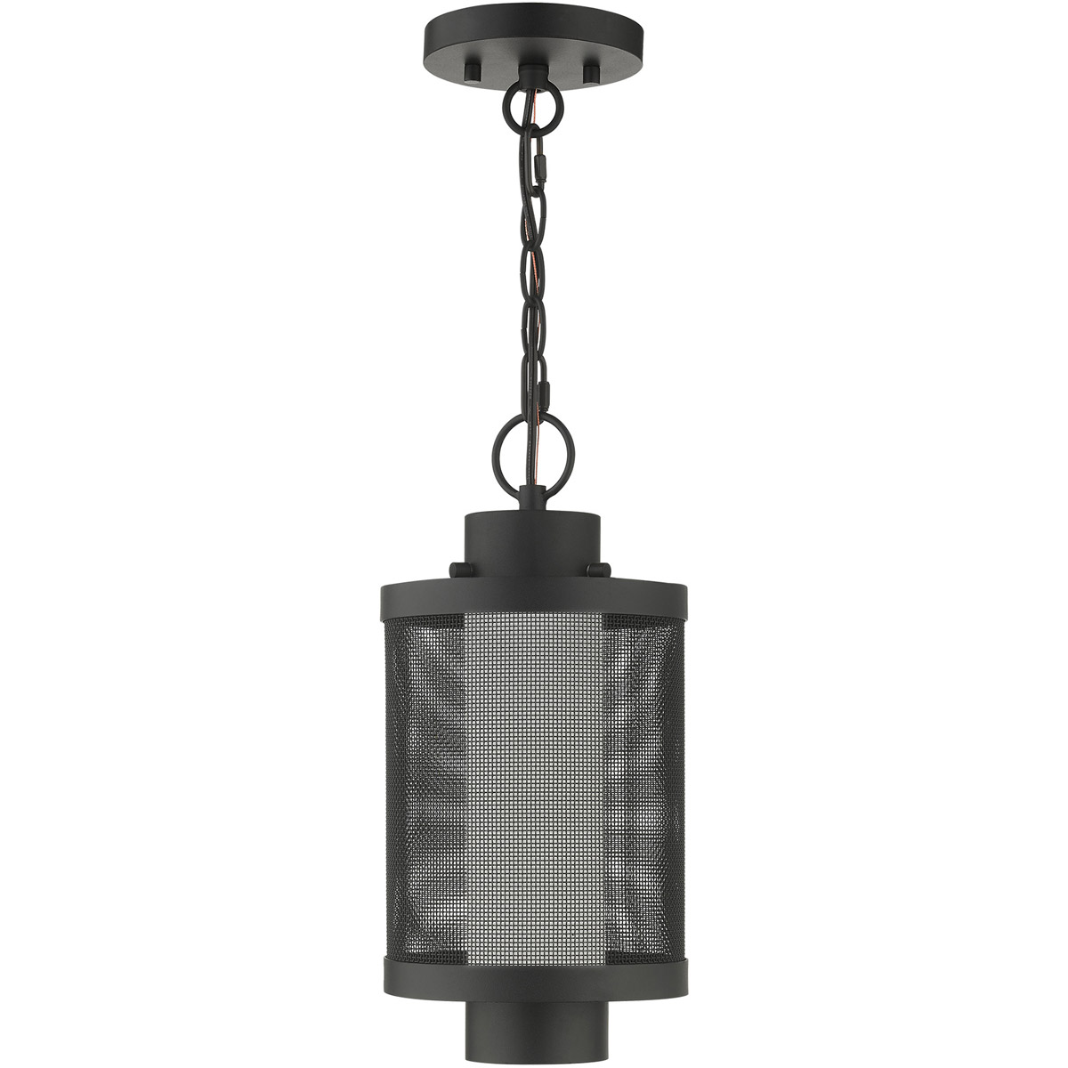 The Nottingham outdoor collection has a clean, crisp look and contemporary appeal. This single light stainless steel medium pendant lantern has a textured black finish and features a sleek stainless steel mesh shade with satin opal white glass.
