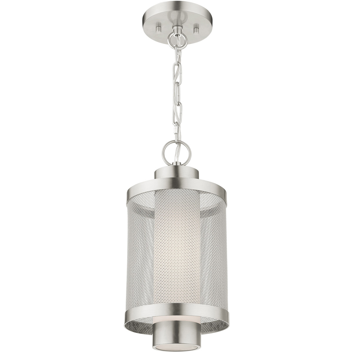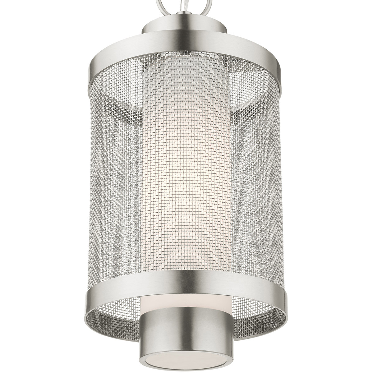 The Nottingham outdoor collection has a clean, crisp look and contemporary appeal. This single light stainless steel medium pendant lantern has a brushed nickel finish and features a sleek stainless steel mesh shade with satin opal white glass.