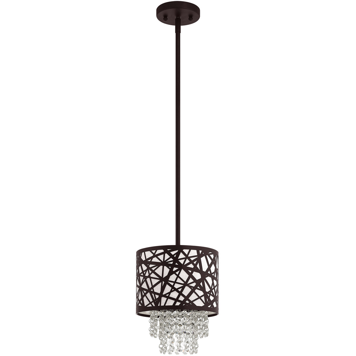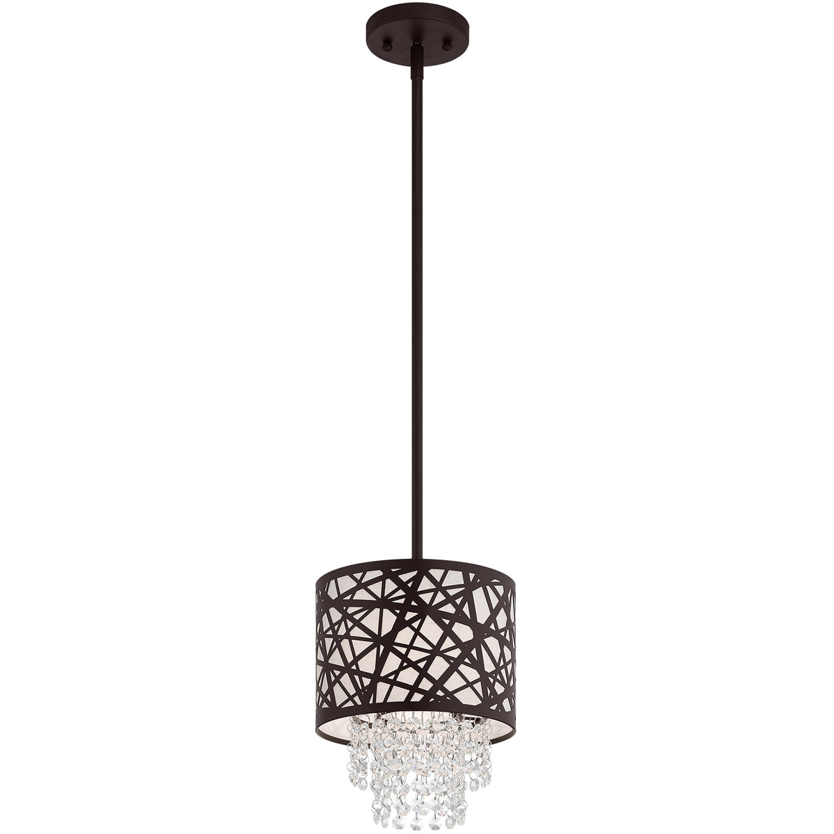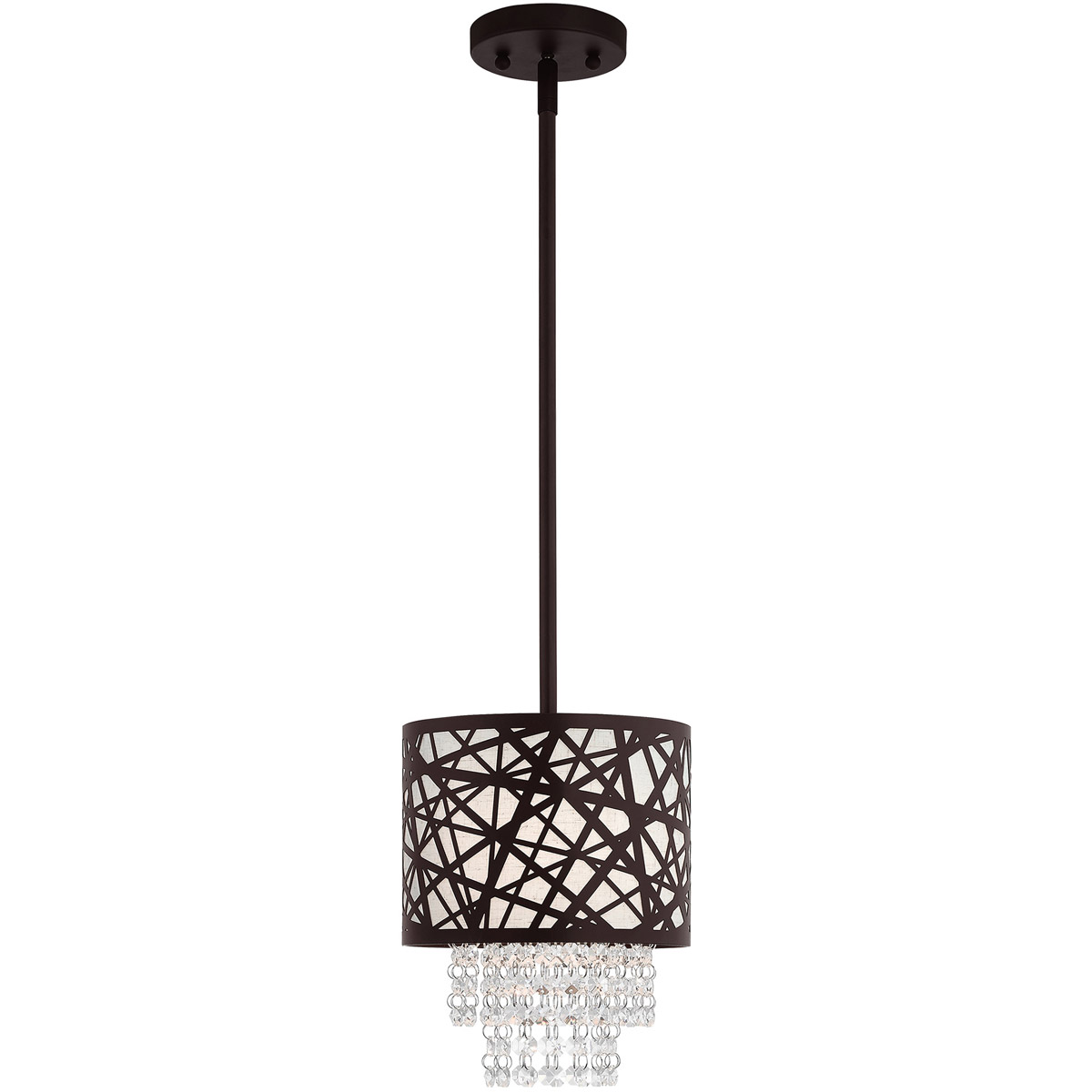 This spectacular bronze mini pendant will take your home decor to the next level. Inspired by a bird nest, the laser-cut metal sheath surrounds an oatmeal fabric hardback shade with strands glistening of clear crystal.