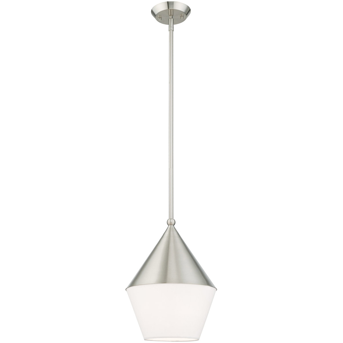 The unique design of the Stockholm mini pendant merges different materials to create a truly eye-catching fixture. The brushed nickel body is accented by a hand crafted off-white hardback shade around the bottom creating a distinct mid century modern look.
