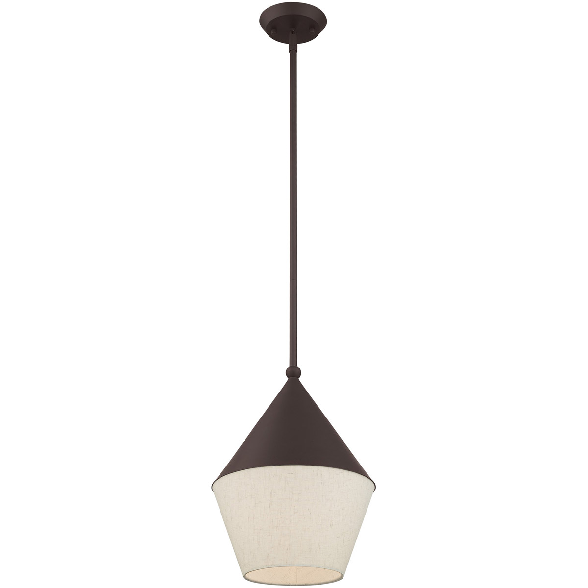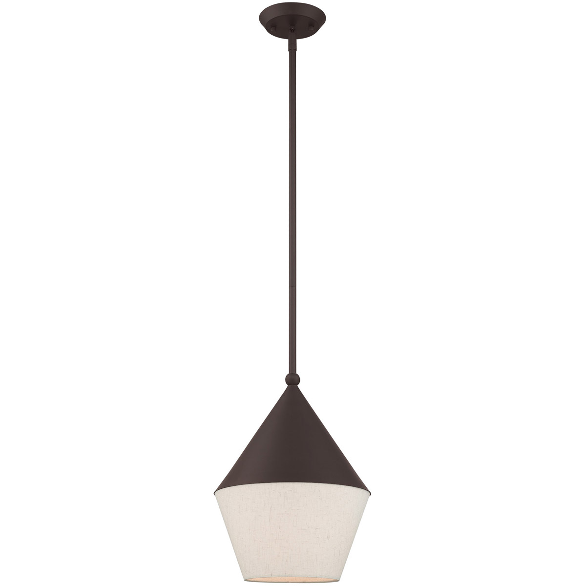 The unique design of the Stockholm mini pendant merges different materials to create a truly eye-catching fixture. The bronze body is accented by a hand crafted oatmeal hardback shade around the bottom creating a distinct mid century modern look.