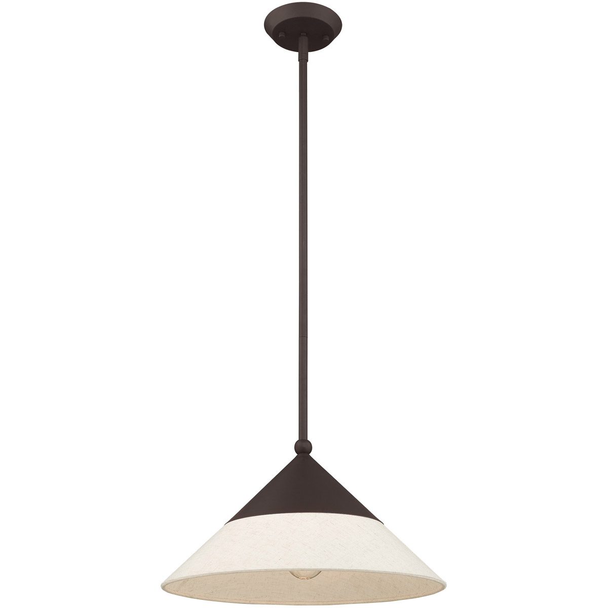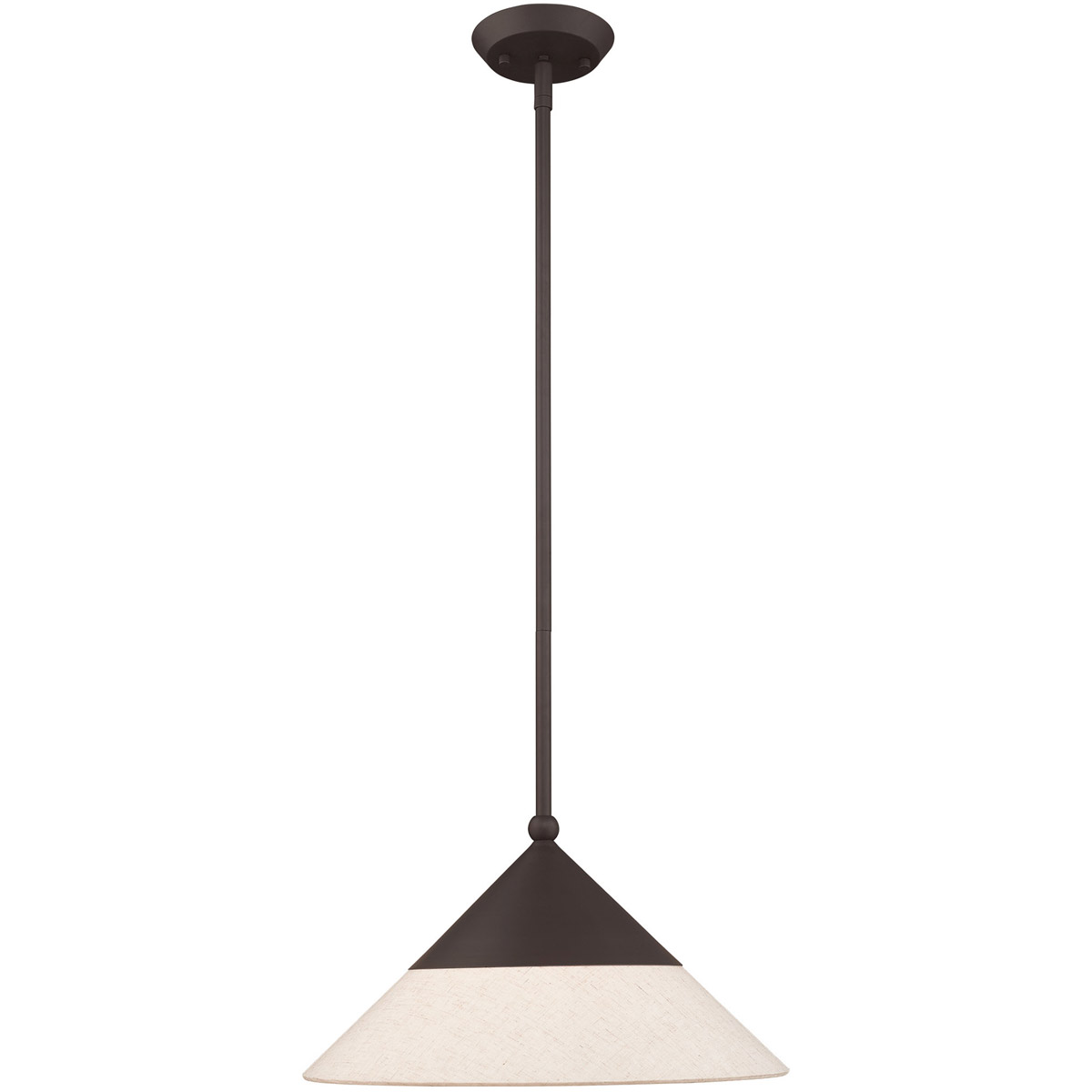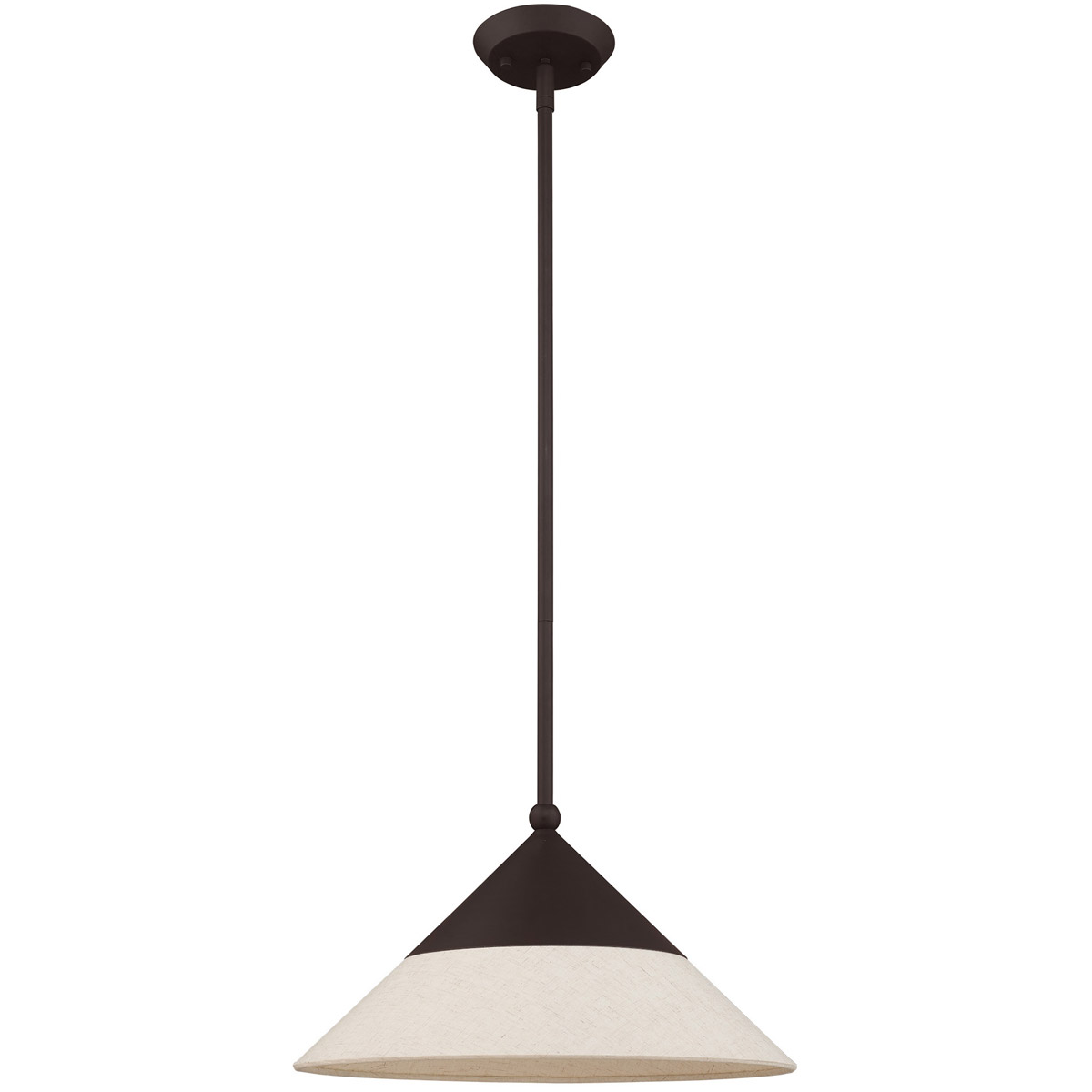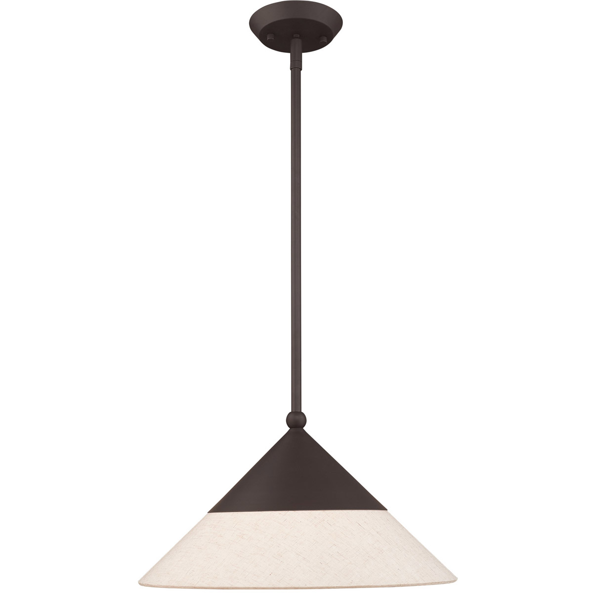 The unique design of the Stockholm pendant merges different materials to create a truly eye-catching fixture. The bronze body is accented by a hand crafted oatmeal hardback shade around the bottom creating a distinct mid century modern look.