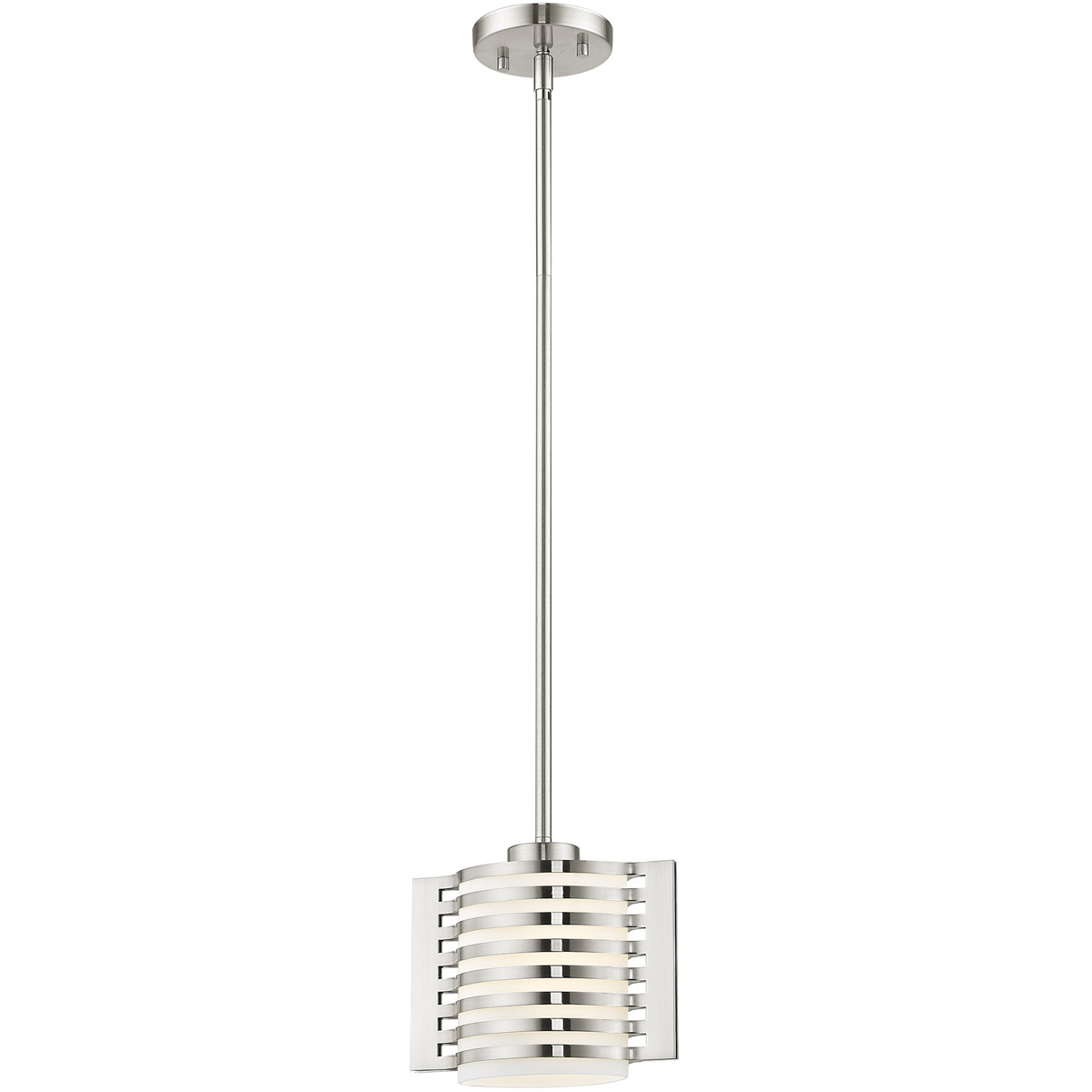 Combine a modern style with a bold aesthetic by adding this designer, brushed nickel one light mini pendant to your home. Sleek brushed nickel surround a satin opal white glass, creating a dimensional look and feel.