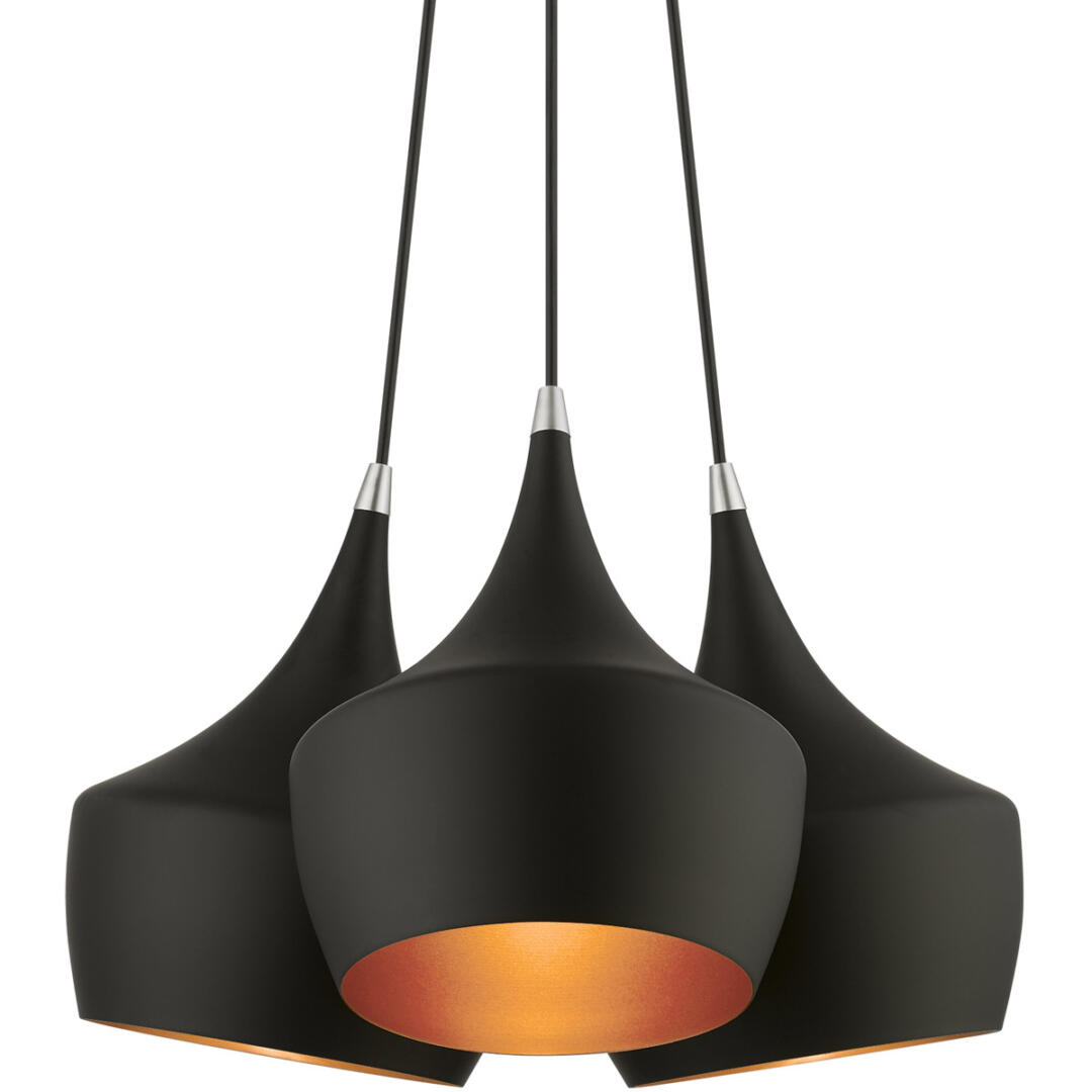 The distinctive shape of the Waldorf 3-light teardrop cluster pendant in a black finish makes it a wonderful accent for any setting. A gleaming gold finish on the interior of the metal shades brings a refined touch of style.