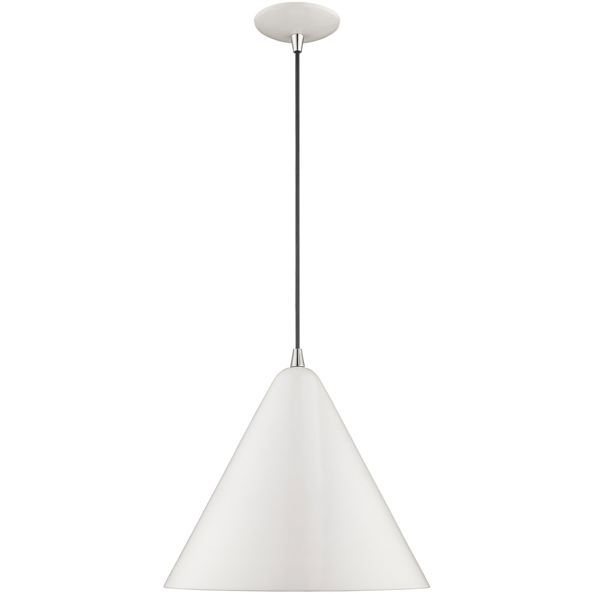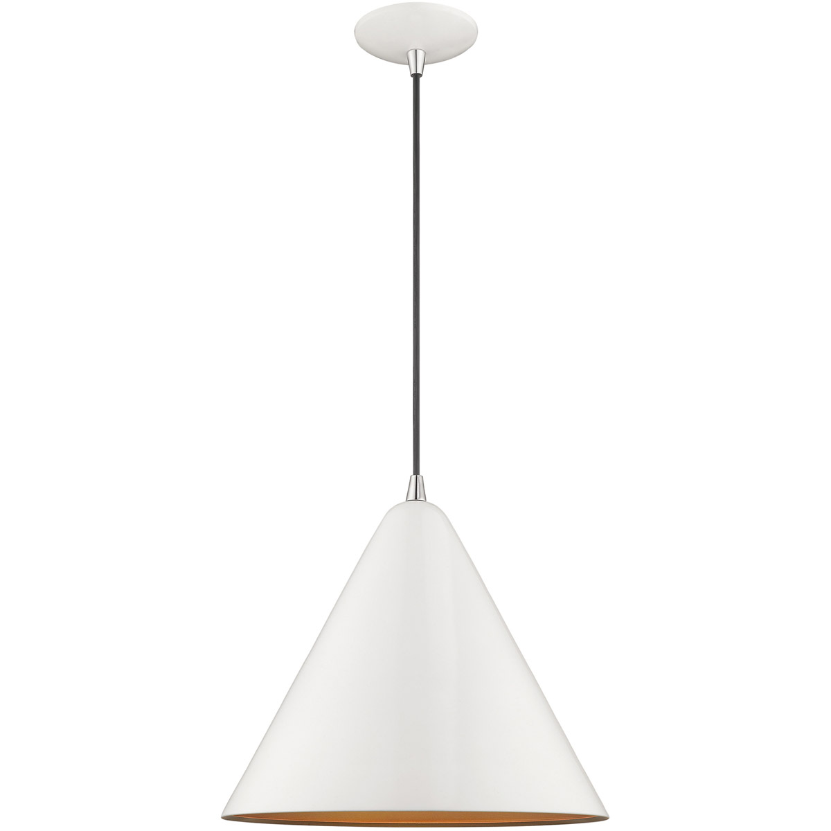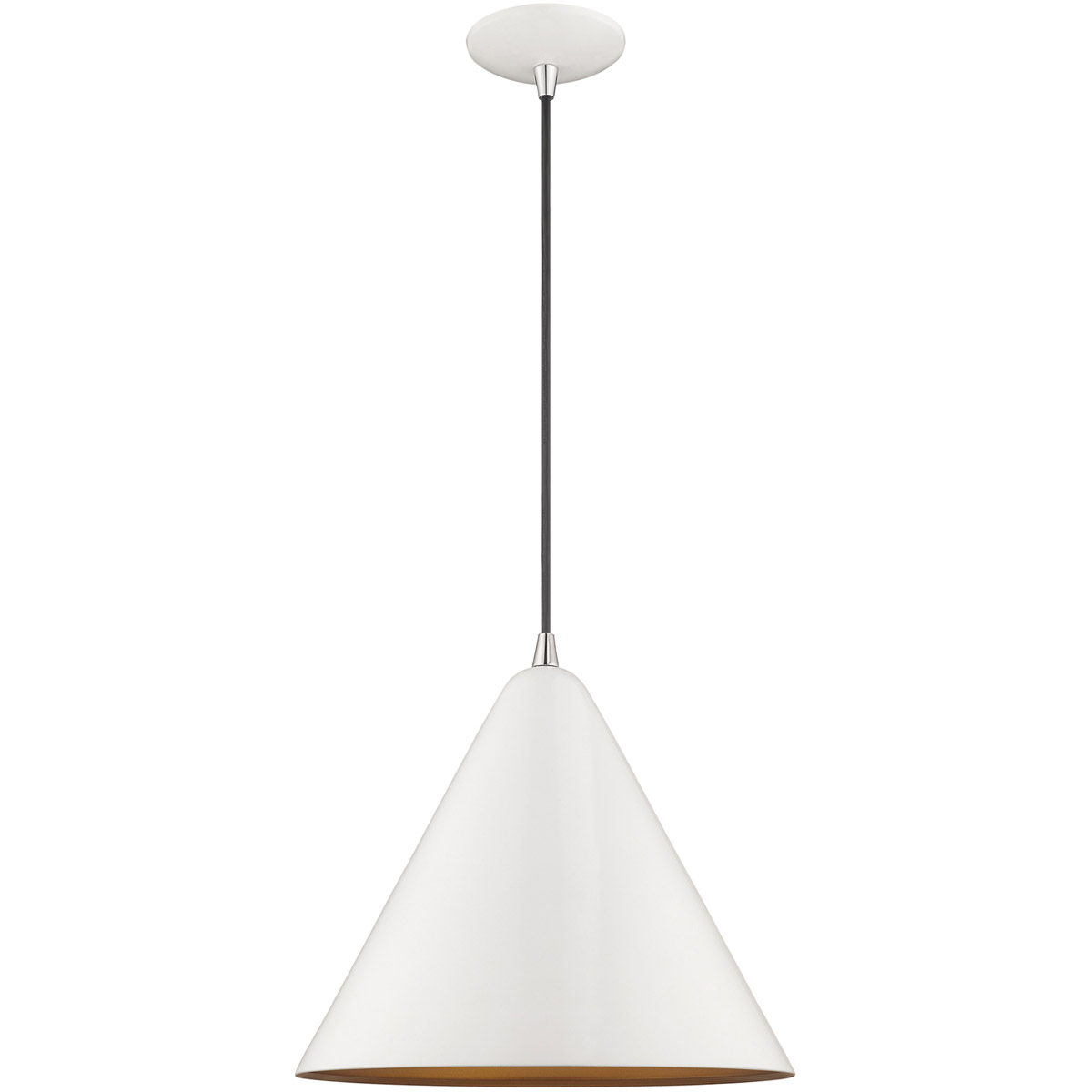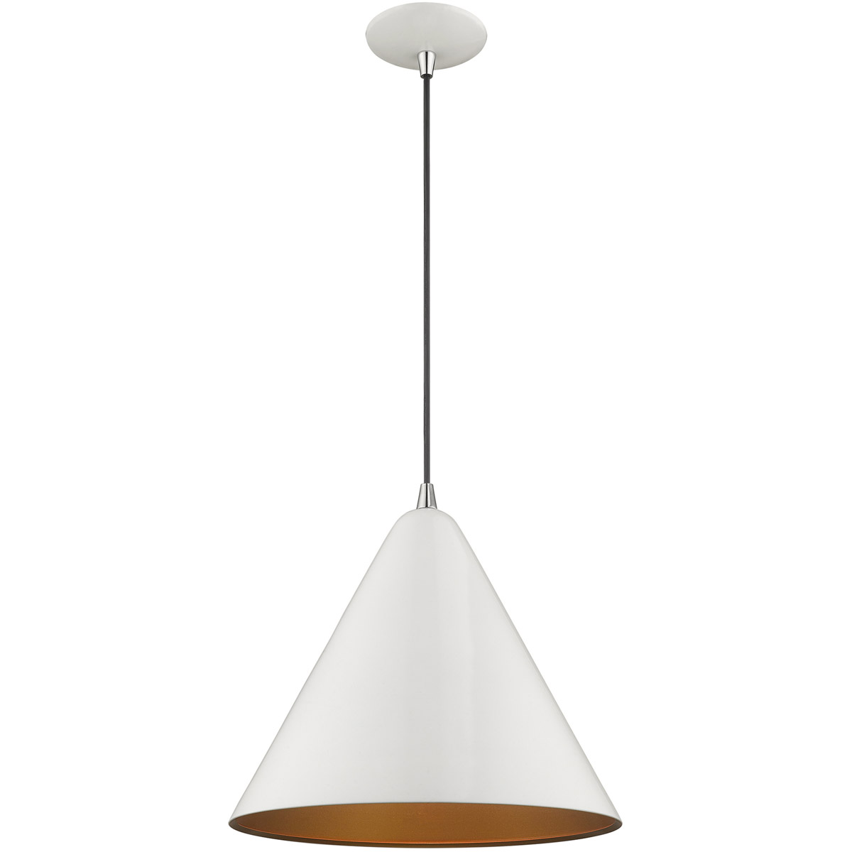 Featuring a clean and crisp modern look. This mini pendant makes a contemporary statement with the smooth cone shape of the shiny white exterior, it’s perfect above a kitchen counter. A gleaming gold finish on the interior of the metal shade brings a refined touch of style.