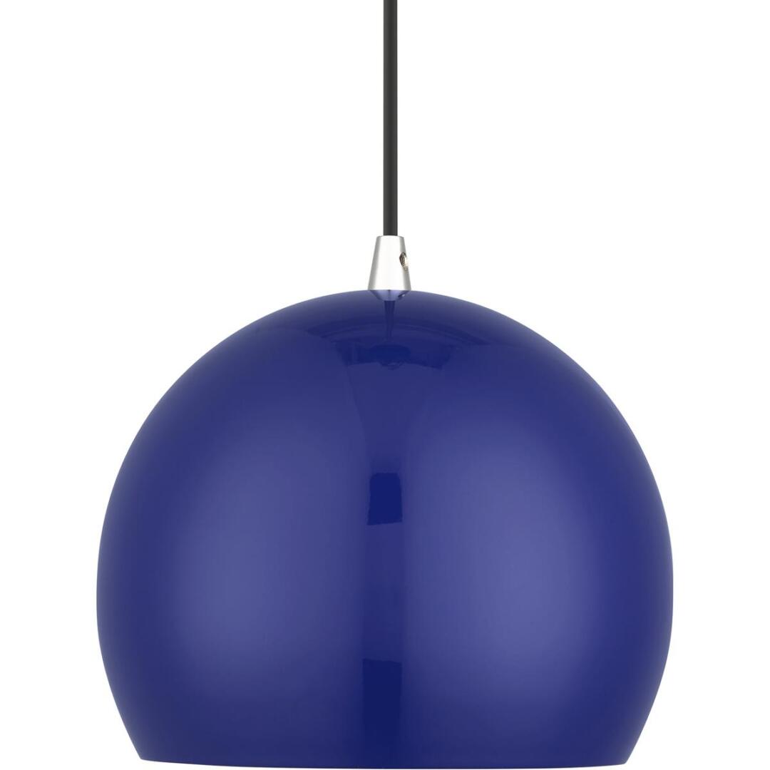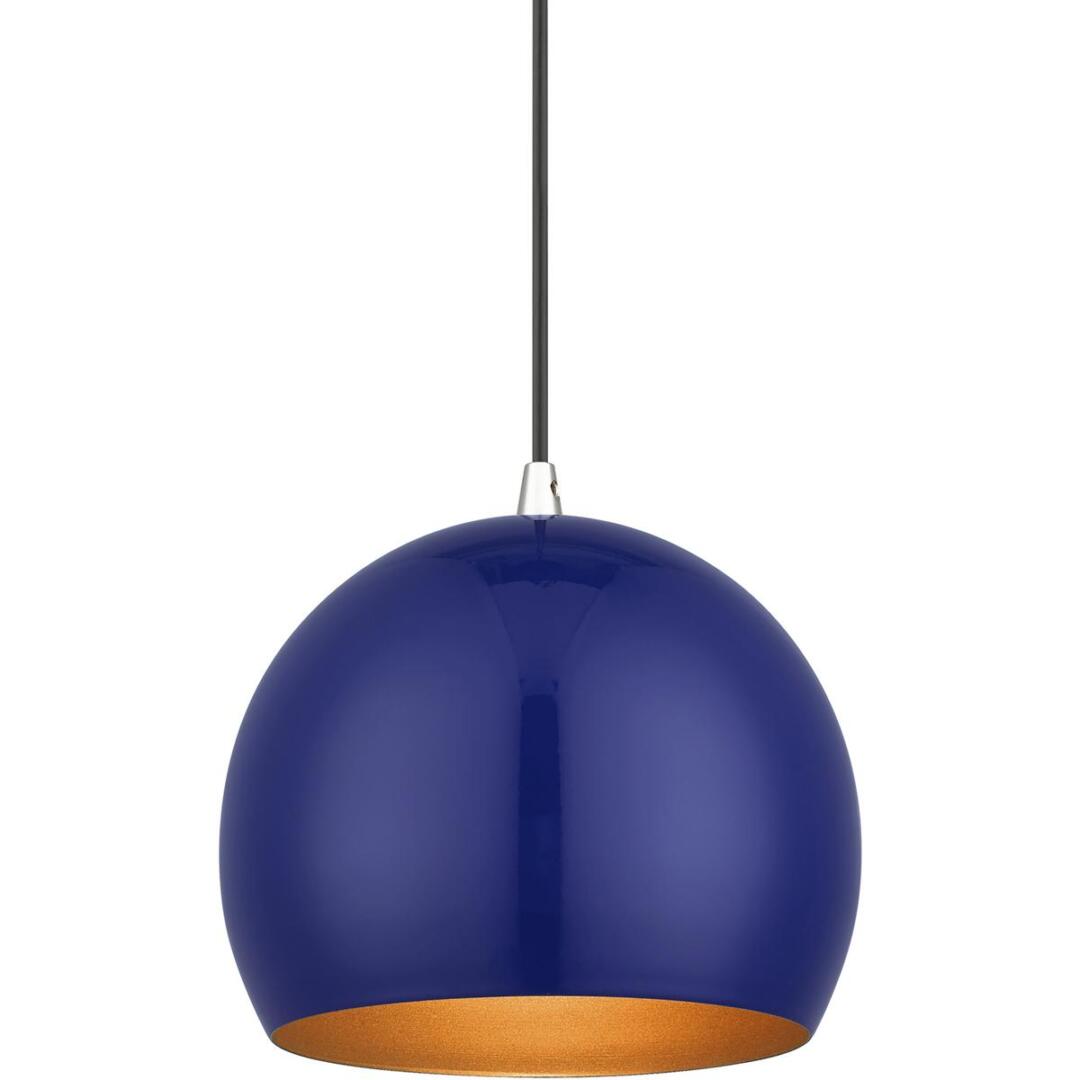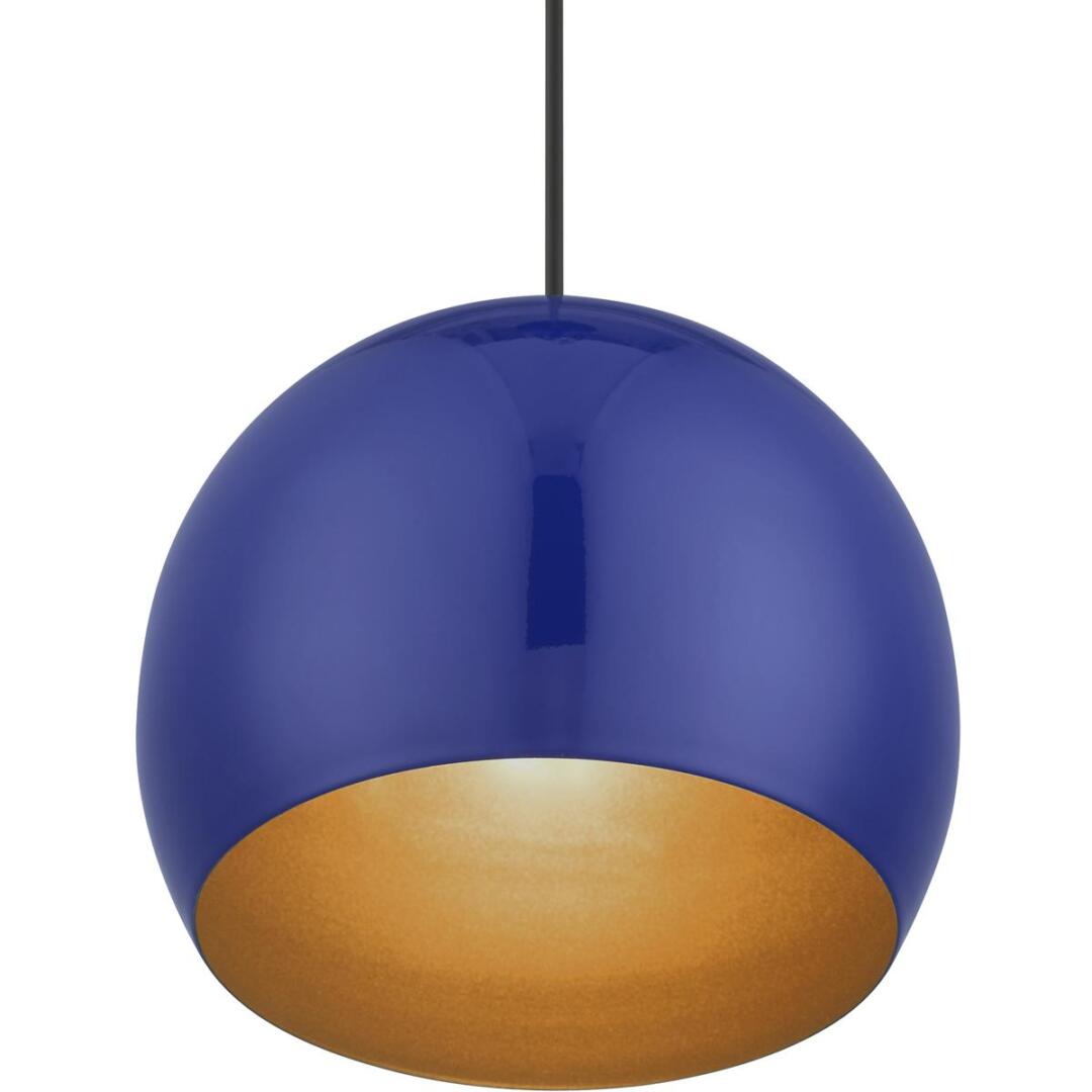 Featuring a clean and crisp modern look. This pendant makes a contemporary statement with the smooth curve of the shiny cobalt blue exterior, it’s perfect above a kitchen counter. A gleaming gold finish on the interior of the metal shade brings a refined touch of style.