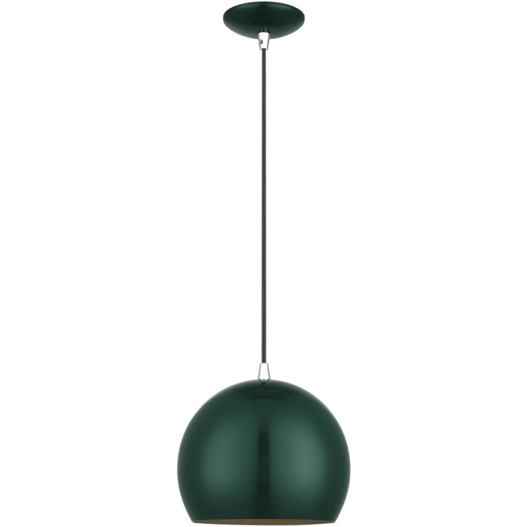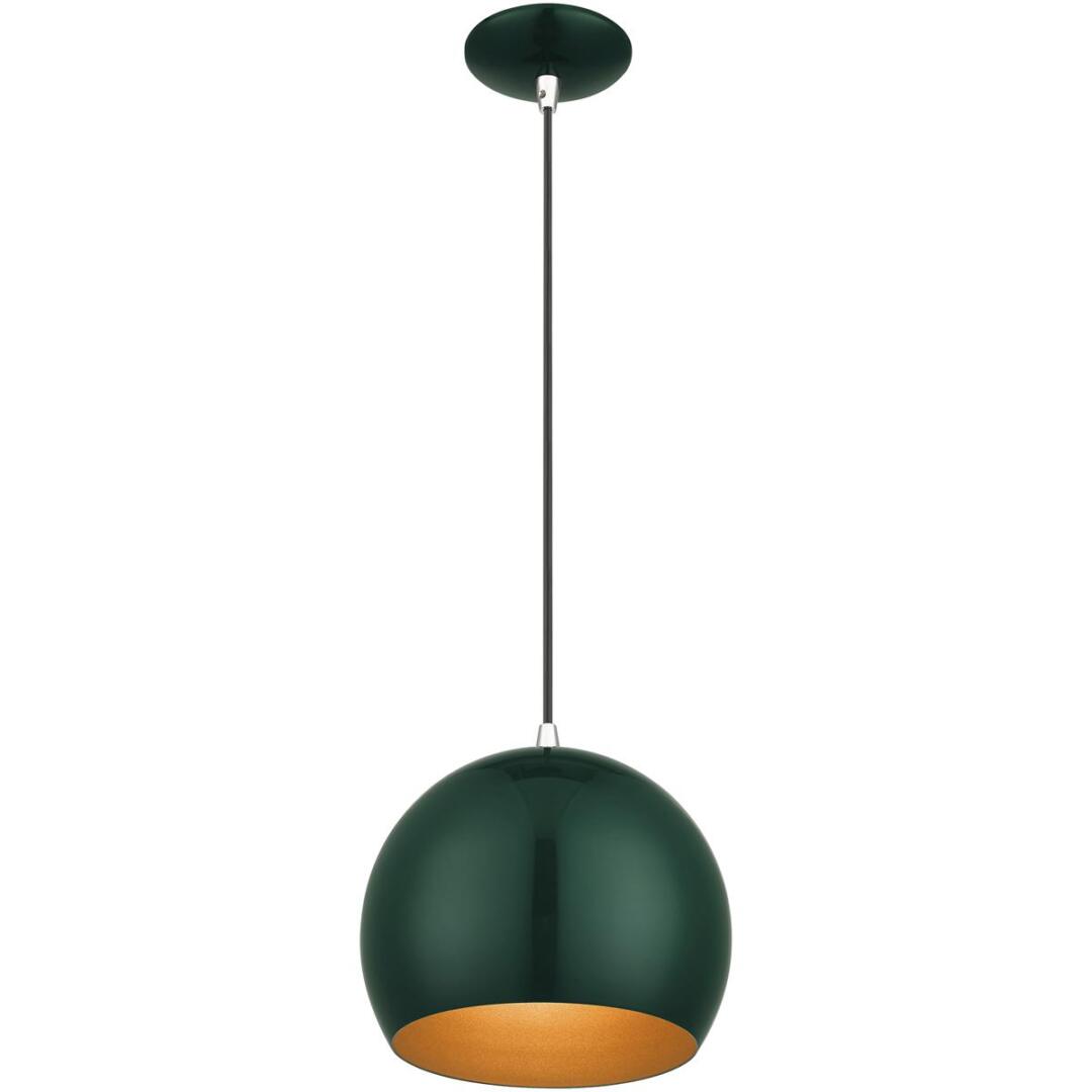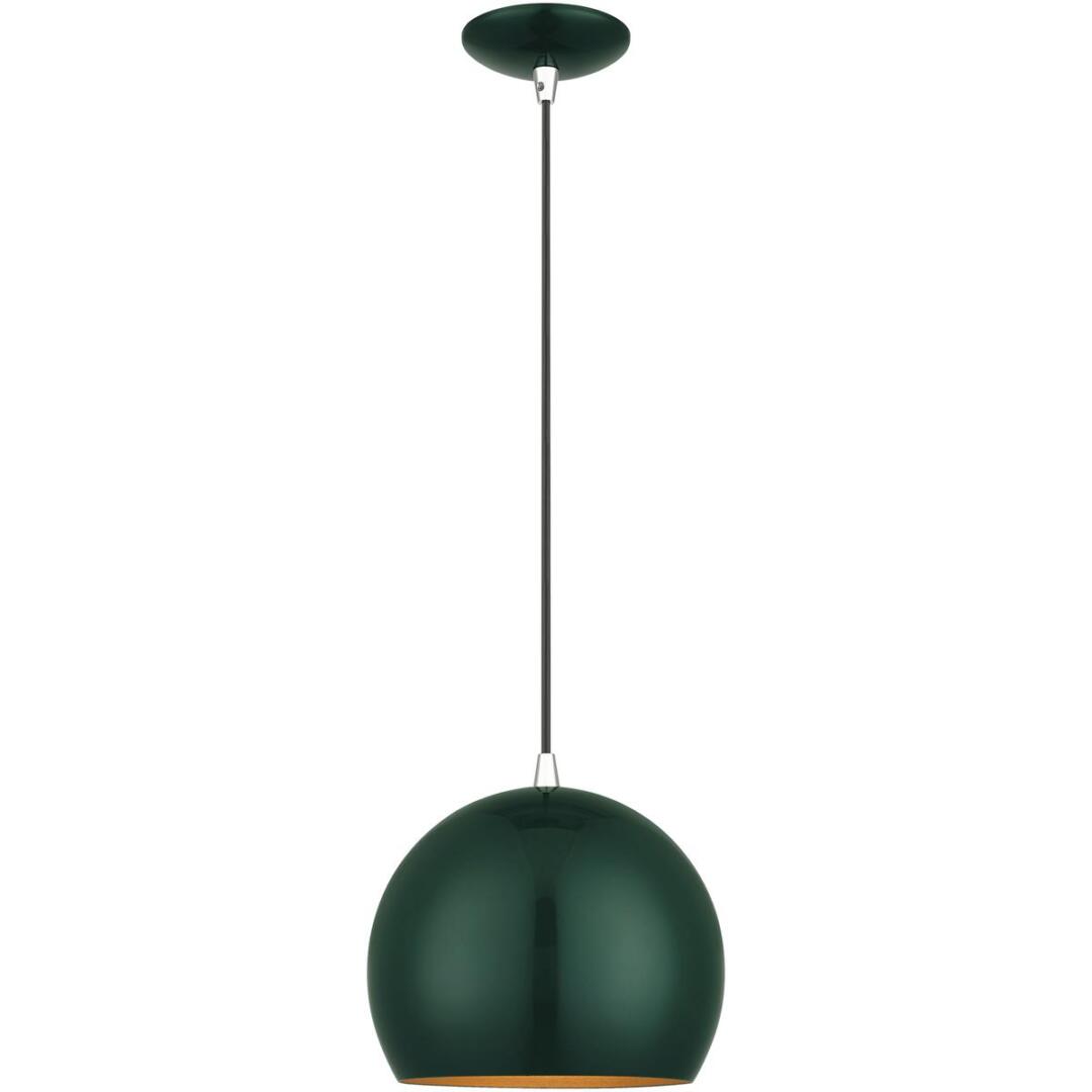 Featuring a clean and crisp modern look. This pendant makes a contemporary statement with the smooth curve of the shiny hunter green exterior, it’s perfect above a kitchen counter. A gleaming gold finish on the interior of the metal shade brings a refined touch of style.