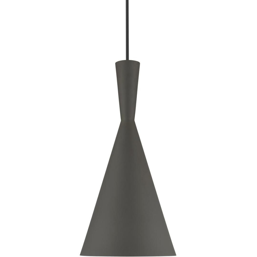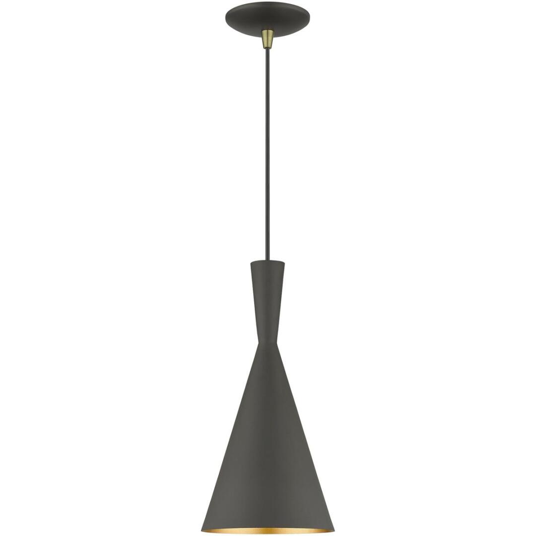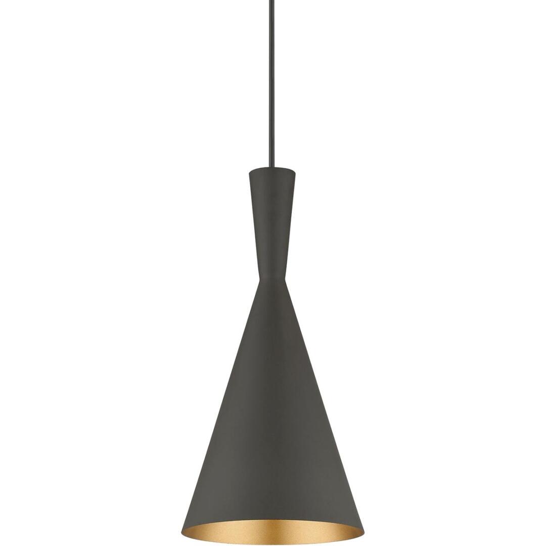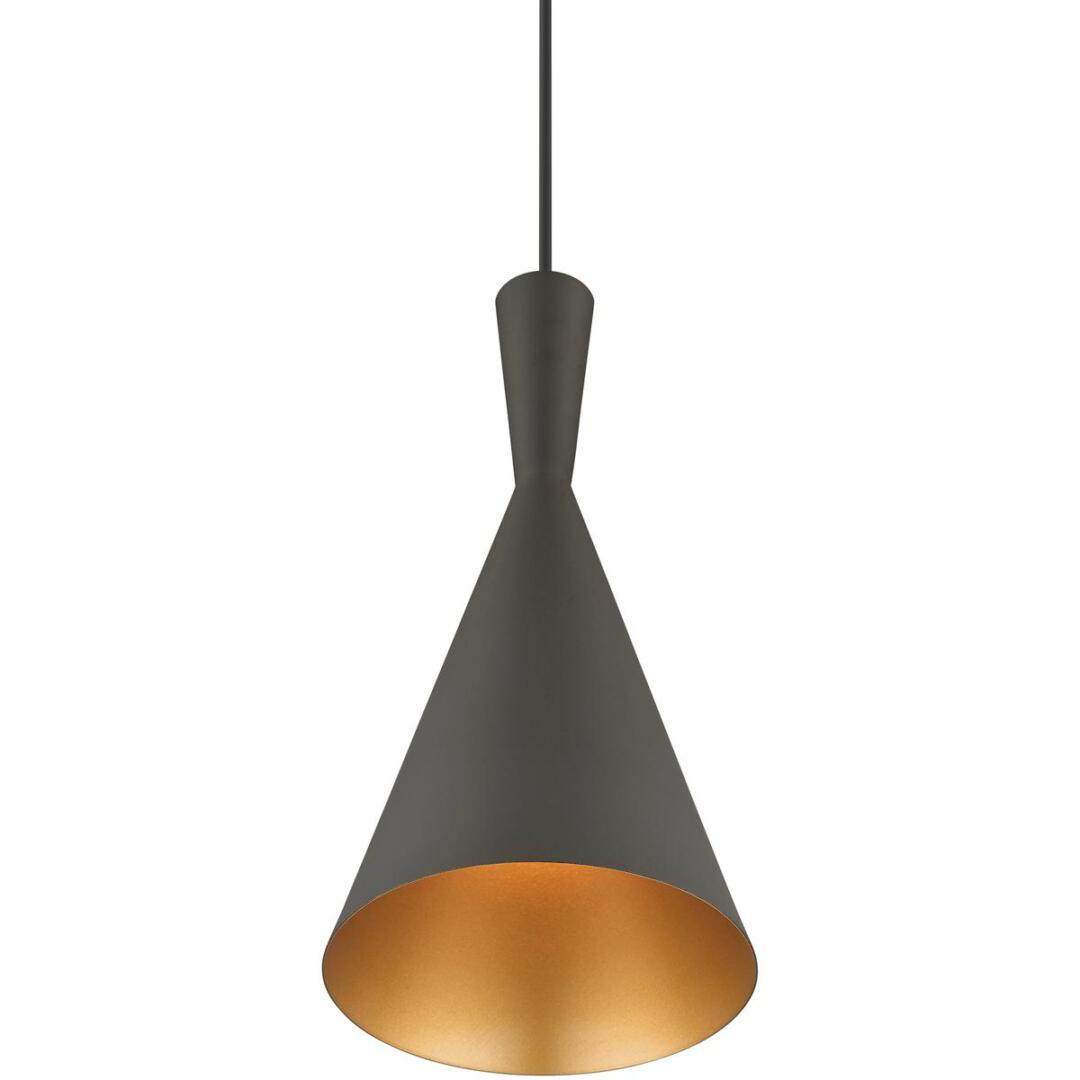 A modern double-cone shade mini pendant features a bronze finish with a gold inside and is adaptable to a range of décor styles.