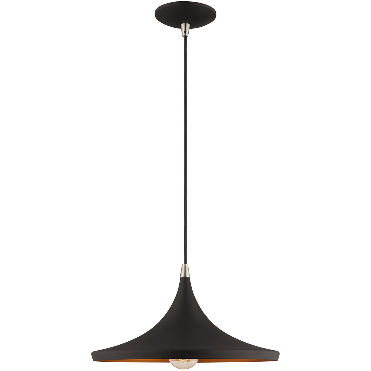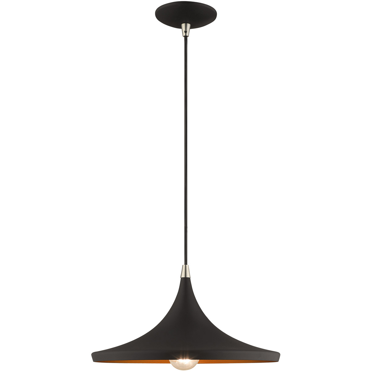 Combining a black color with a gold finish inside, this mid century modern mini pendant light will illuminate contemporary decor beautifully. Ideal above a kitchen island or entryway, this design features a wide disc shape complementing the contemporary look.