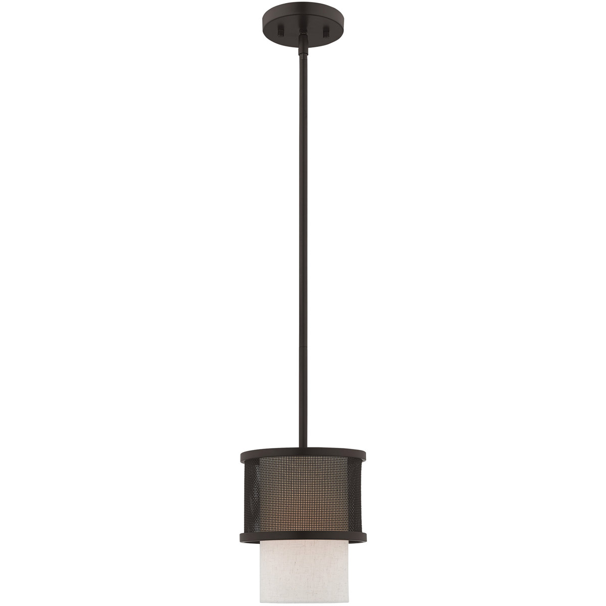 Elevate your modern living area with this urban bronze mini pendant featuring a hand crafted hardback oatmeal fabric shade cloaked in stainless steel mesh outer shade.