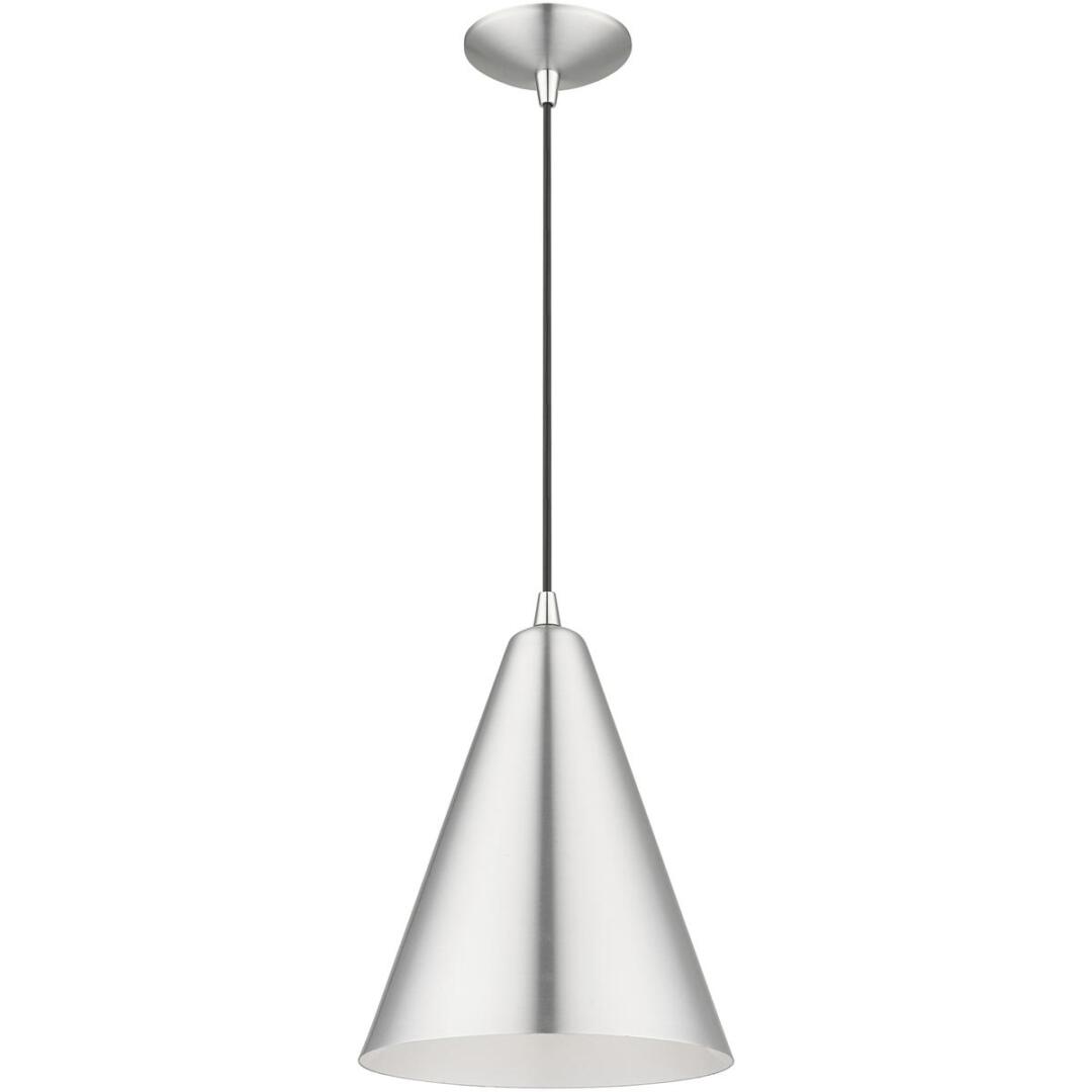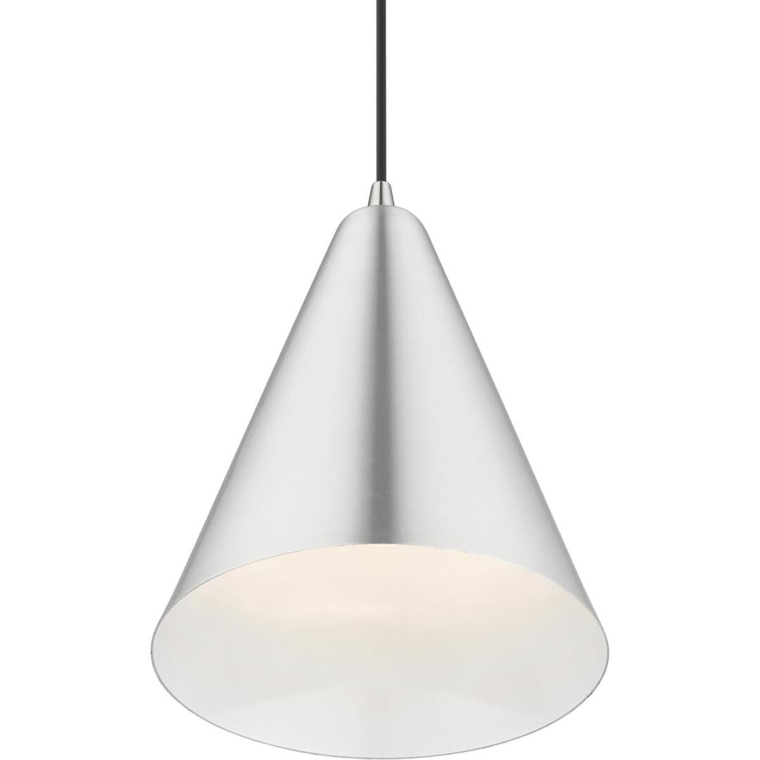 Featuring a clean and crisp modern look. This pendant makes a contemporary statement with the smooth cone shape of the brushed aluminum exterior, it’s perfect above a kitchen counter. A gleaming shiny white finish on the interior of the metal shade brings a refined touch of style.