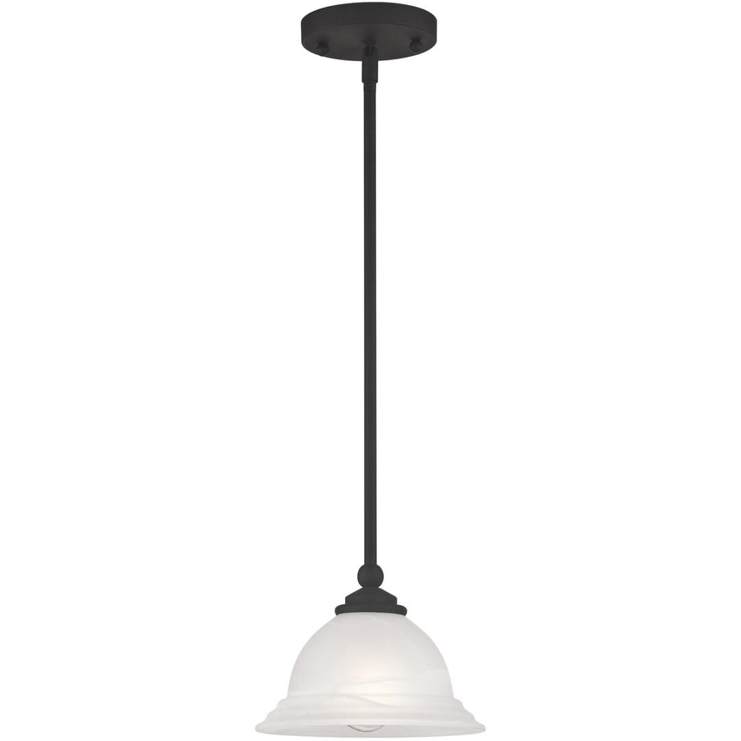 This mini pendant adds a clean, transitional, luminance to your decor. The black finish contrasts with white alabaster glass resulting in a distinctive lighting accent.
