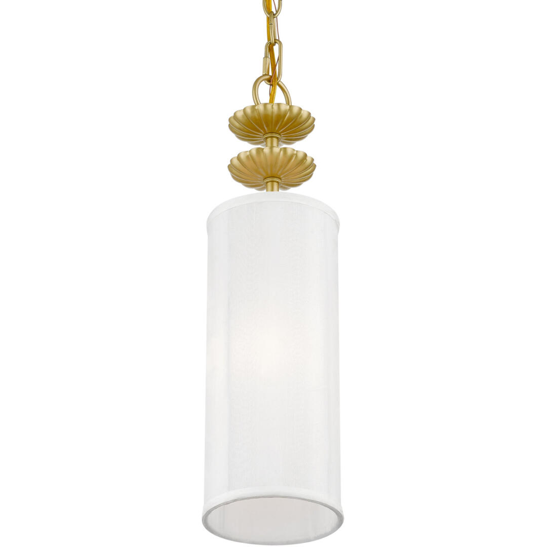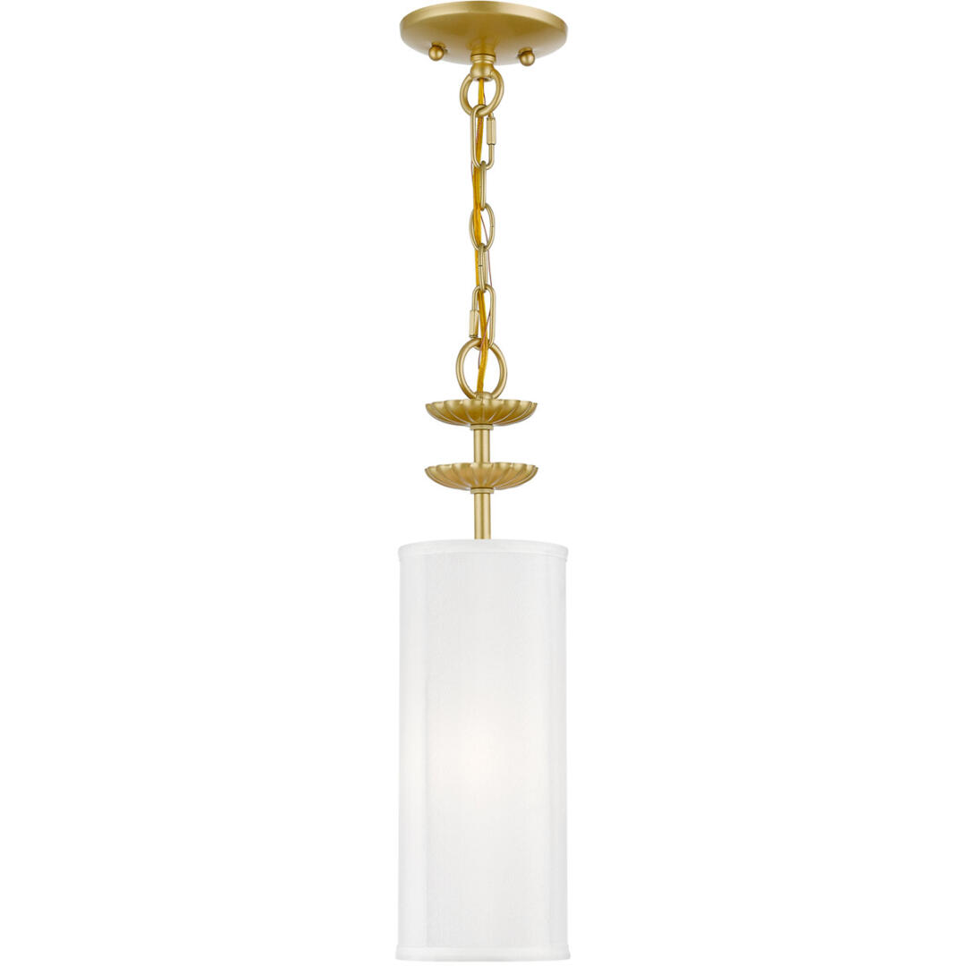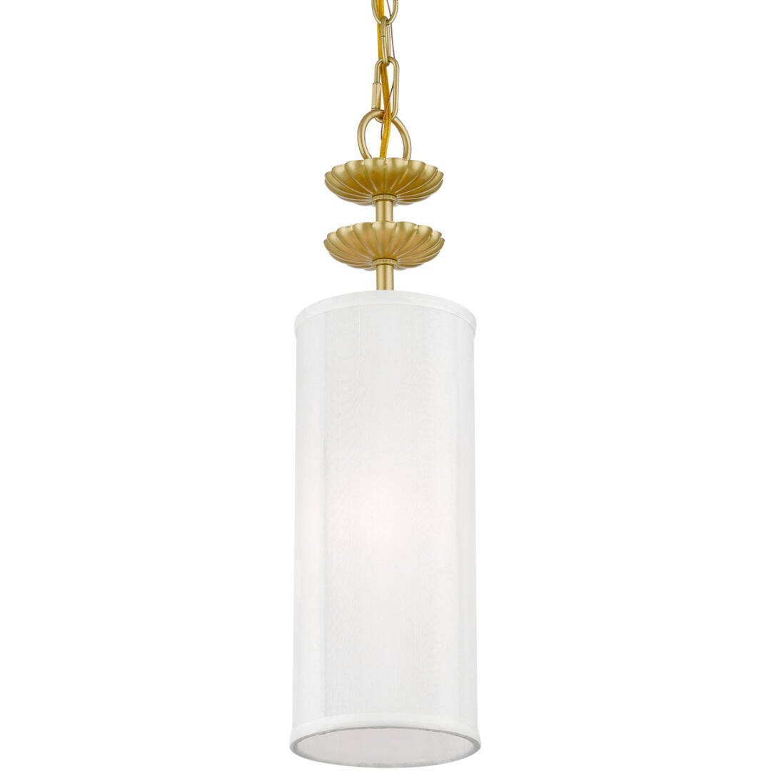 The single light soft gold finish Brookdale mini pendant combines floral details and casual elements to create an updated look. The hand-crafted off-white fabric hardback drum shade is set off by an inner silky white fabric which creates a versatile effect.
