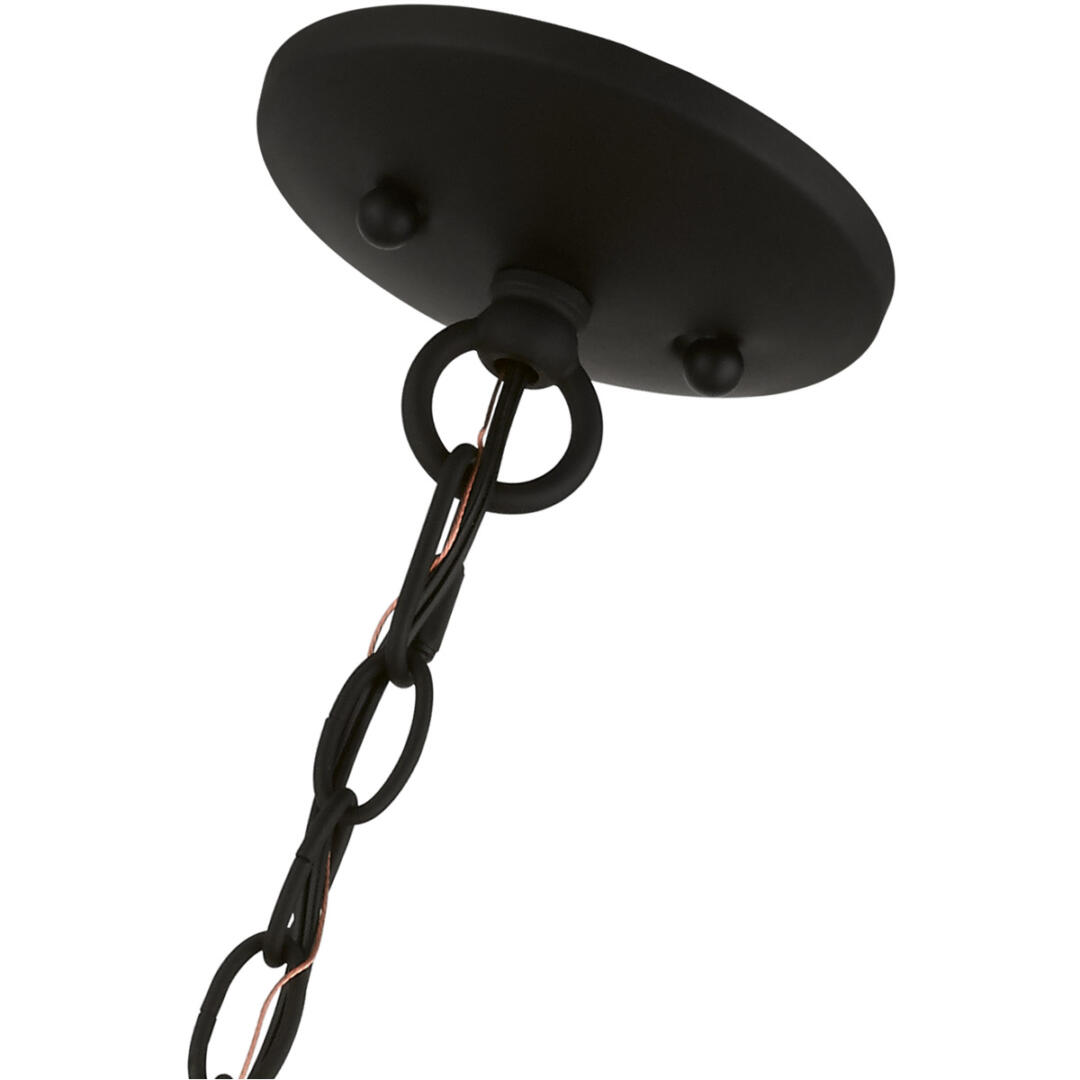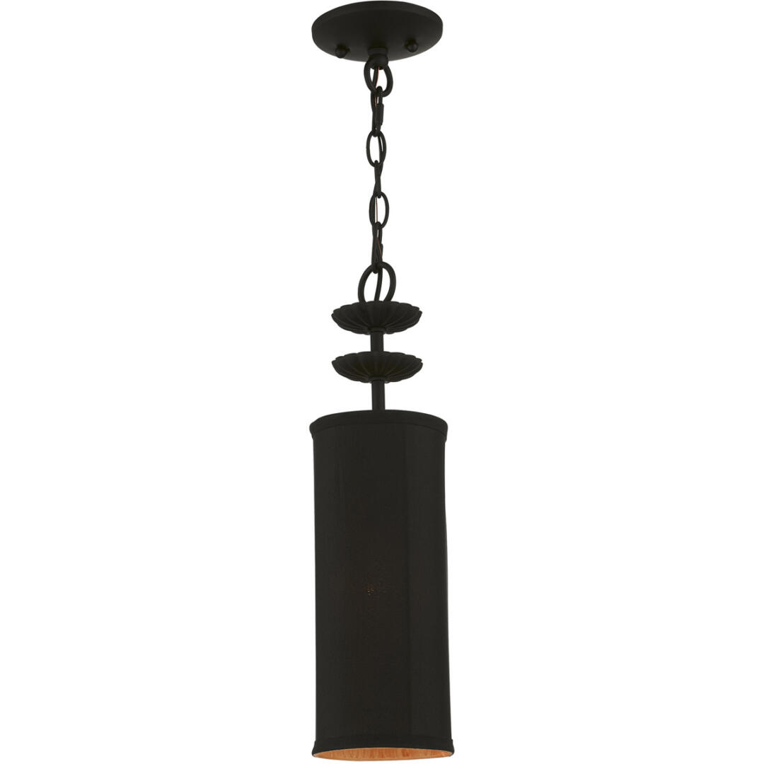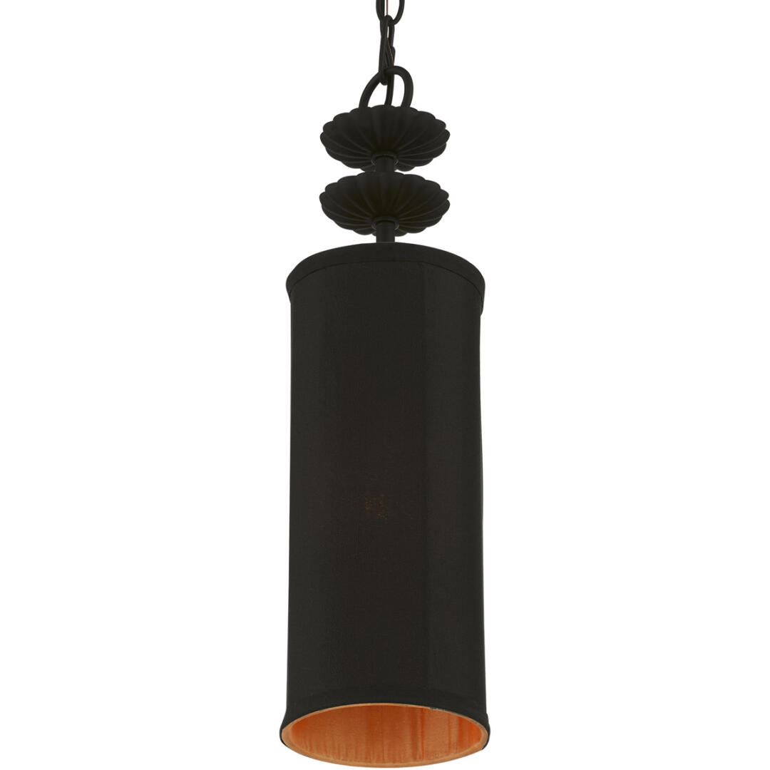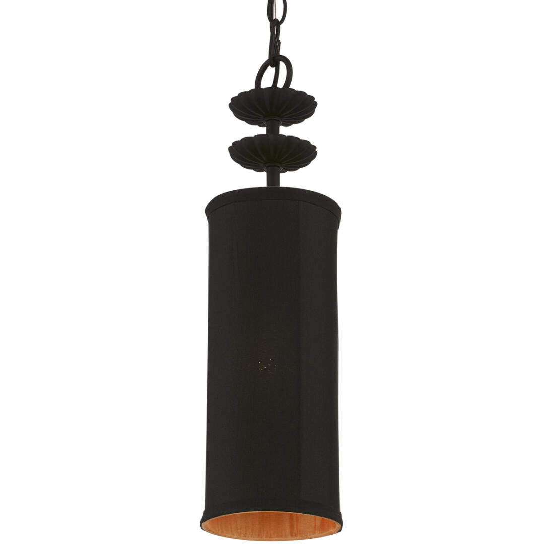 The single light black finish Winchester mini pendant combines floral details and casual elements to create an updated look. The hand-crafted black fabric hardback drum shade is set off by an inner silky orange fabric which creates a versatile effect.