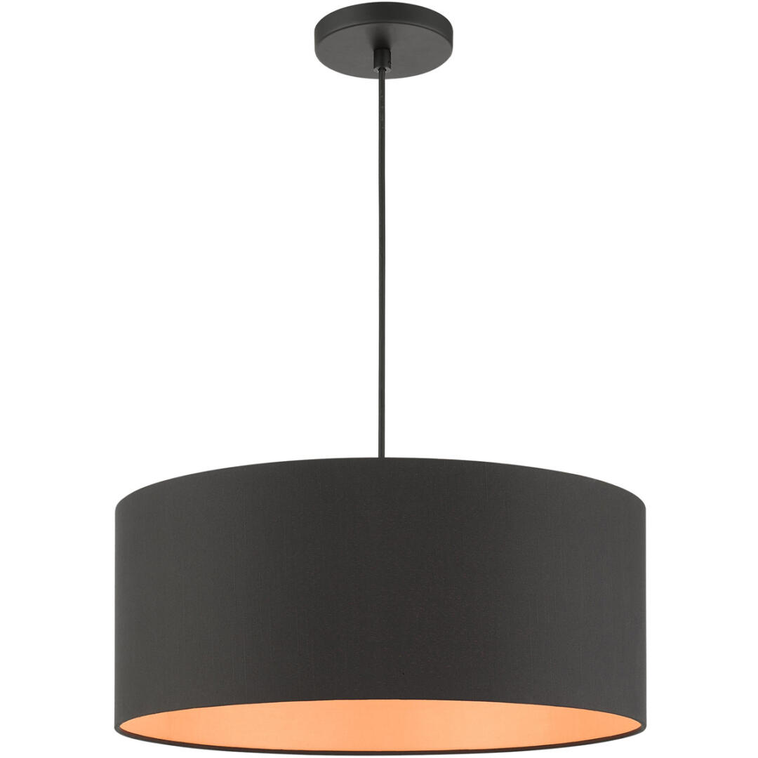 The Sentosa collection has a modern and retro appeal. The hand-crafted black fabric hardback shade is set off by the silky orange fabric on the inside creating an intriguing effect. The three-light drum shade adds character to this handsomely styled pendant. Perfect fit for the living room, dining room, kitchen and bedroom. This sleek design is shown in a black finish.